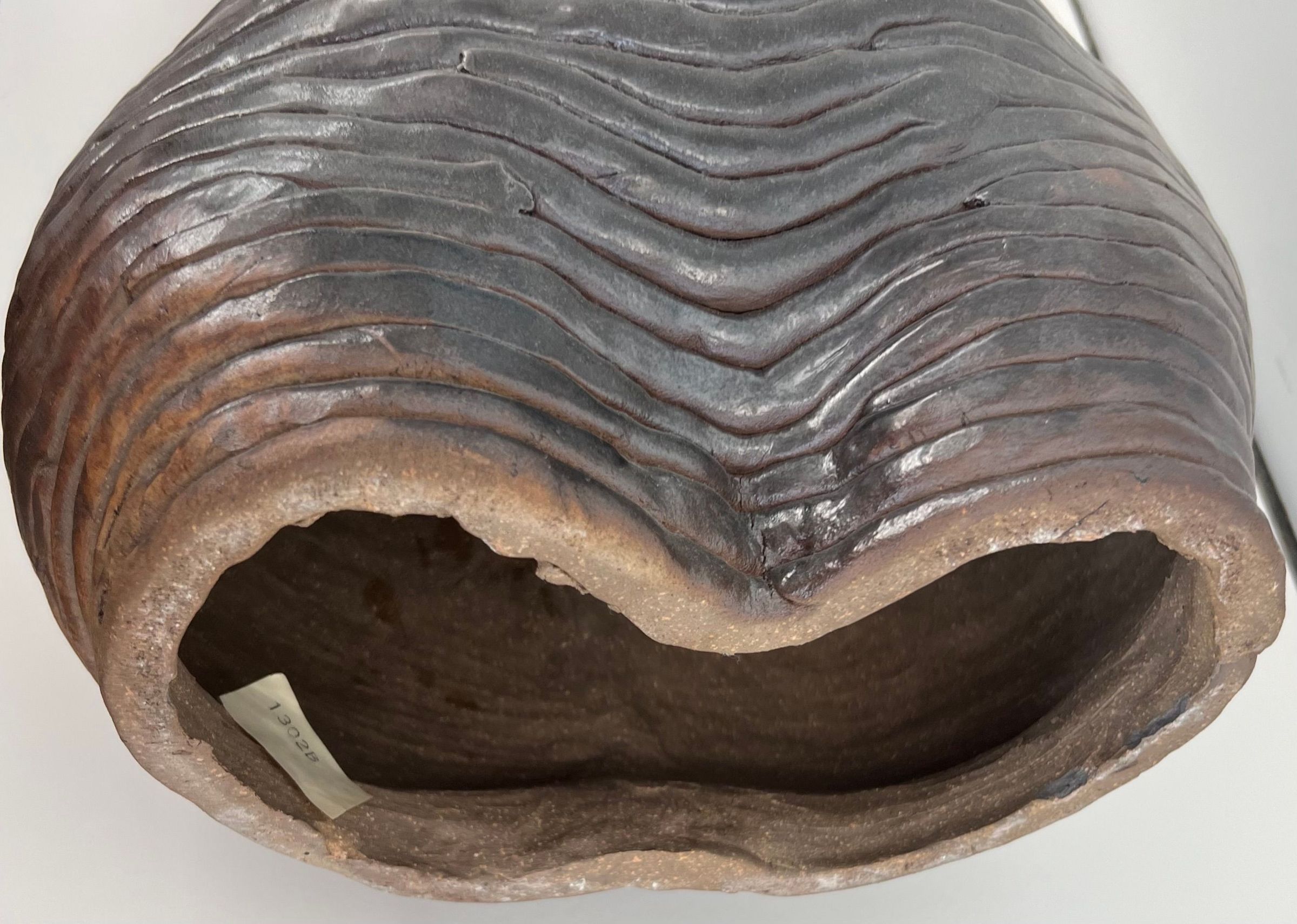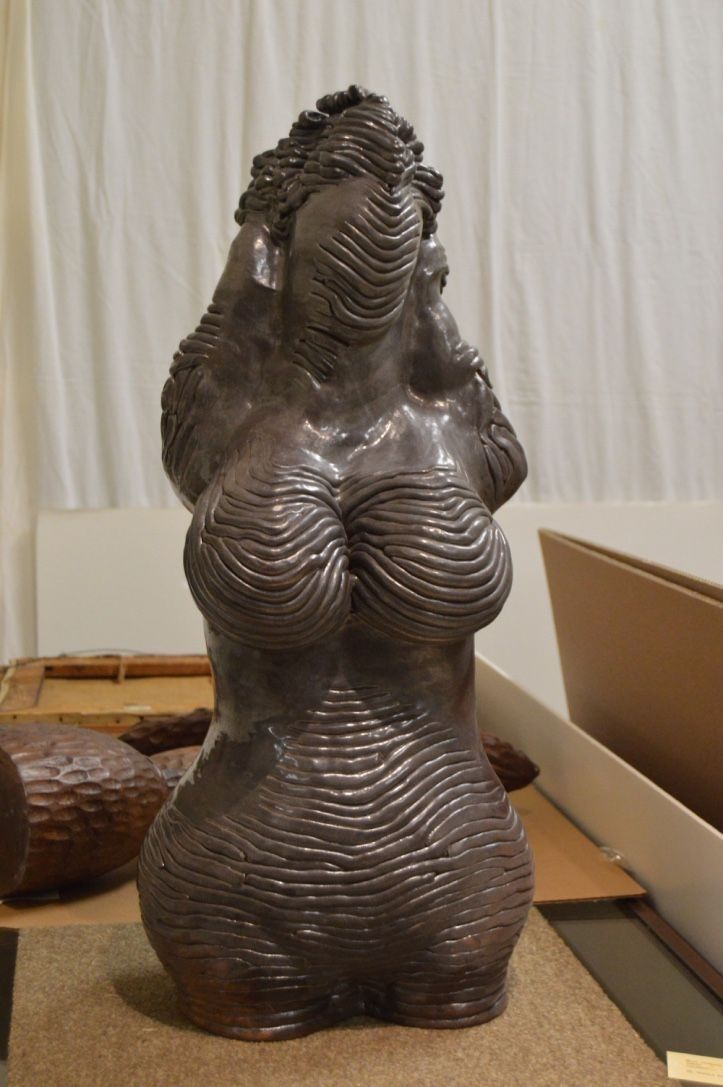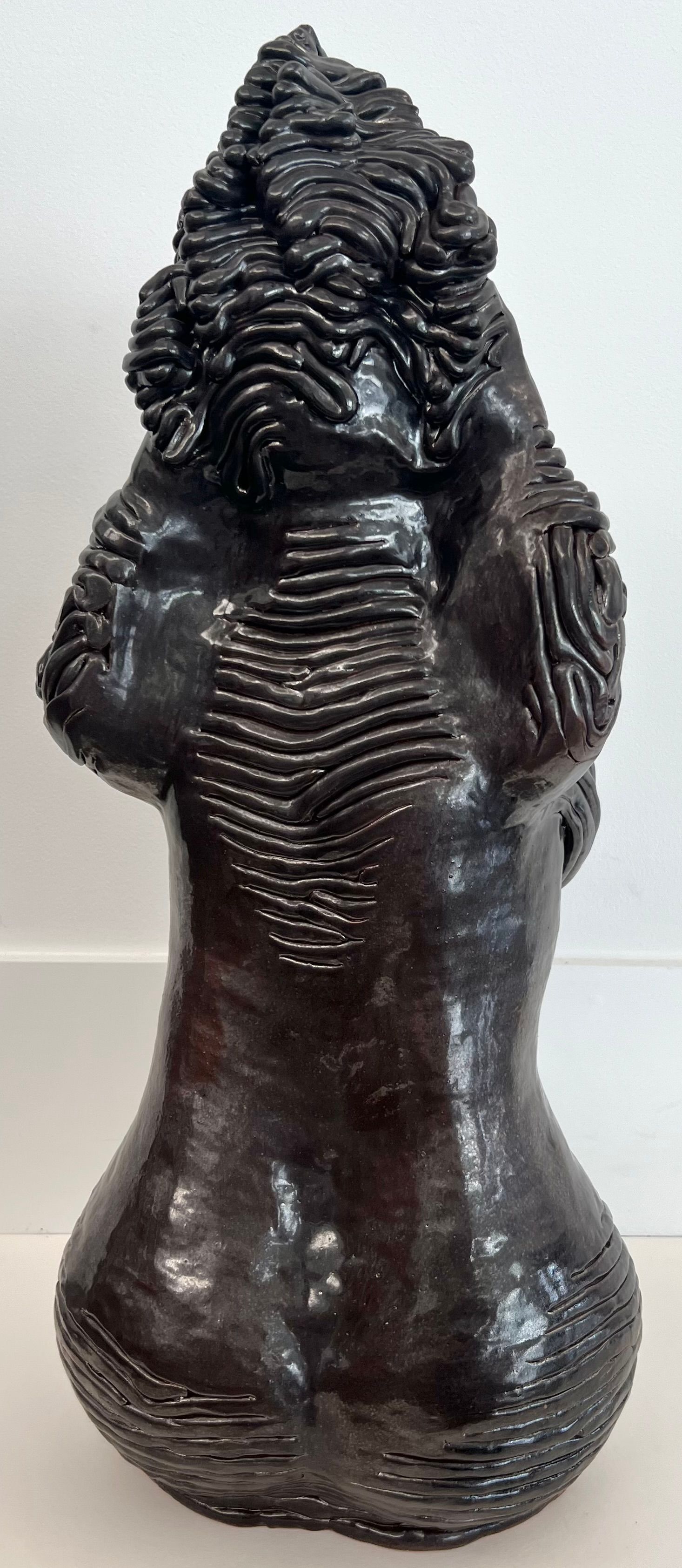 Torso and head of woman-linear marigation of metal adds texture-hands are raised to head. Hollow interior. Grey-black finish.Dimensions
