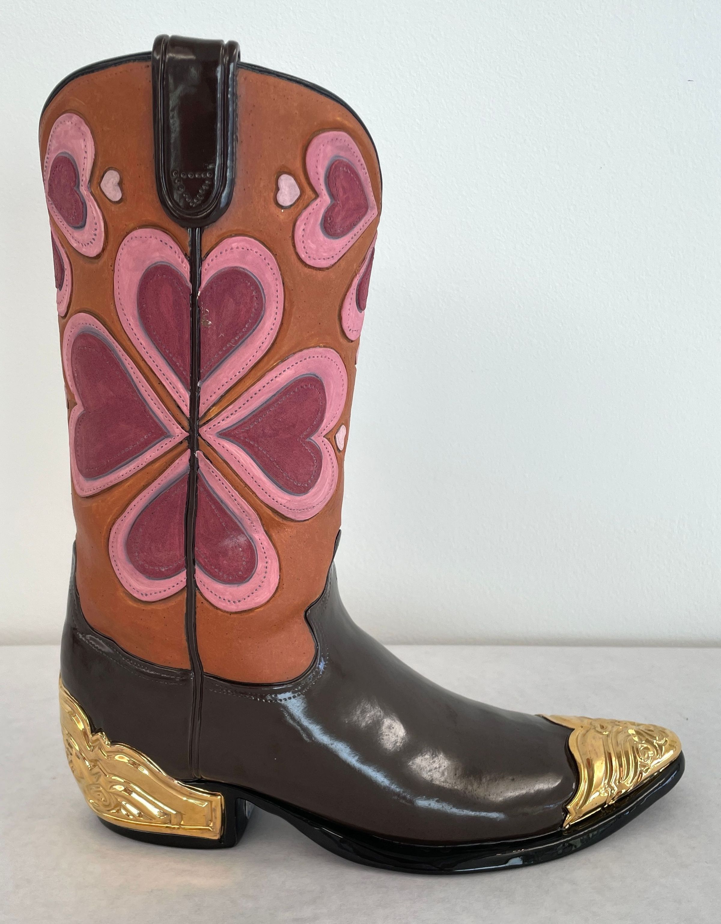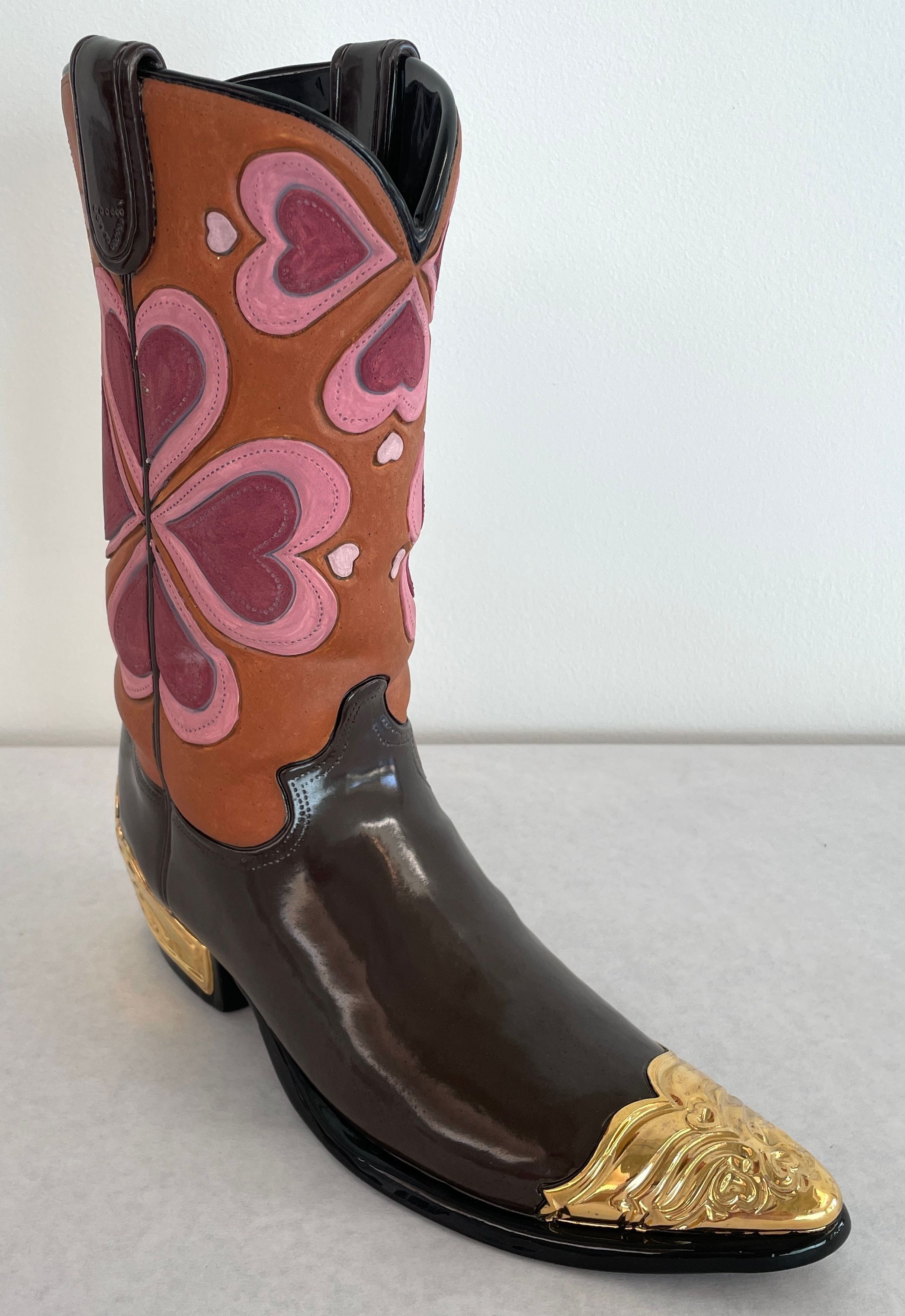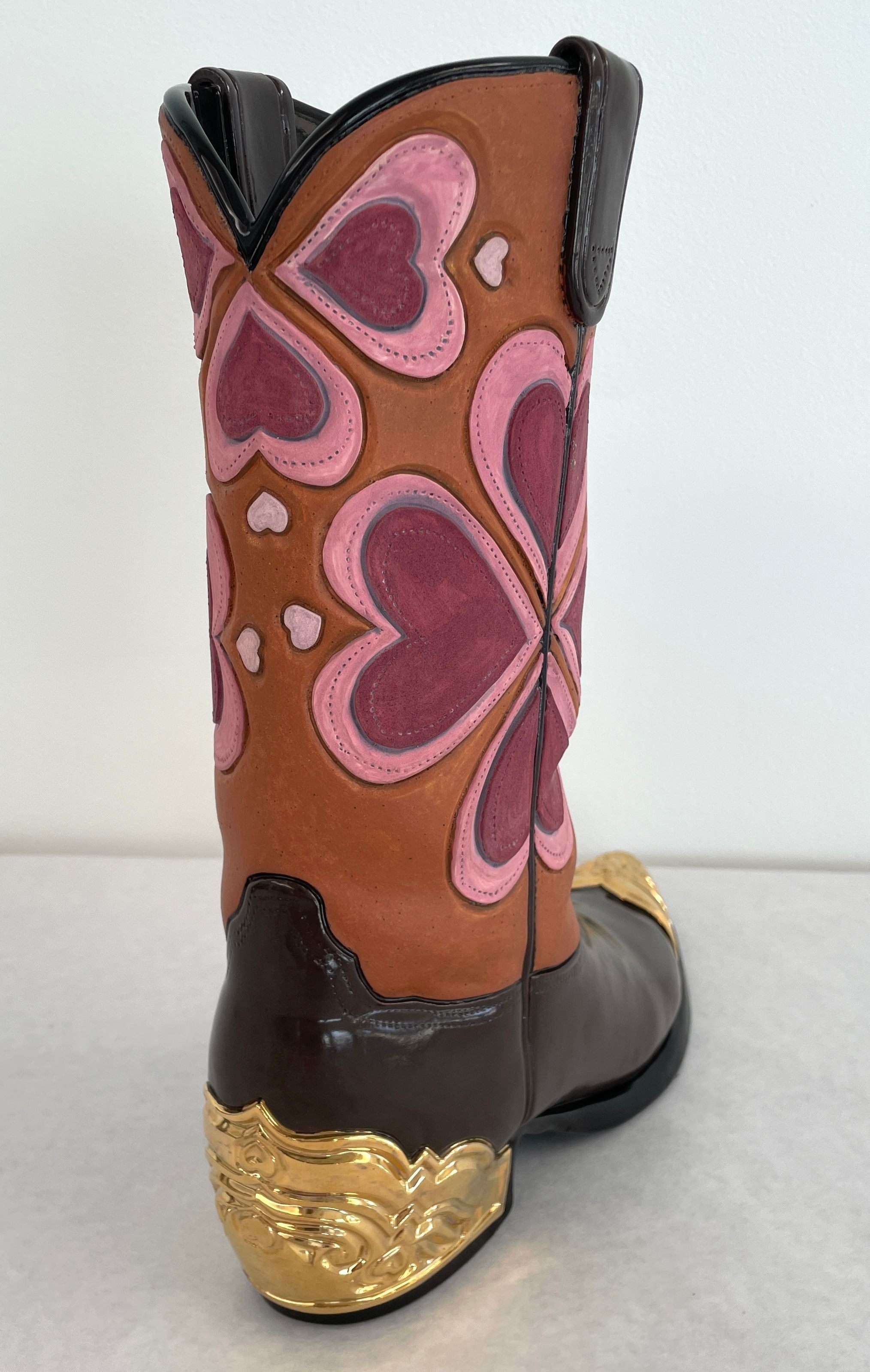 Ceramic cowboy boot, heel and toe trimmed with gold. Bottom leather is dark brown, tipper "leather" brown and pink and red heart shapes. Colored twine acts as accent between upper and lower portion.Collection
