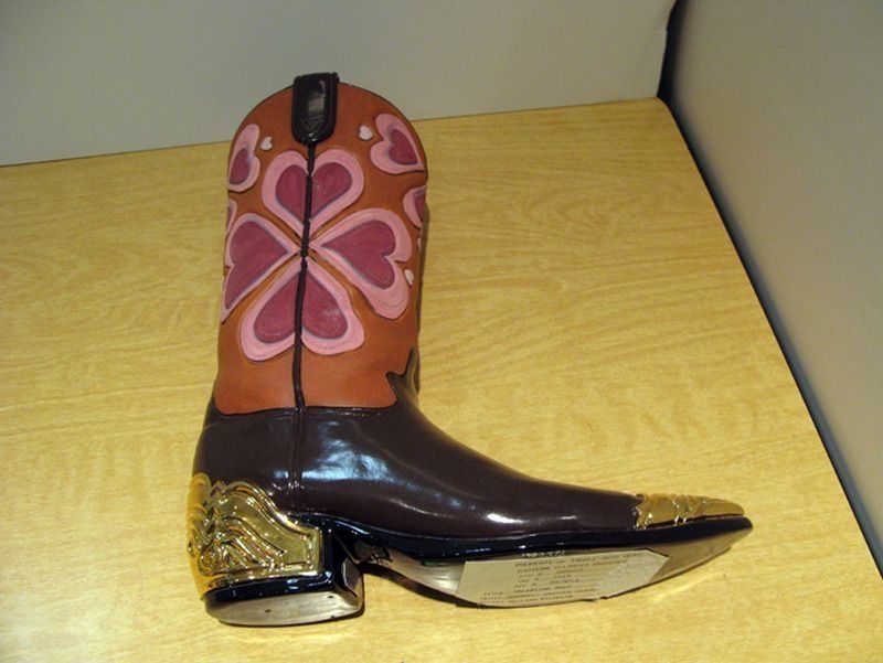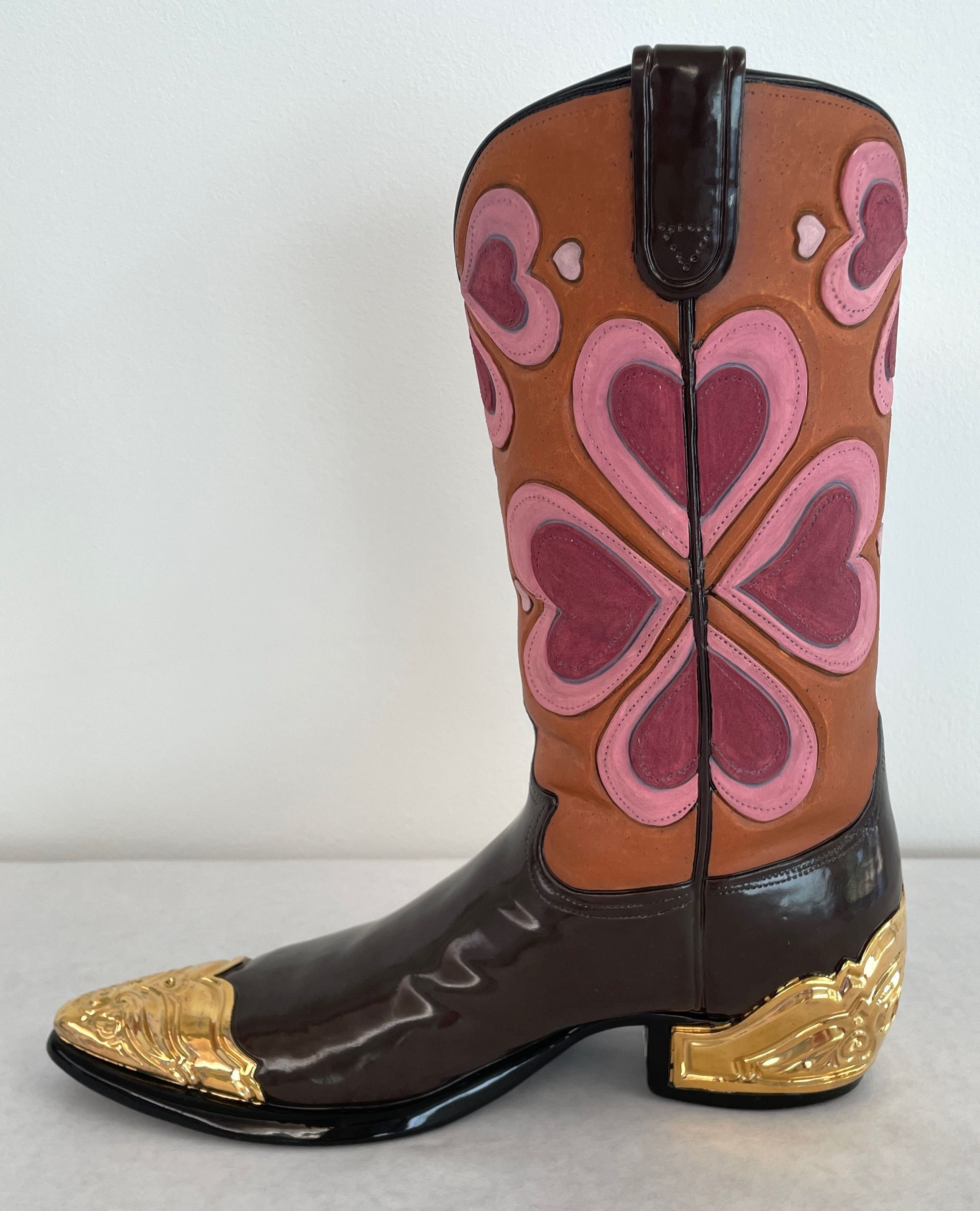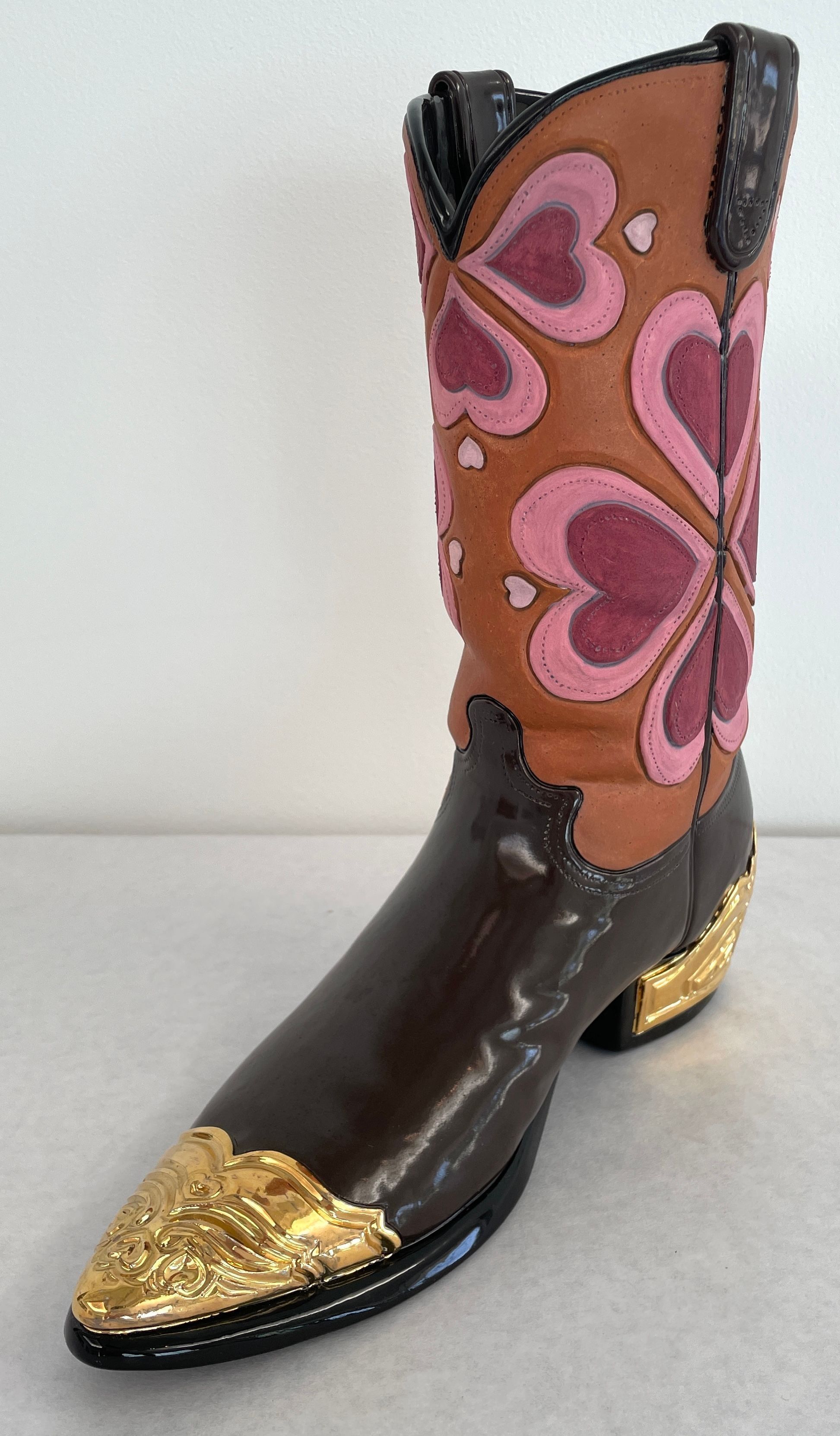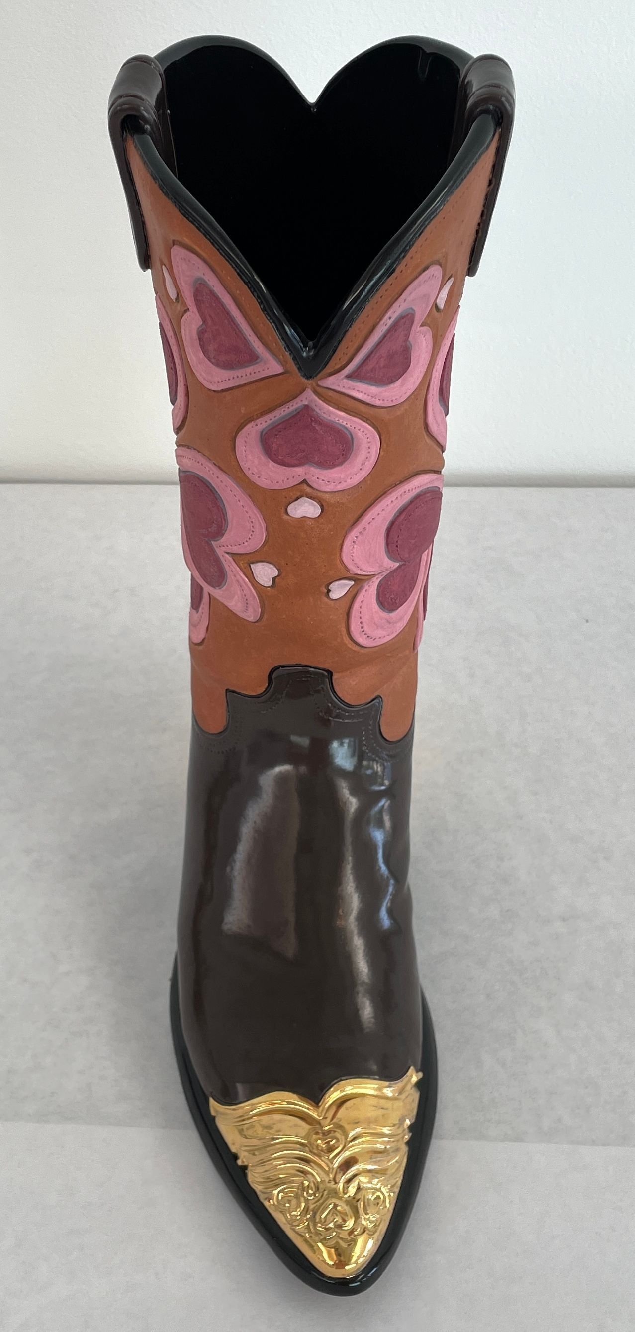 Ceramic cowboy boot, heel and toe trimmed with gold. Bottom leather is dark brown, tipper "leather" brown and pink and red heart shapes. Colored twine acts as accent between upper and lower portion.Collection