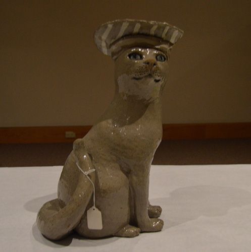 Glaze has large cracks several places. Grey clay beret shape with white strips- fake stitches around brim.Collection