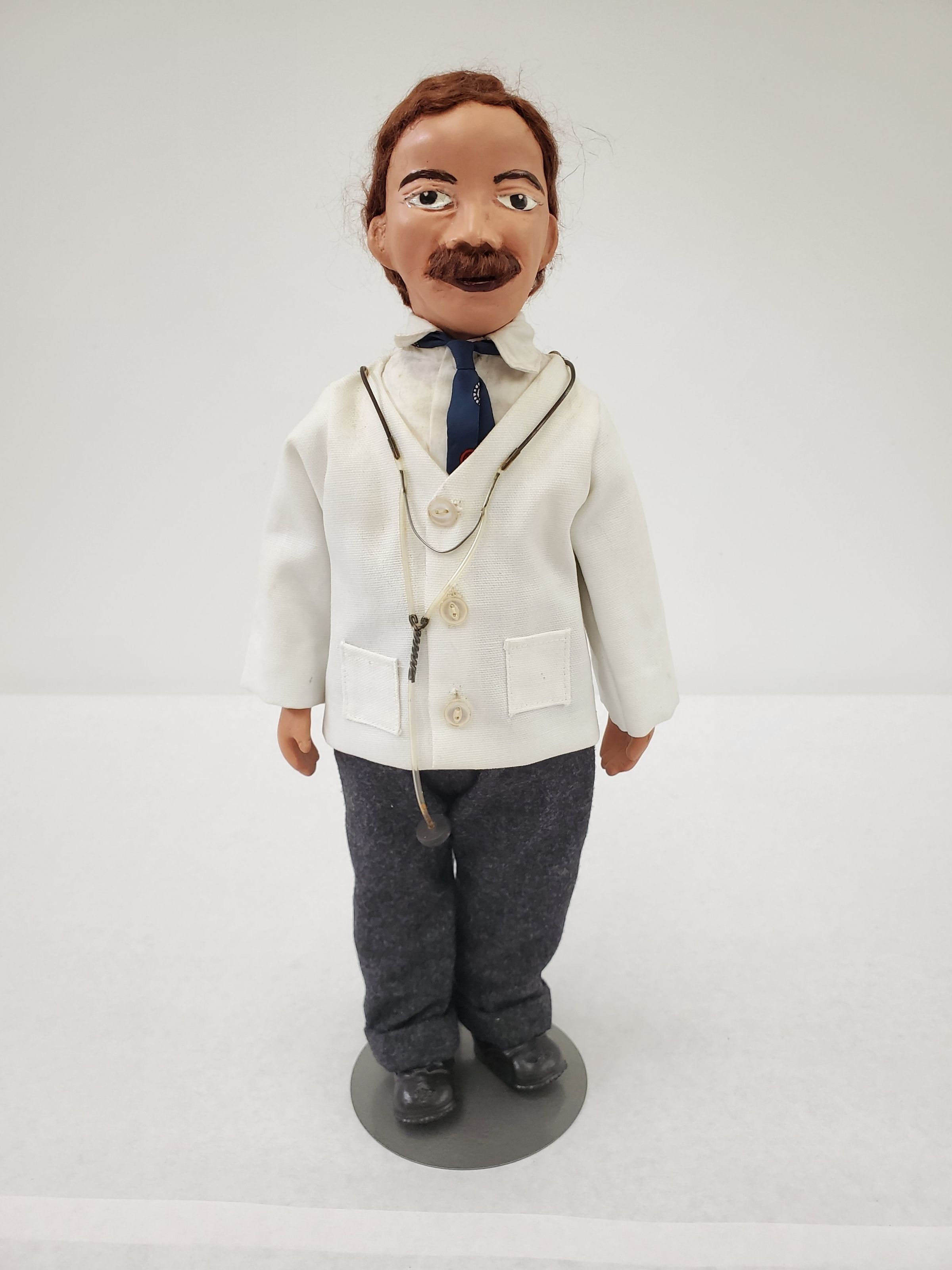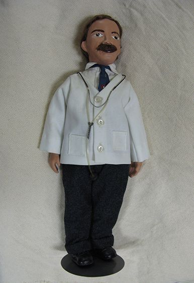 A doll on metal stand with a physician's overcoat, white cotton collared shirt, blue tie, dark grey cuffed wool pants, and black shoes with stethoscope. Doll represents Dr. Daniel Hale Williams.Collection