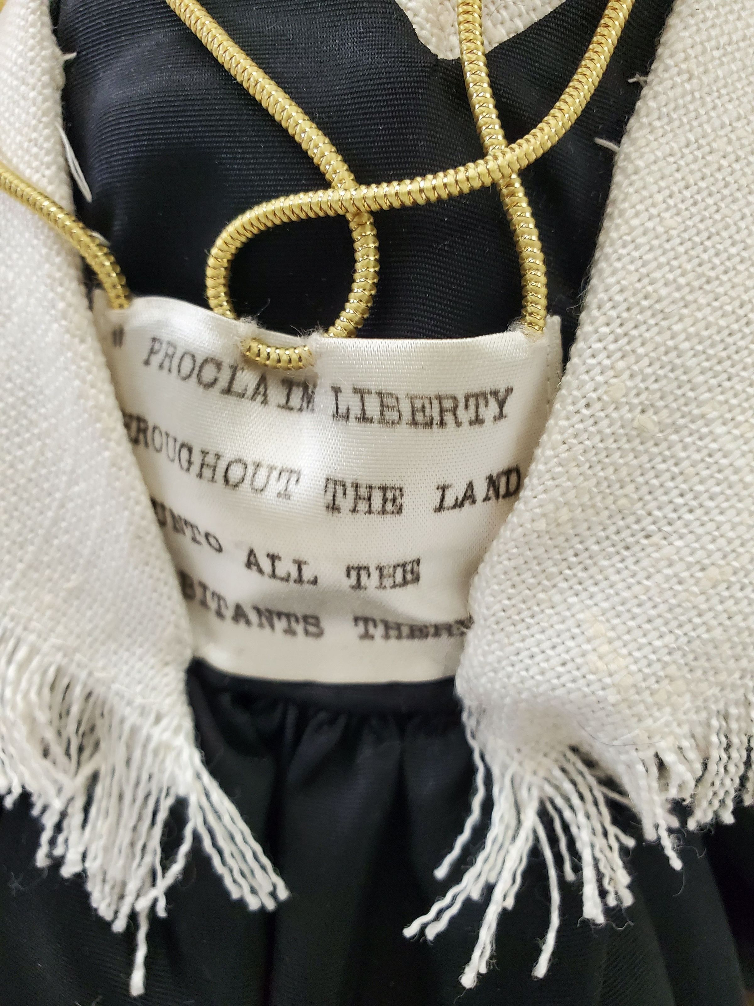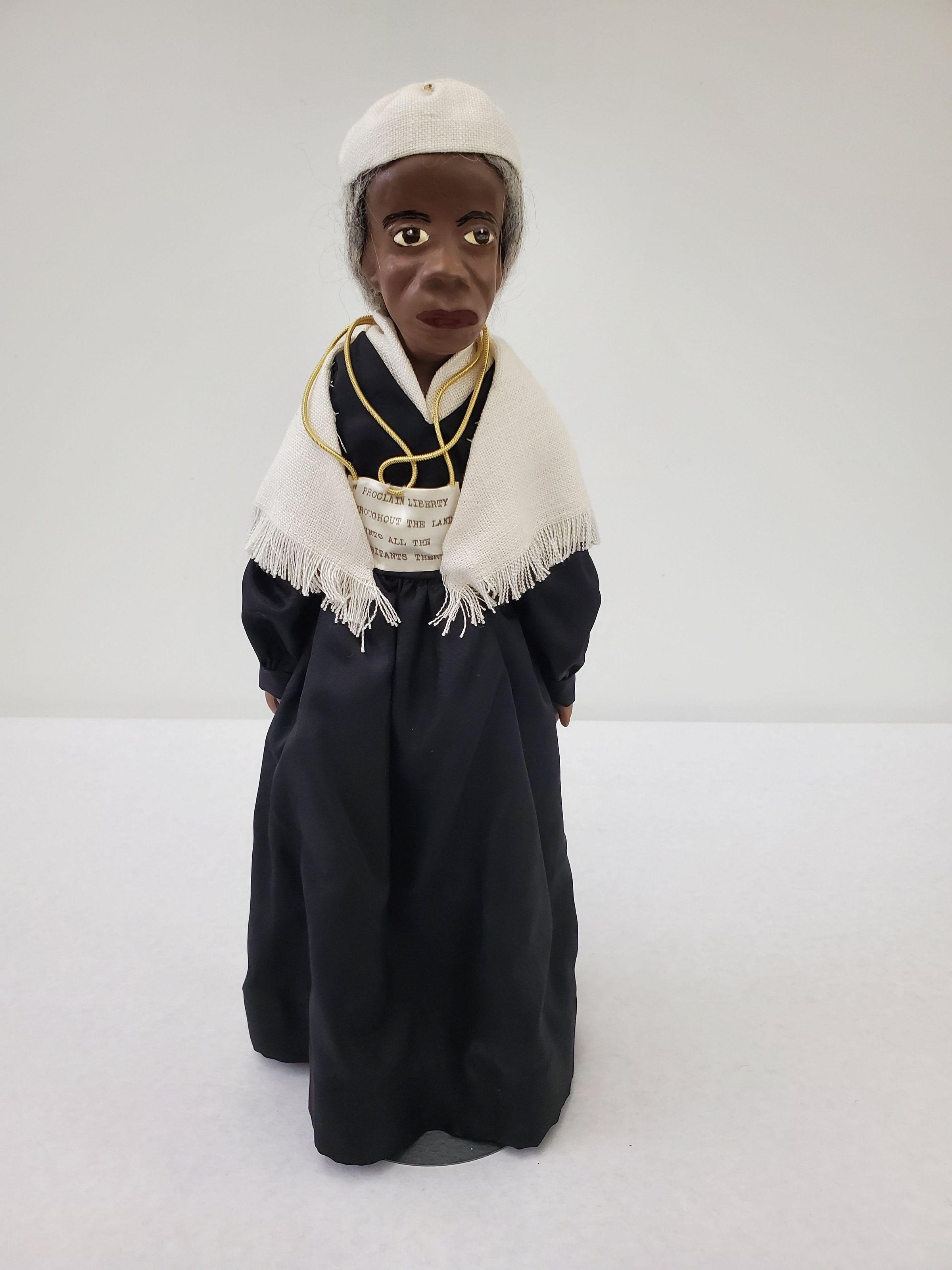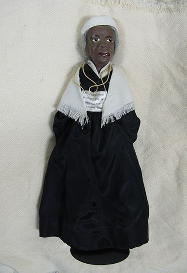 A doll on metal stand, with white skull cap, matching fringed shawl black taffeta dress, and white satin banner on chest and gold cord. Doll represents Sojourner Truth.Collection