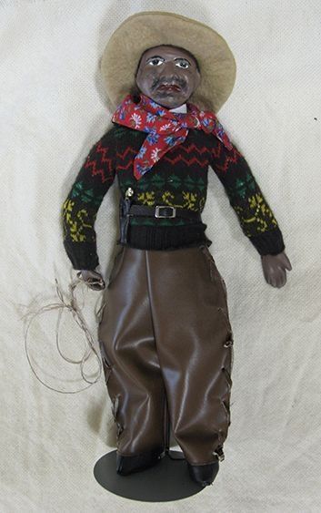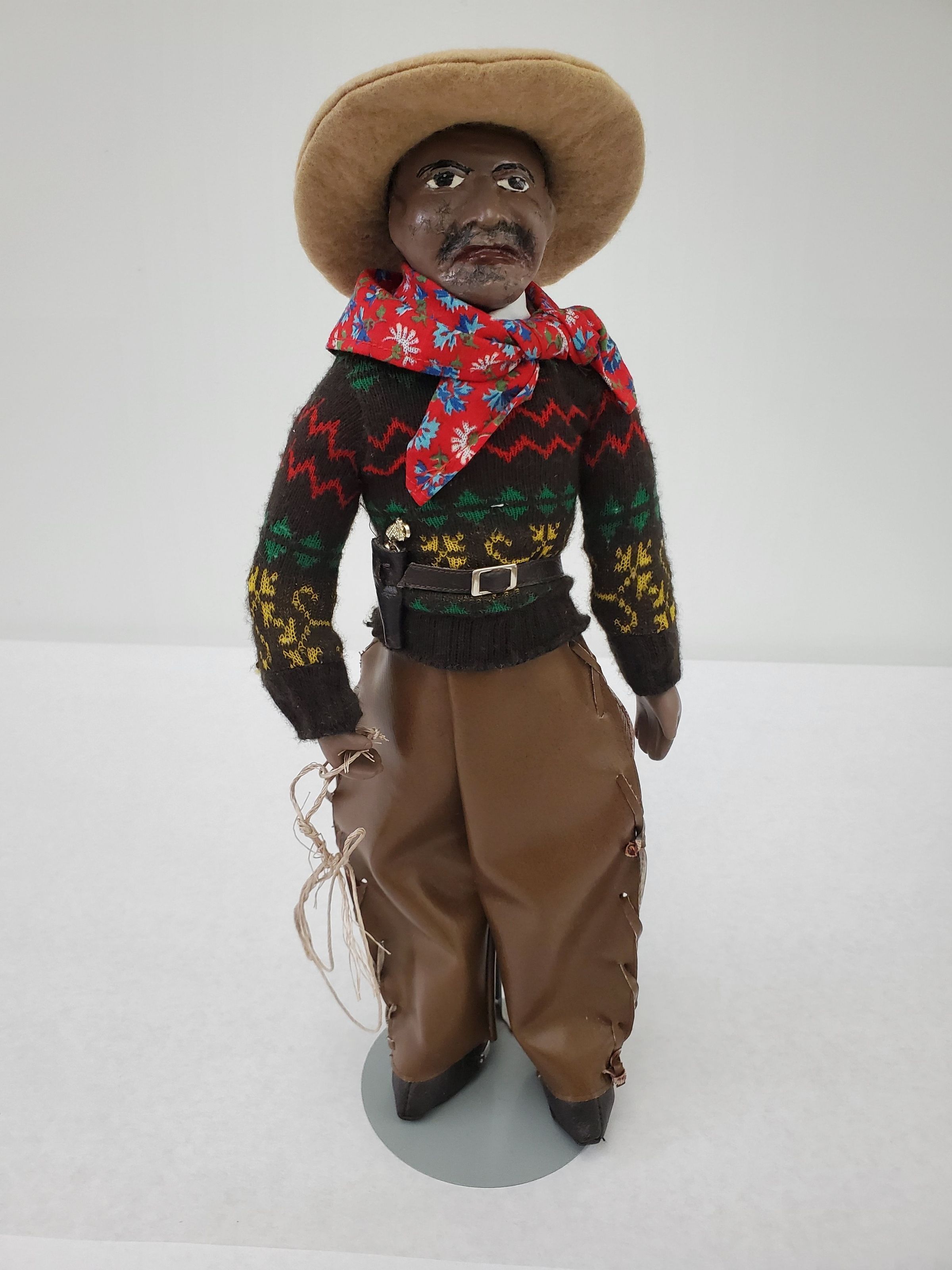 A doll on metal stand with beige felt cowboy hat, red and blue print kerchief around neck, black print sweater, brown vinyl chaps, dark brown boots with spurs, gun belt with holster and lariat. Doll represents George Glenn.Collection