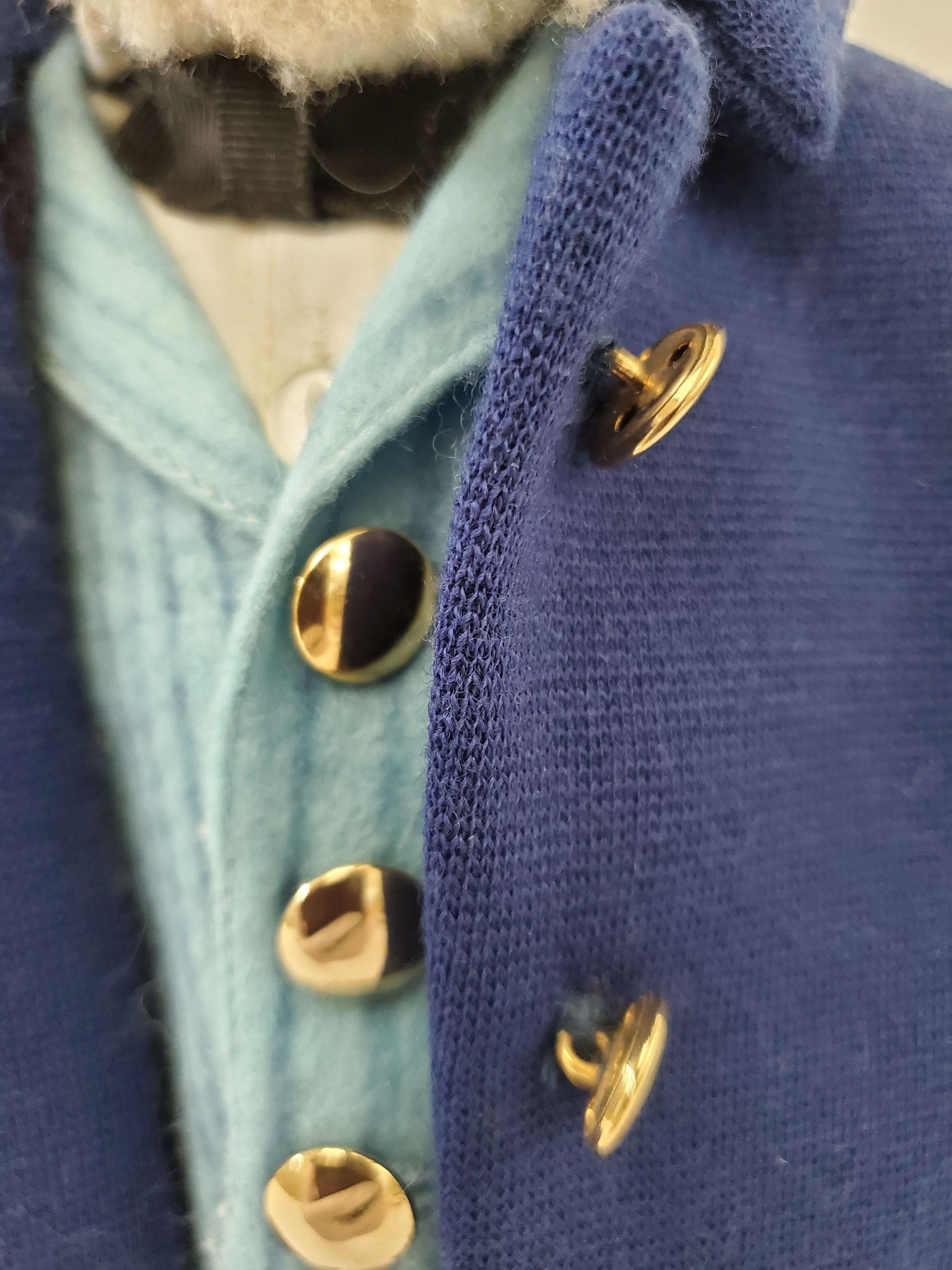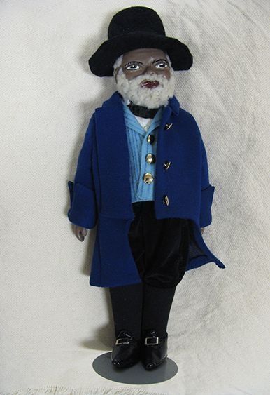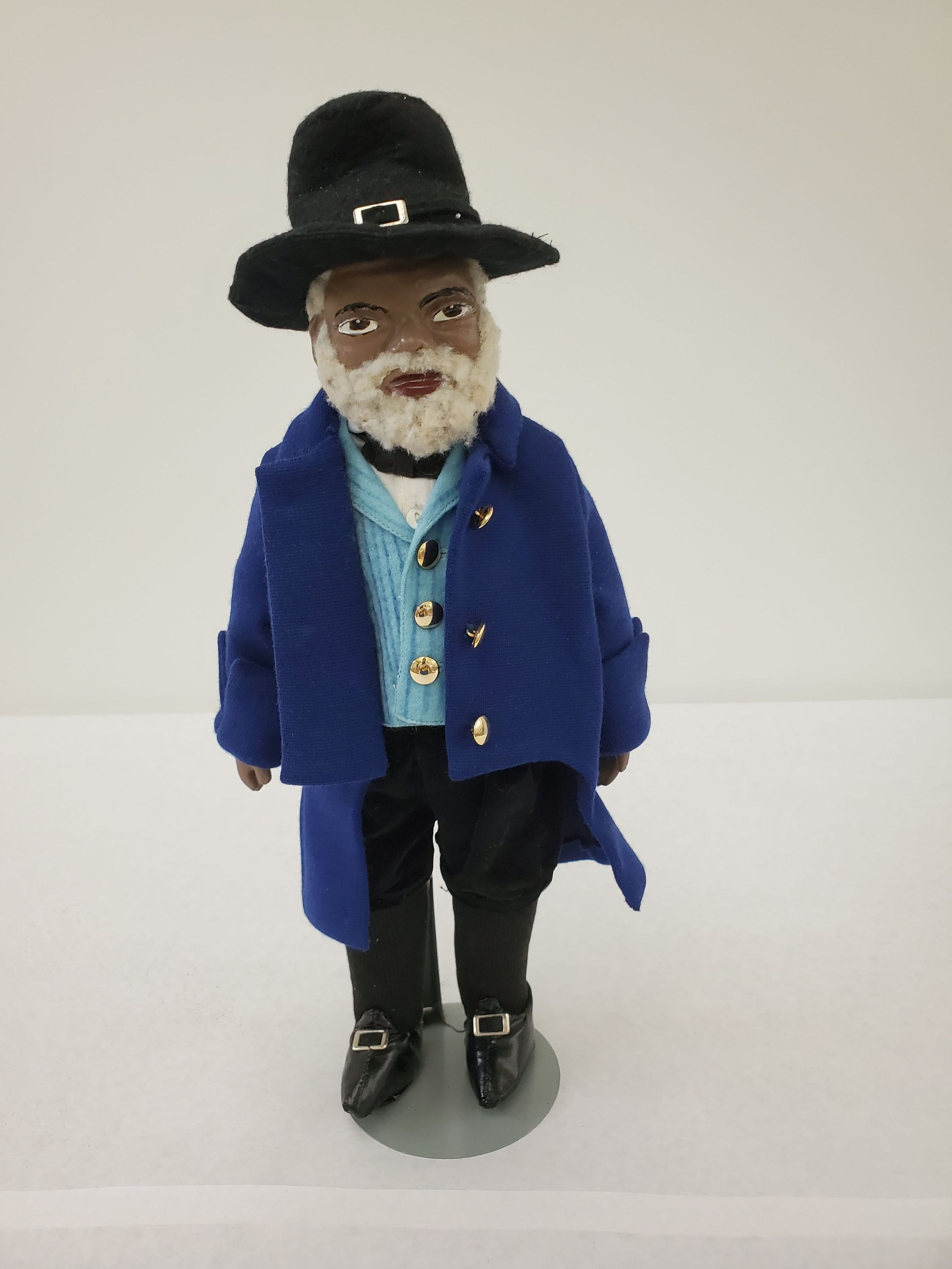 A doll on metal stand with curly white beard and mustache, black felt pilgrim hat with silver buckle, royal blue waist coat, light blue striped jerkin, white cotton collared shirt, black grosgrain ribbon bow tie, black velvet breeches, black nether socks, and black pilgrim shoes with silver buckles. Doll represents Amos Fortune.Collection