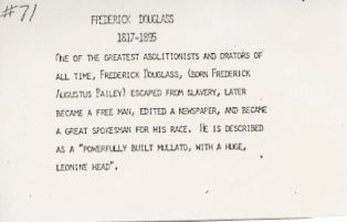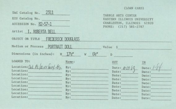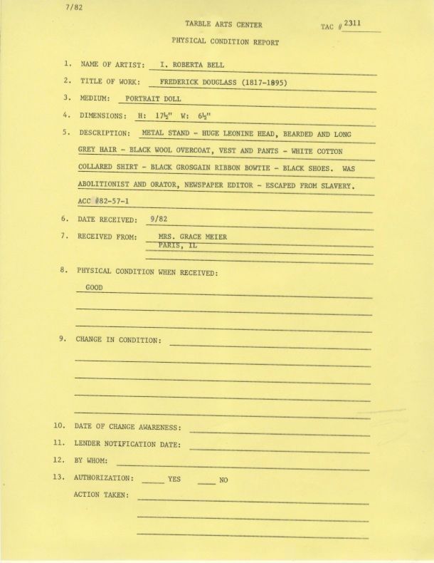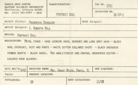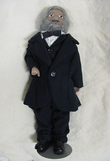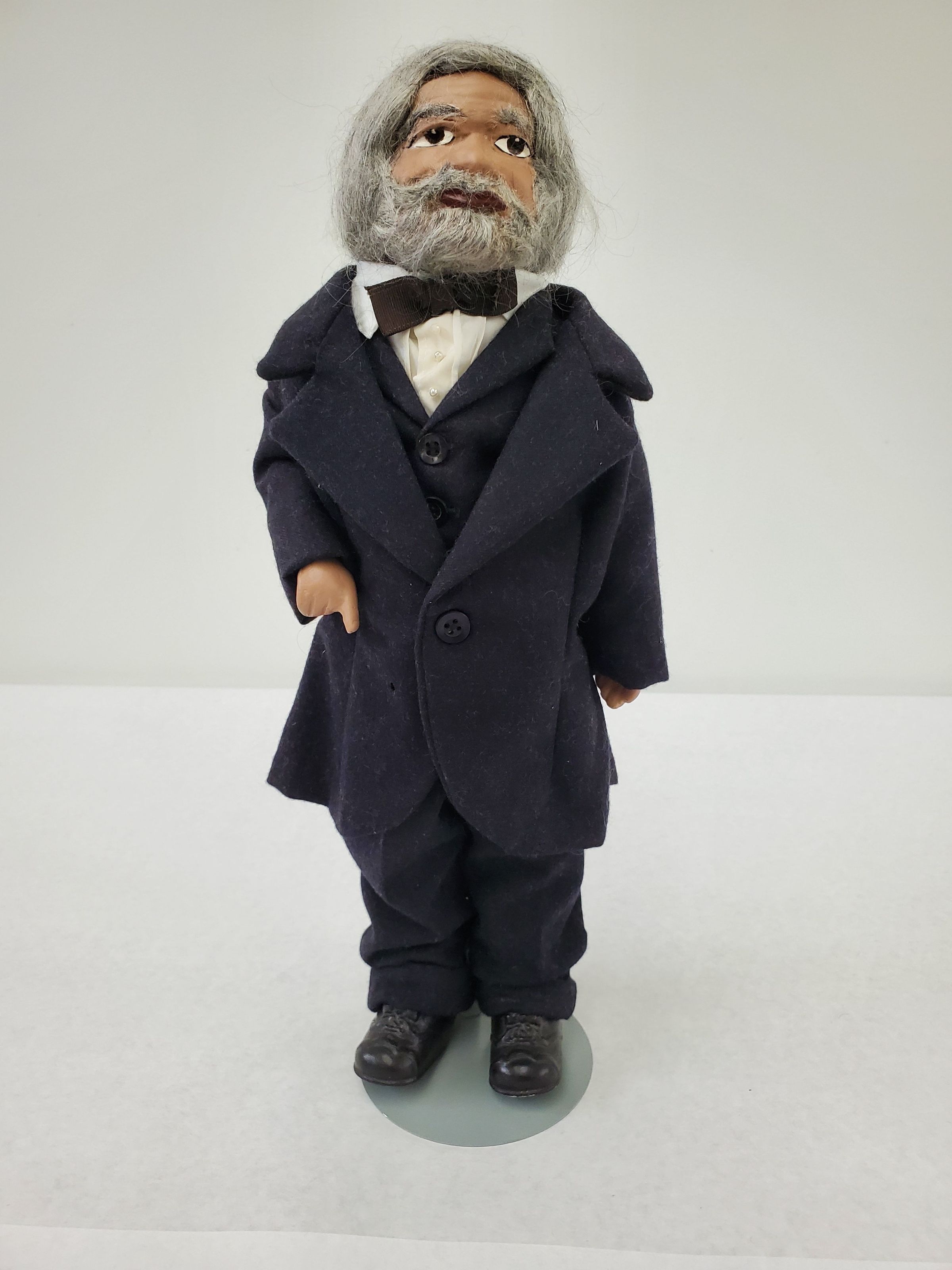 A doll on metal stand with huge leonine head, bearded and long grey hair, black wool overcoat, vest and pants, white cotton collared shirt black grosgrain ribbon bow tie, and black shoes. Doll represents Frederick Douglass who was an abolitionist, orator, and newspaper editor that escaped from slavery.Collection