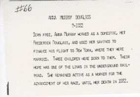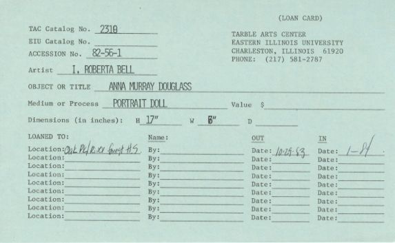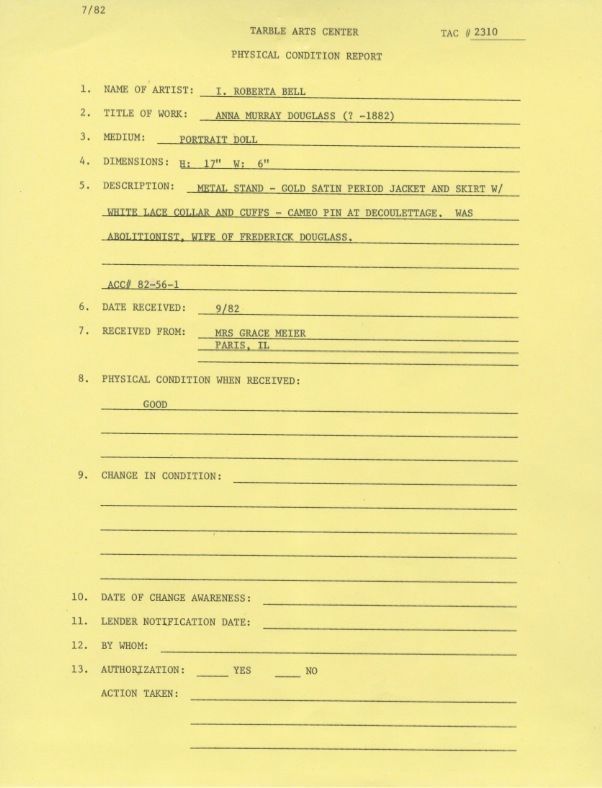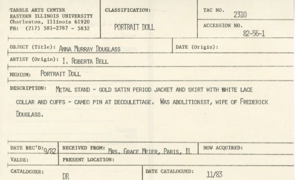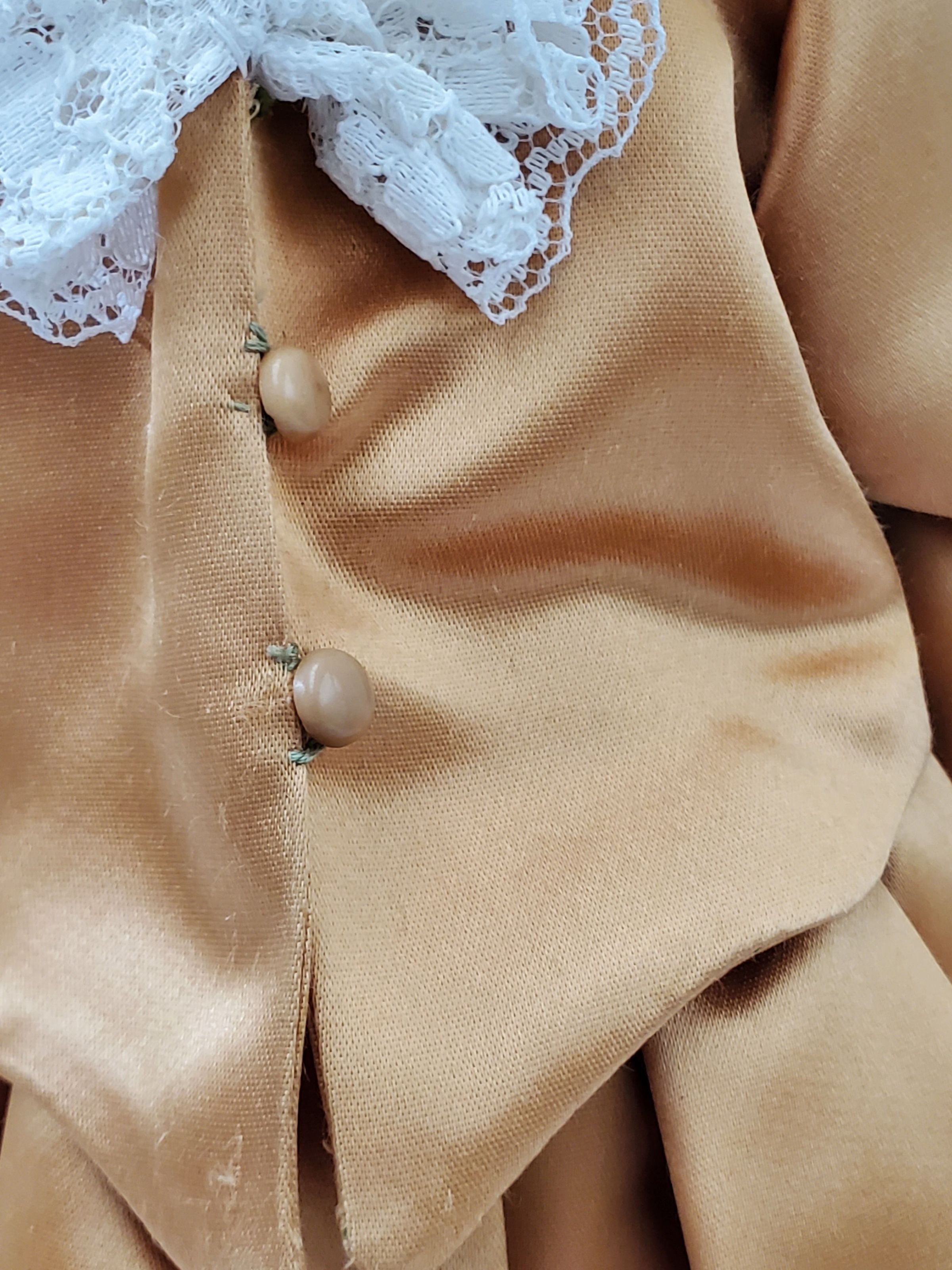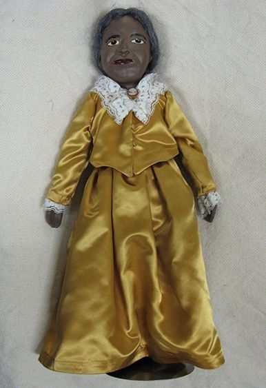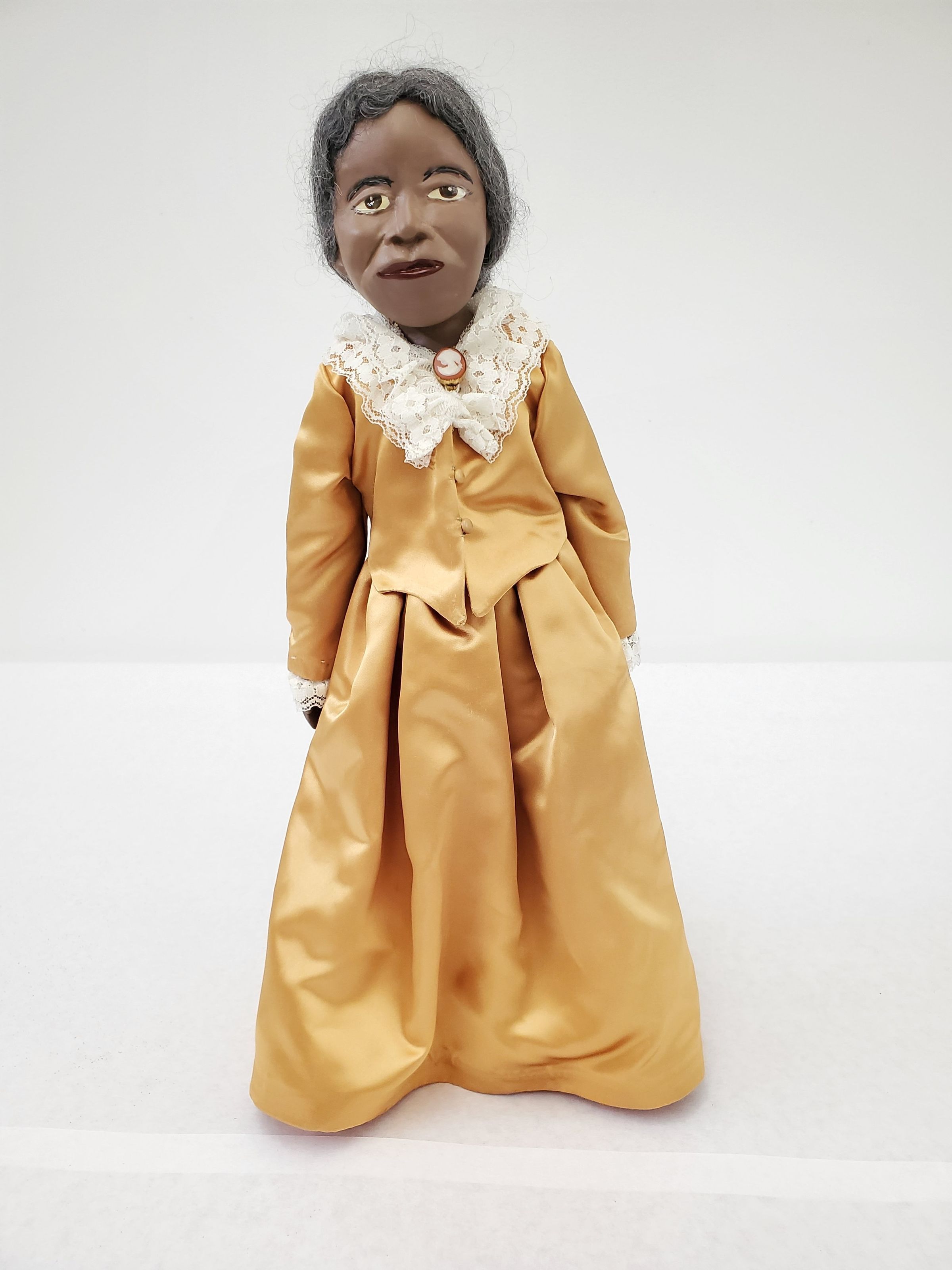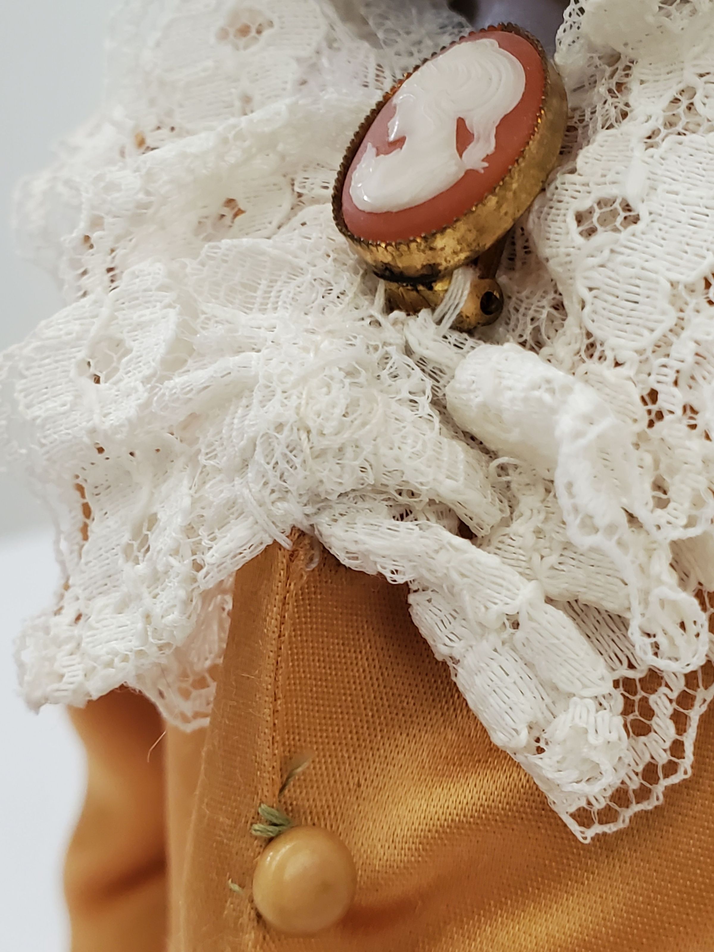 A doll on metal stand with gold satin period jacket and skirt with white lace, collar, and cuffs, cameo pin at decolletage. Doll represents Anna Murray Douglass, an abolitionist and wife of Frederick Douglass.Collection