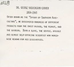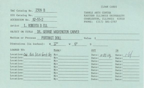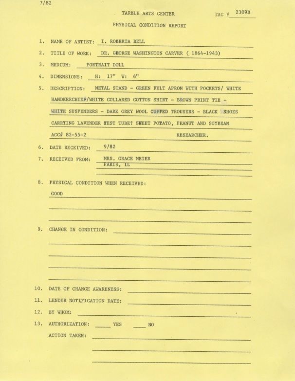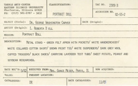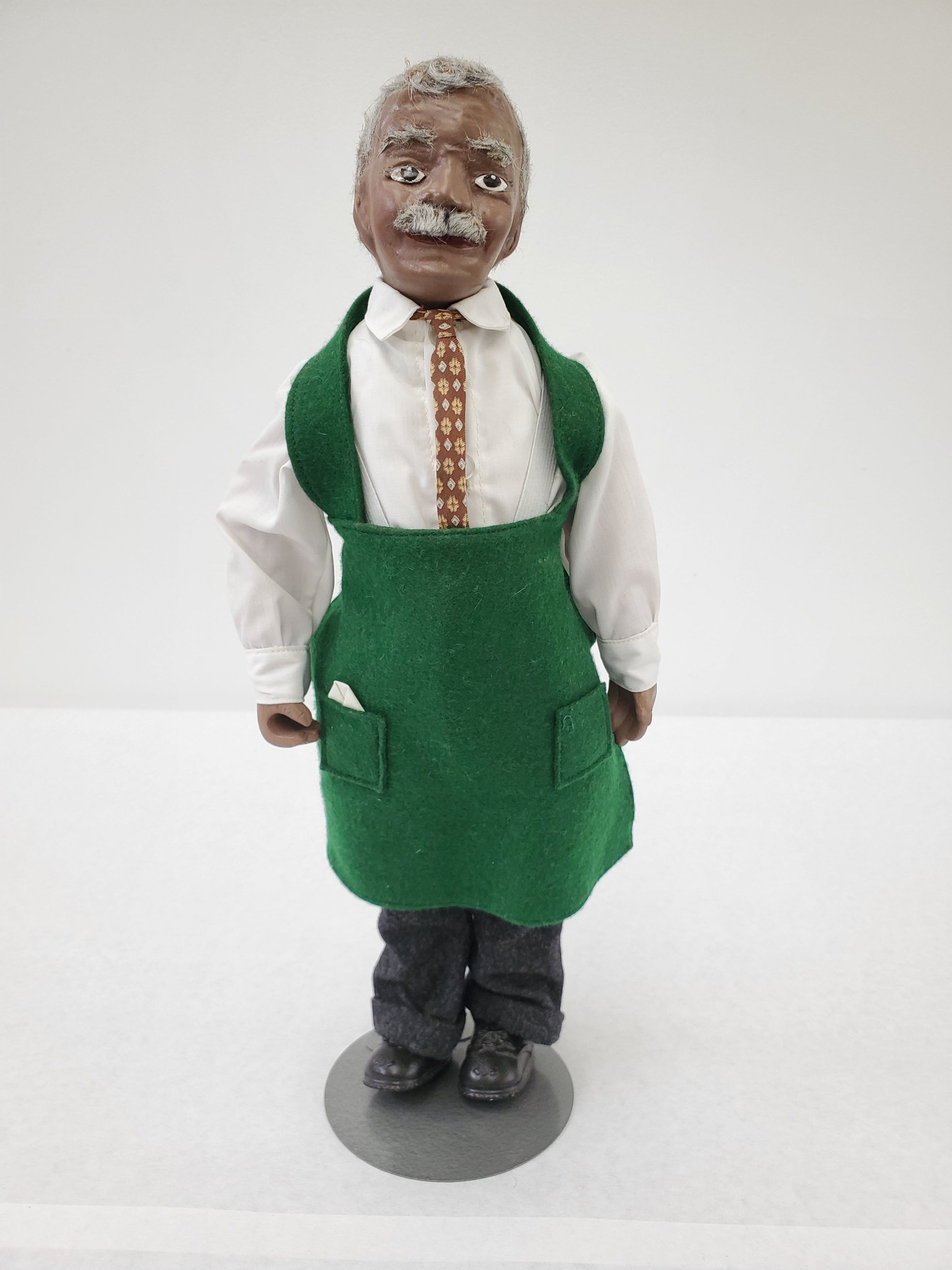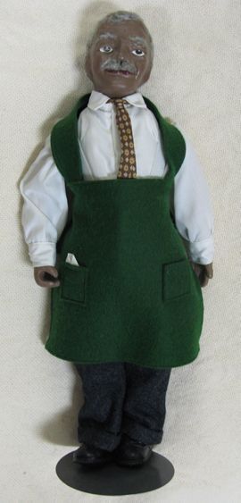 A doll on metal stand with green felt apron with pockets, white handkerchief, white collared cotton shirt, brown print tie, white suspenders, dark grey wool cuffed trousers, black shoes, and carrying lavender test tube. Doll represents Dr. George Washington Carver.Collection