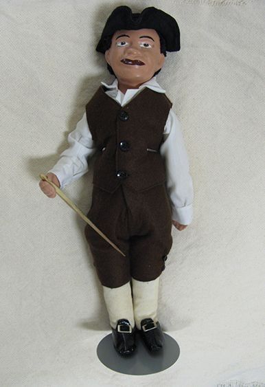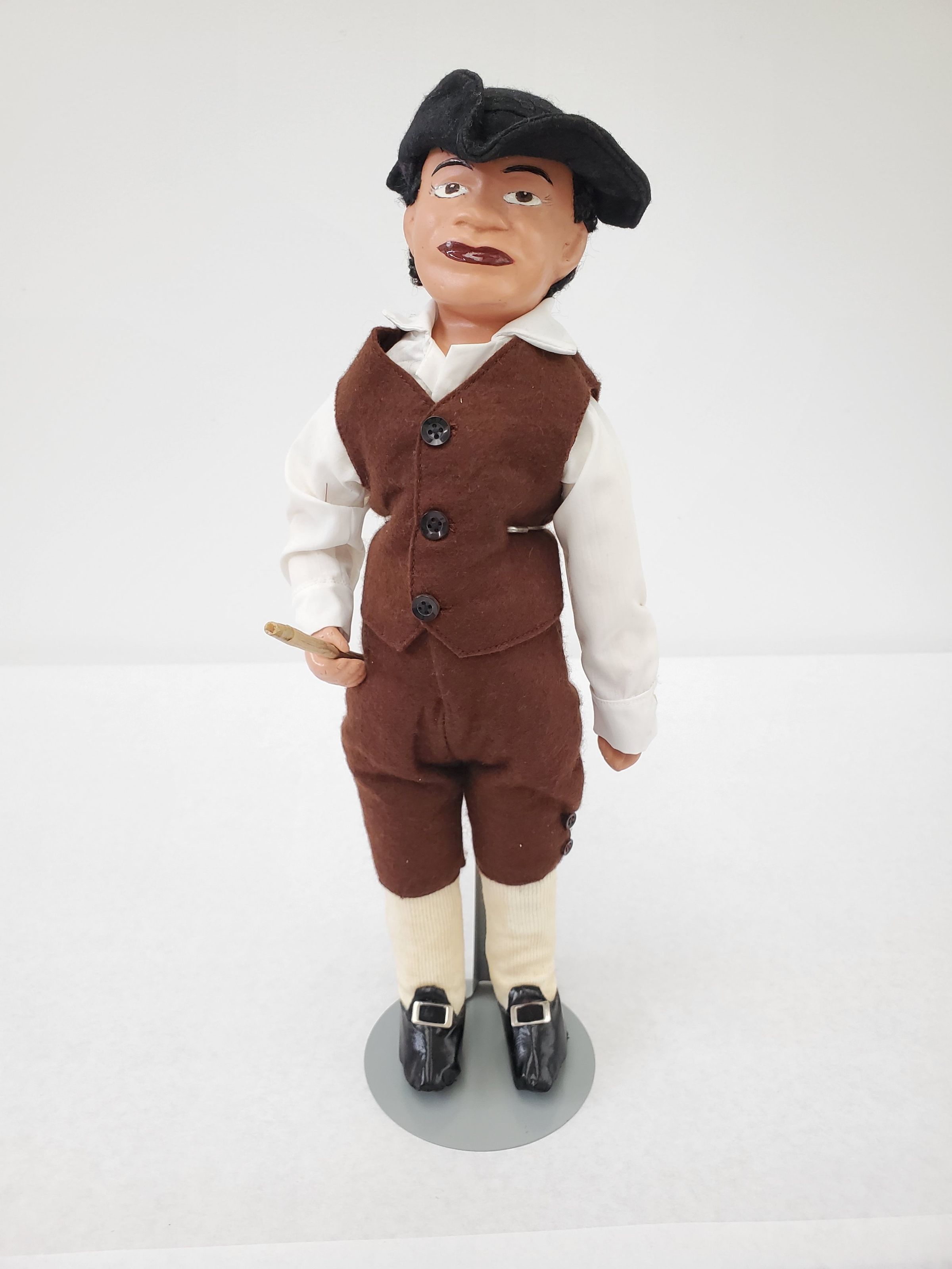 A doll on metal stand with black tricolored hat, brown felt vest and breeches, white cotton collared shirt, ivory nether socks, black pilgrim shoes with silver buckles, and armed with sharp wooden staff. Doll represents Crispus Attucks.Collection