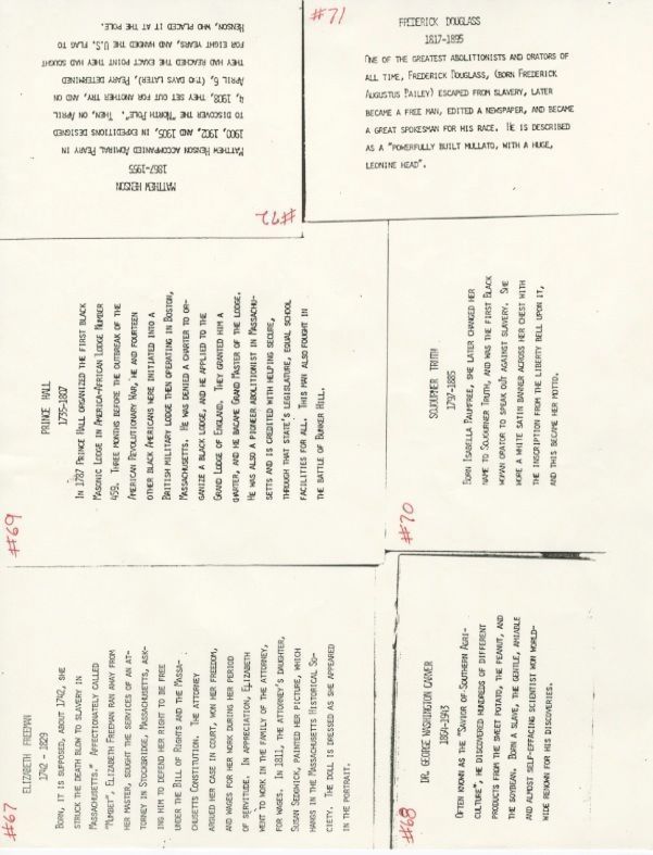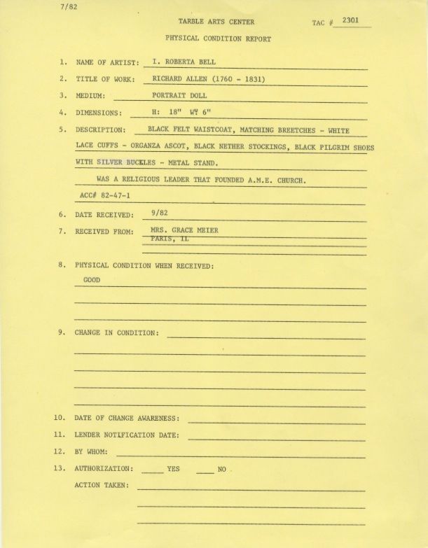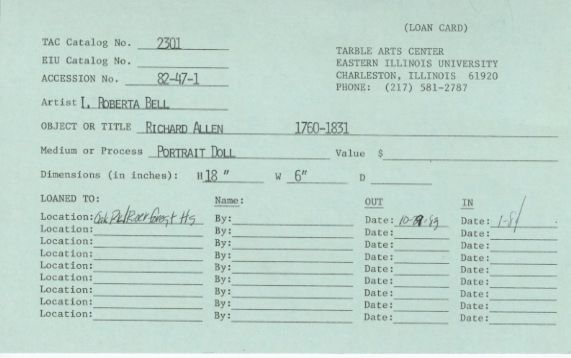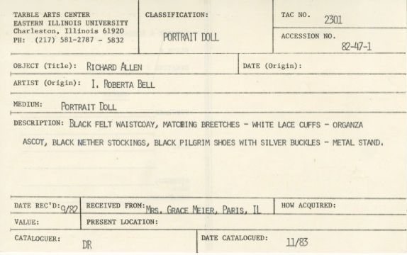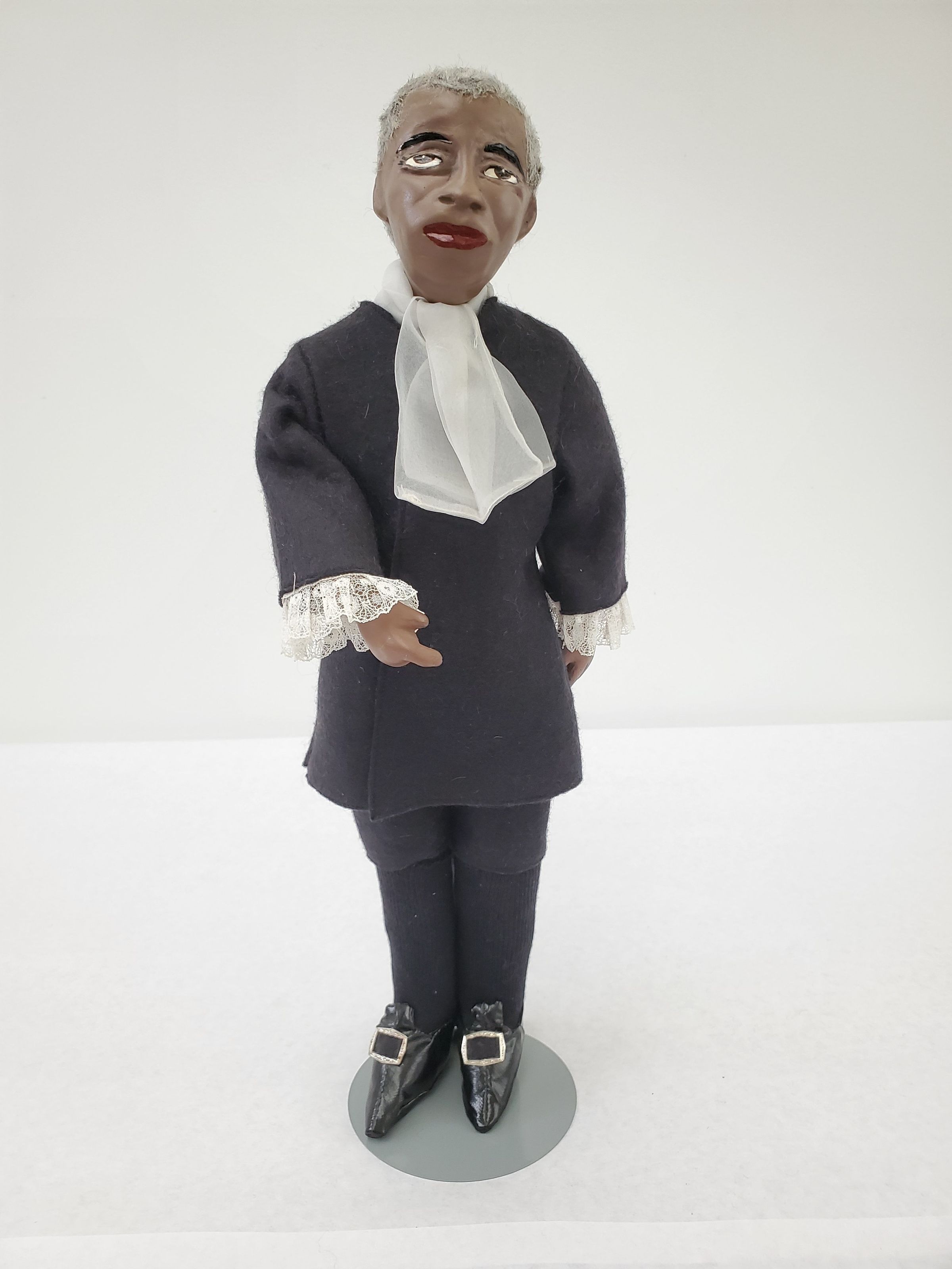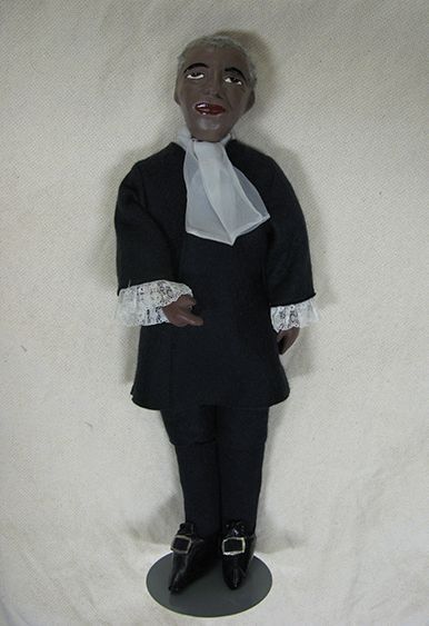 A doll on metal stand with black felt waistcoat, matching breeches, white lace cuffs, organza ascot, black leather stocking, and black pilgrim shoes with silver buckles. Doll represents Richard Allen.Collection