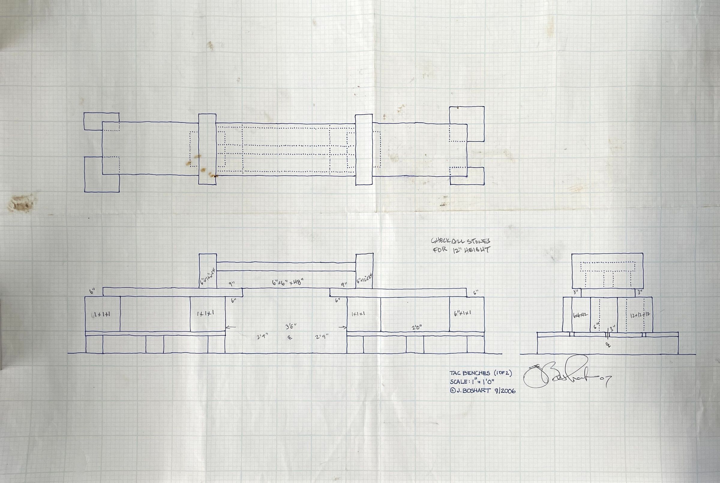 Orthographic construction details of benches. Signed by artist."Jeff Boshart"Collection