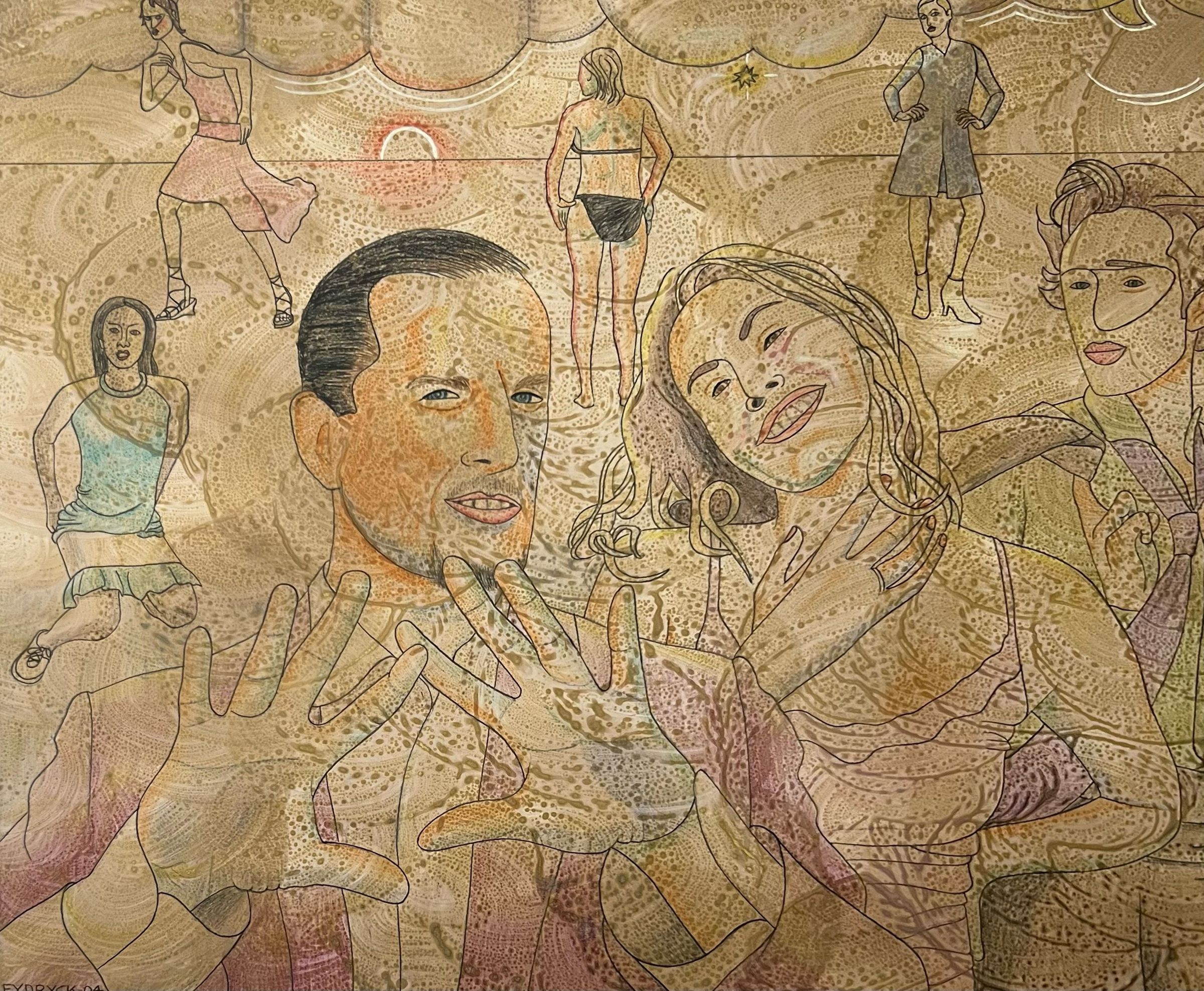 Large male head left foreground with line-drawn hands below; 3/4 female right foregroundCollection