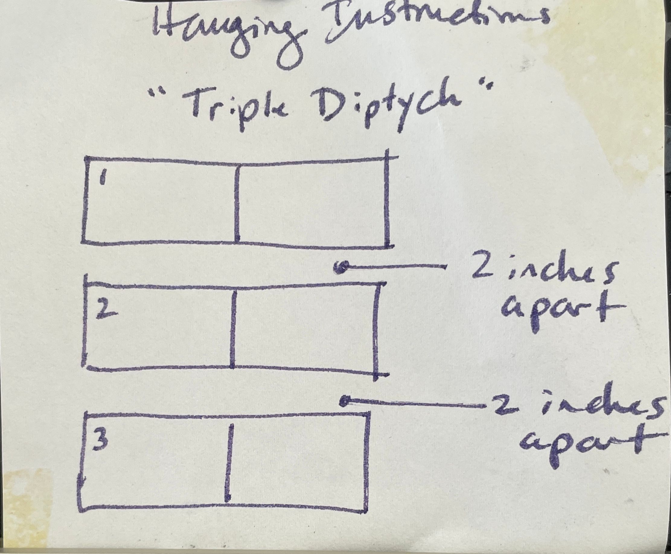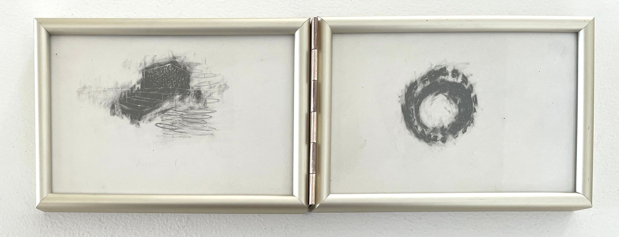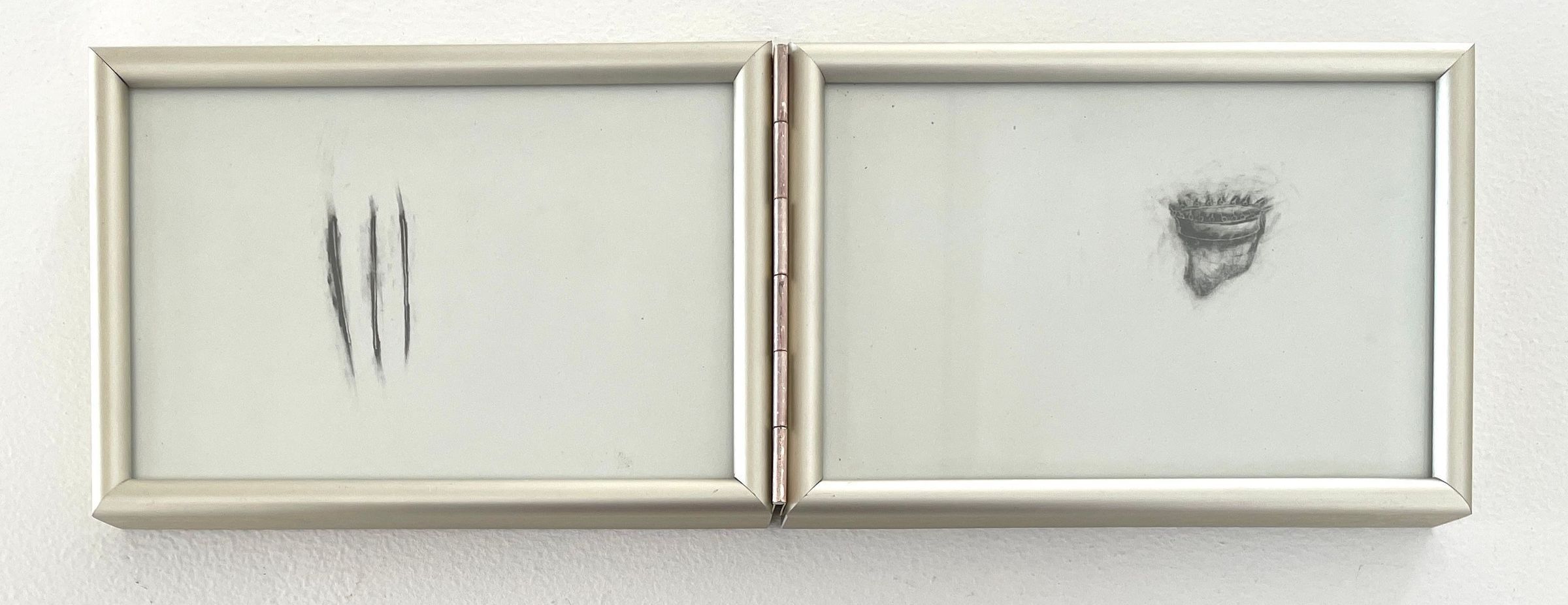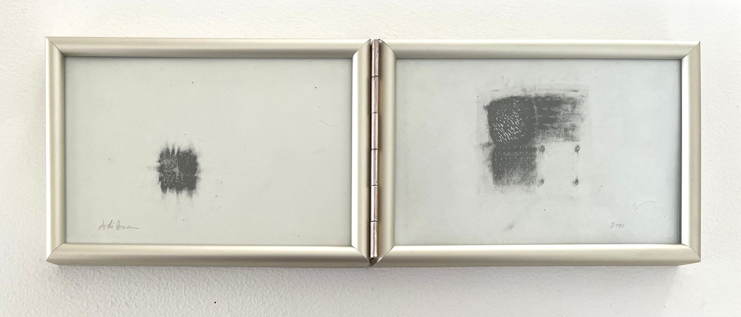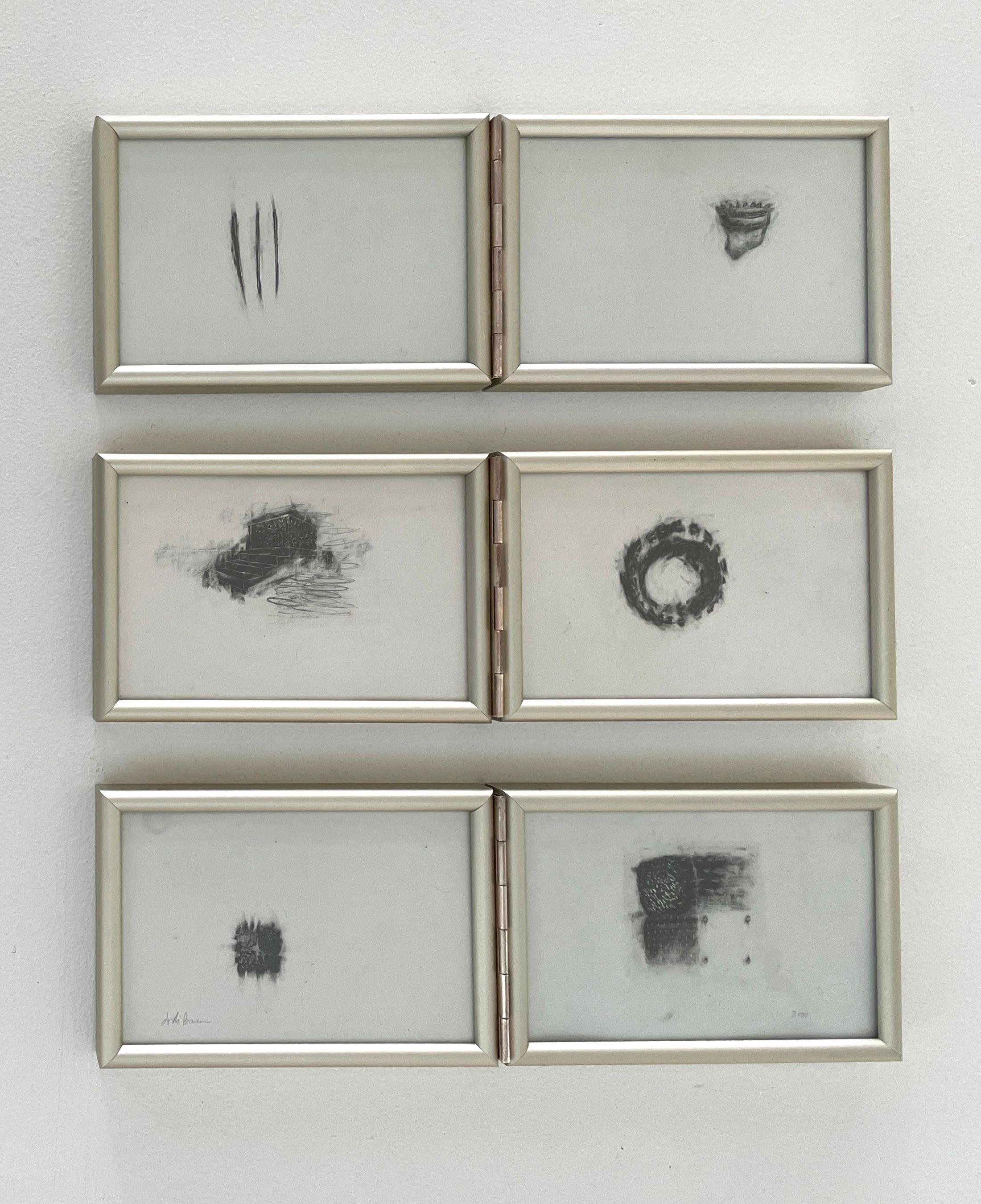 three pairs of small horizontal abstract pencil drawings dark values set in hinged polished aluminum frames; stacked vertically with 2" separation; signed lower left panel; Jodi Bowen/lower right panel; 2000Collection