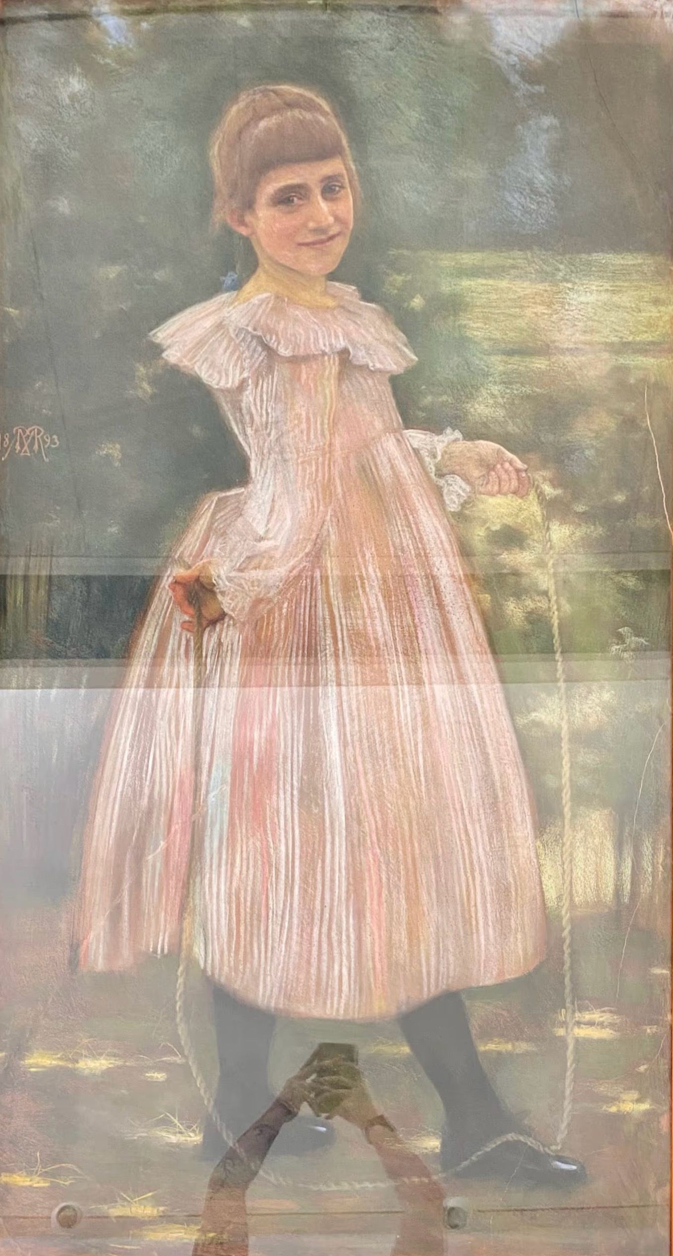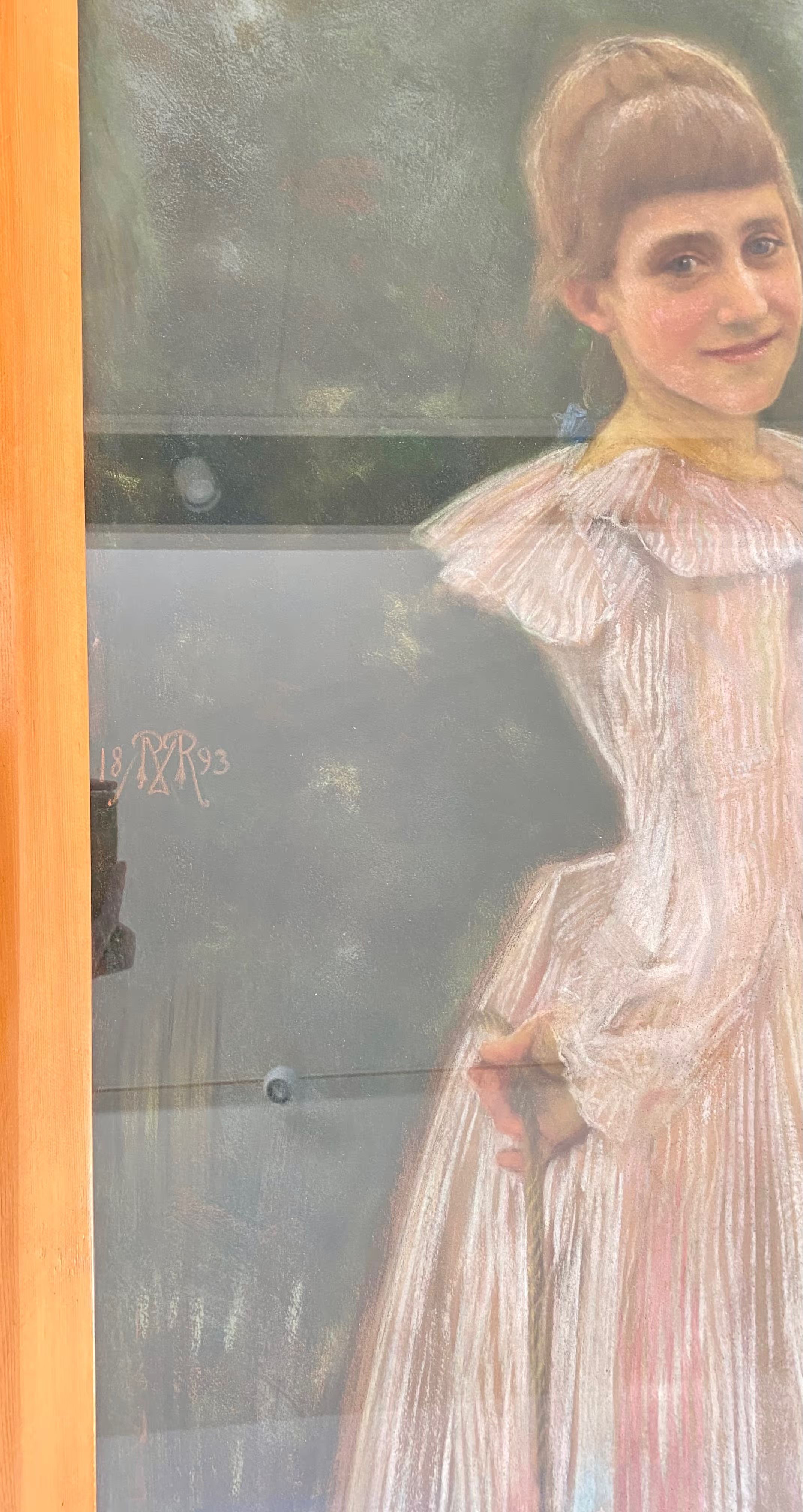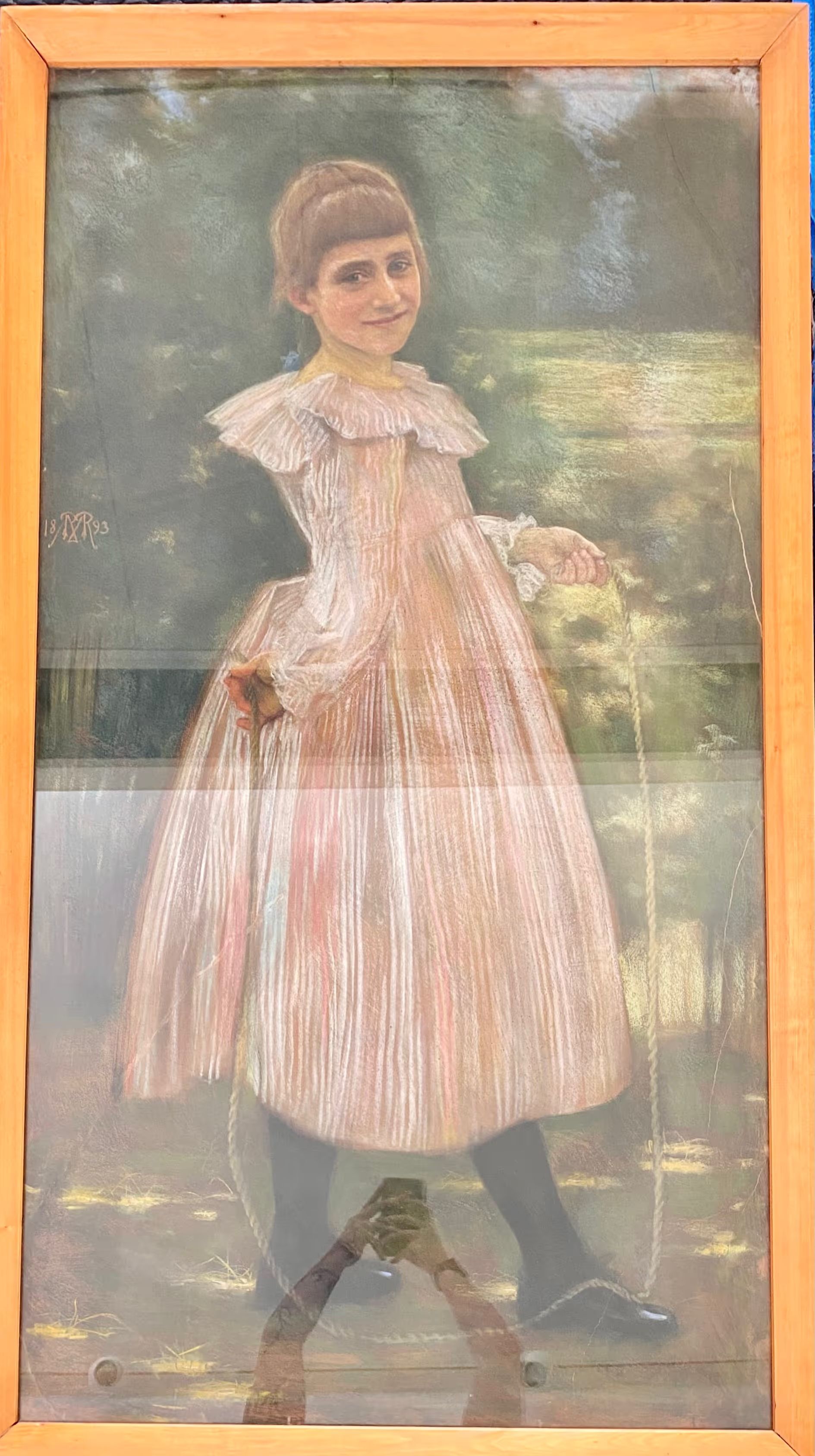 Signed "RMR 1893" middle left edge of face subject is a girl inwhite dress A full-lenght portrait holding jump rope. Tears inpaper upper right corner and lower left corner. It is the artist's neice. No other artifacts known to family.Collection