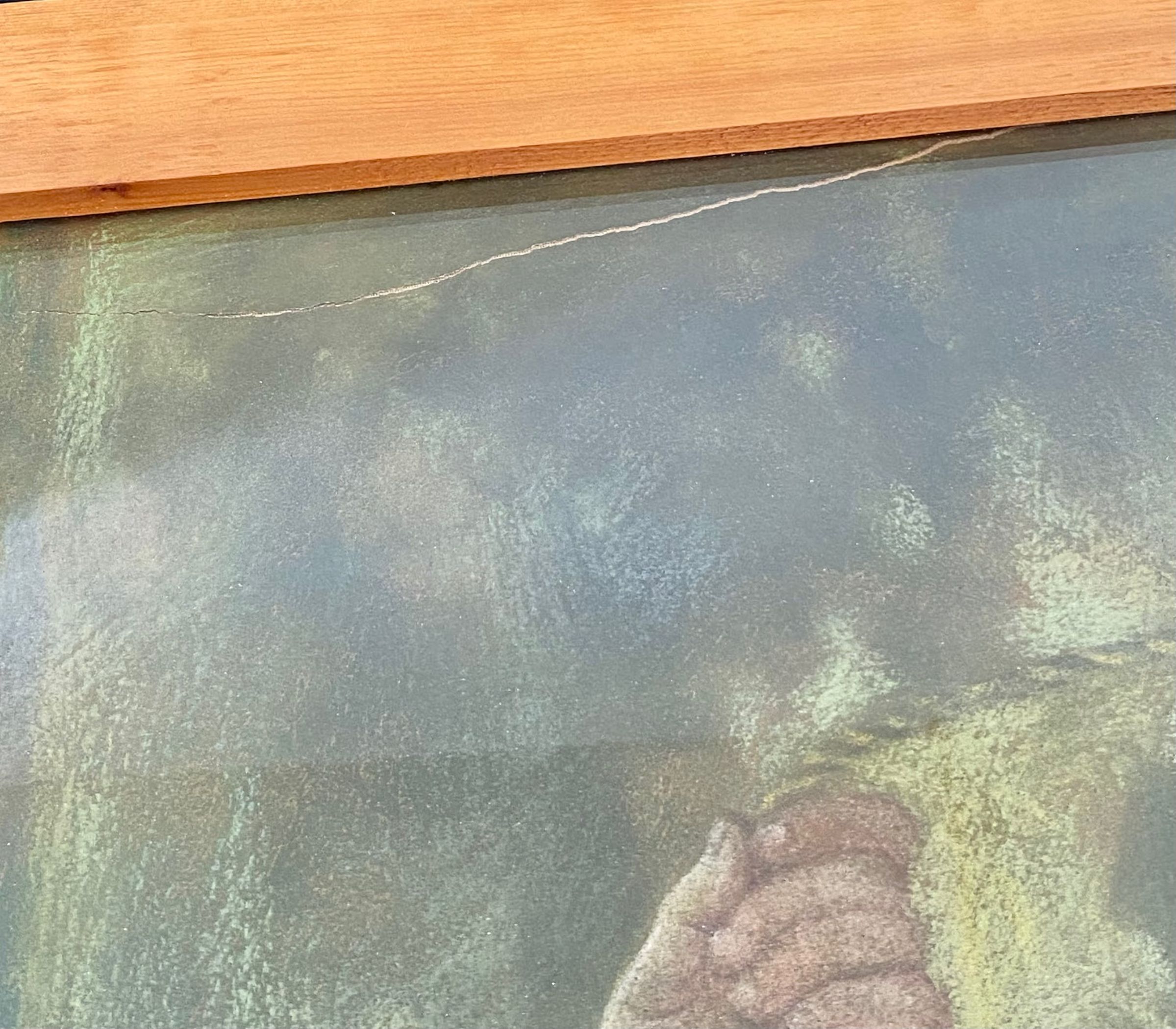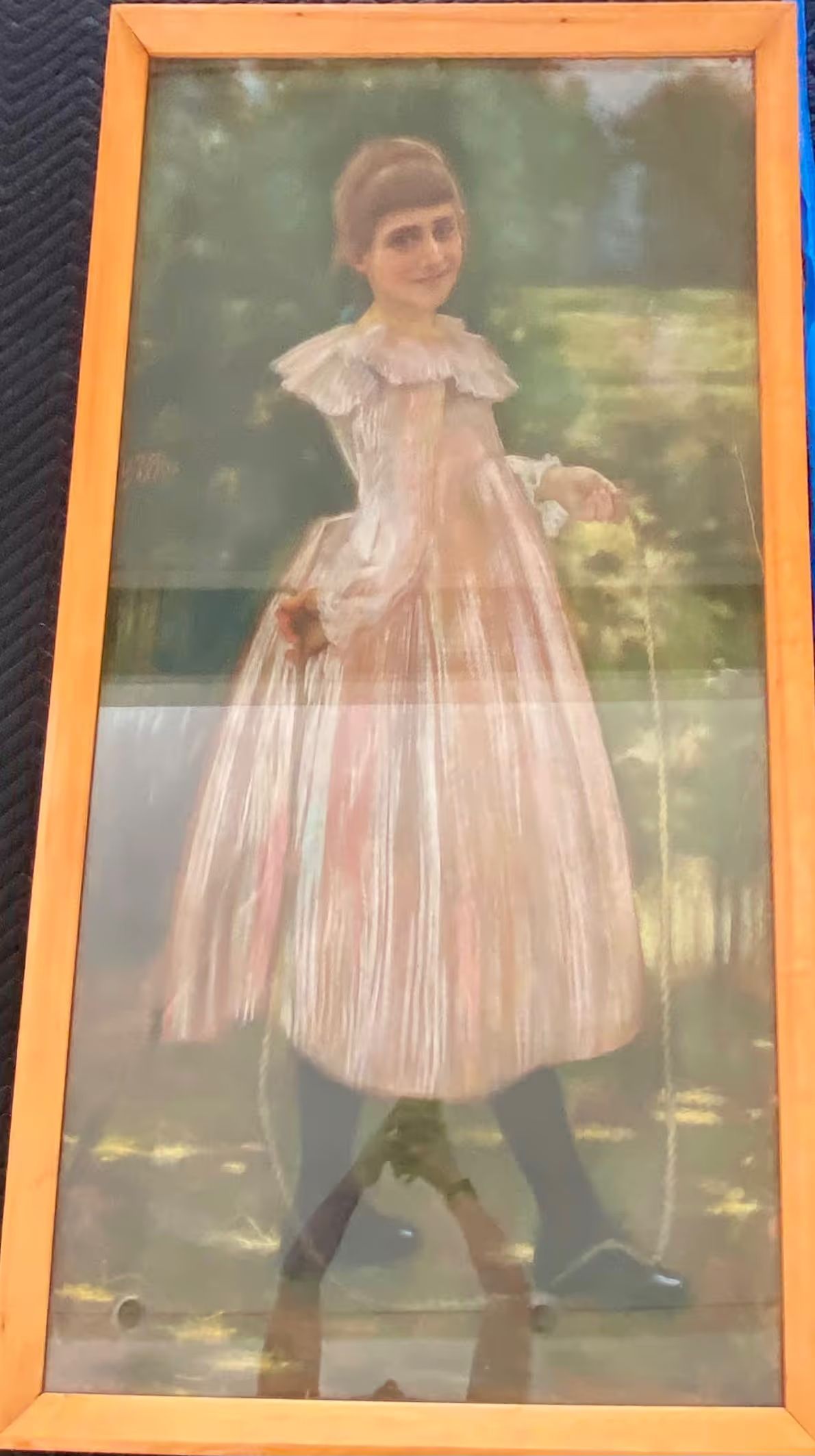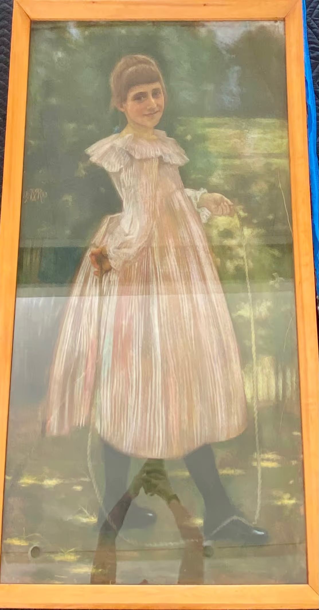 Signed "RMR 1893" middle left edge of face subject is a girl inwhite dress A full-lenght portrait holding jump rope. Tears inpaper upper right corner and lower left corner. It is the artist's neice. No other artifacts known to family.Collection