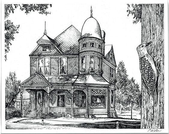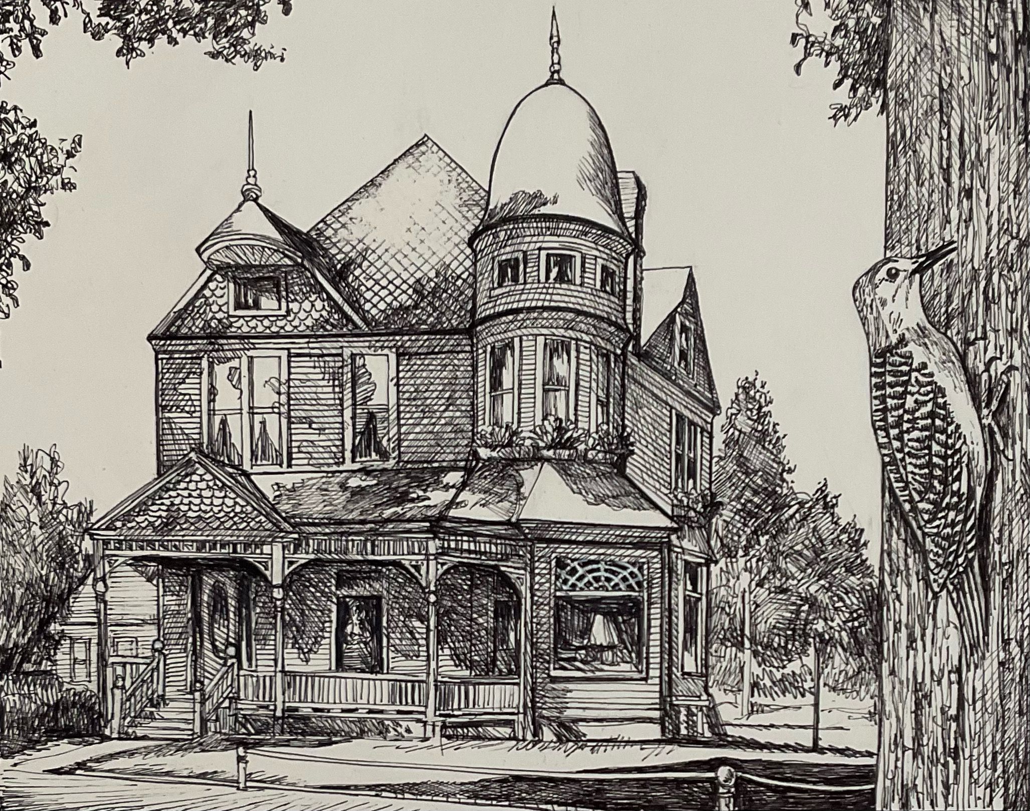 Horizontal; A large two-story Queen Anne style house with front porch and a corner tower with a bell roof. At right top to bottom is a cropped tree trunk with a bird.Collection