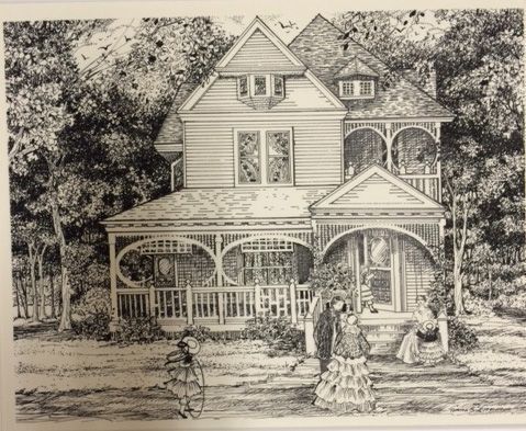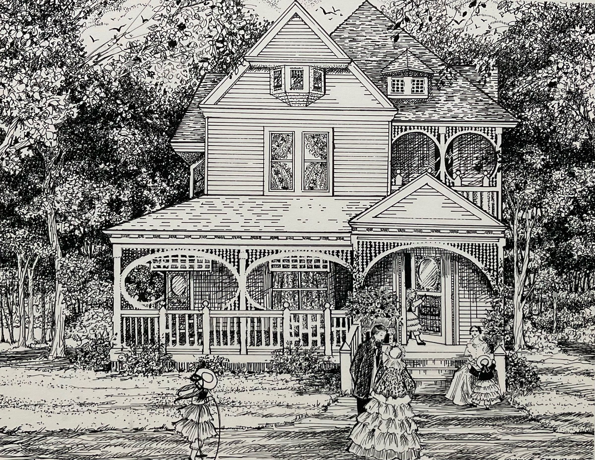 Horizontal; The house has elaborate porch ornamentation and a girl is coming out the front door. A woman is playing with a toddler on the porch steps while a man and woman talk on the front lawn and a child plays with a hoop.Collection