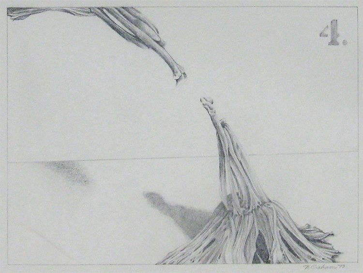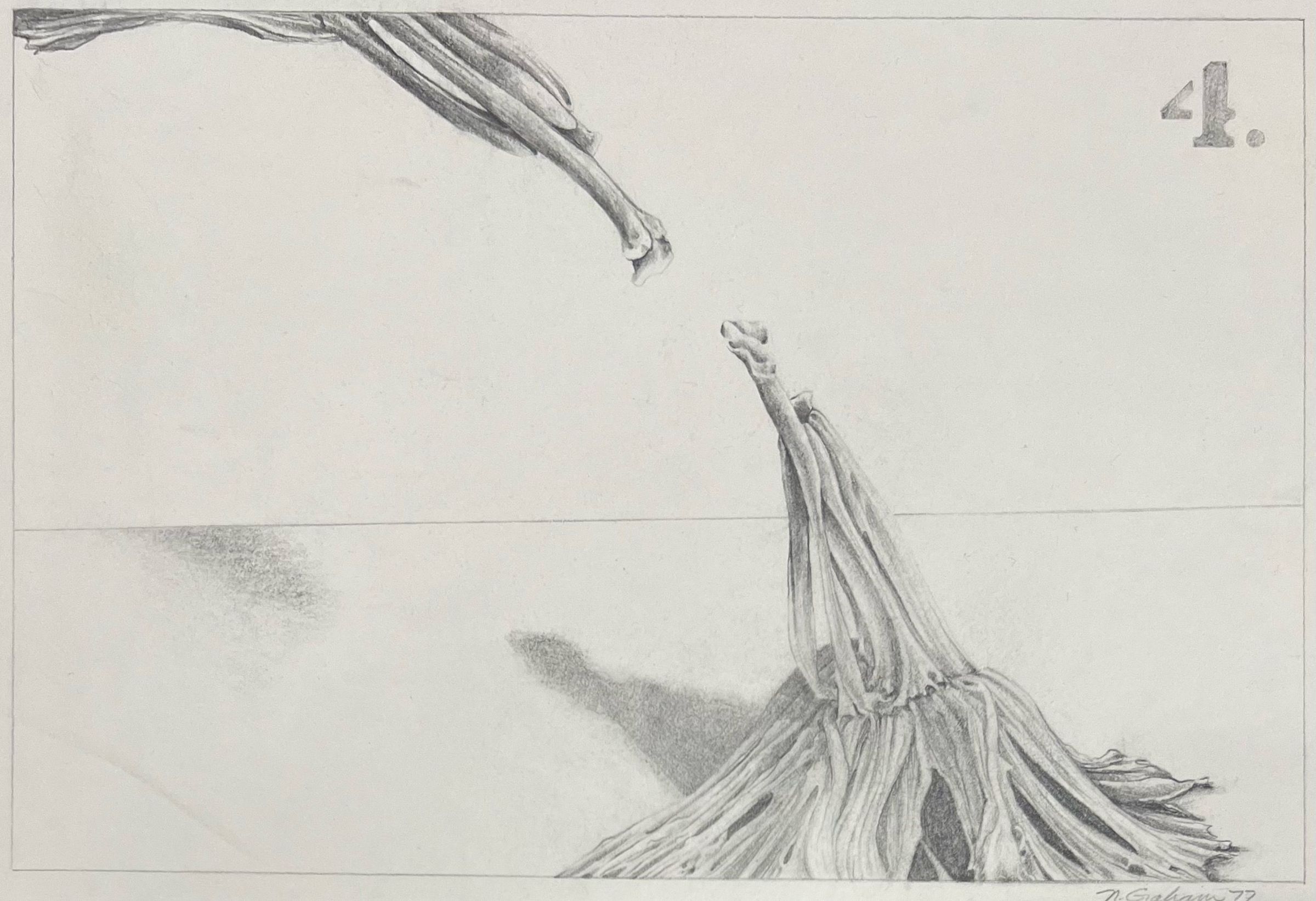 Pencil drawing of reaching trunk forms with #4 on right hand corner outlined in pencil and horizon line. Work matted with white pebble board. Unframed.Acquisition