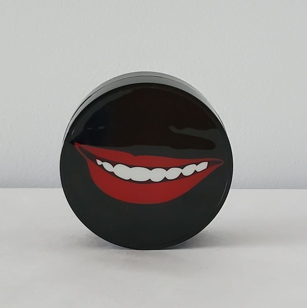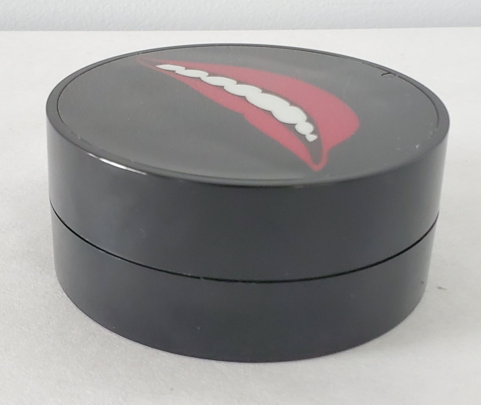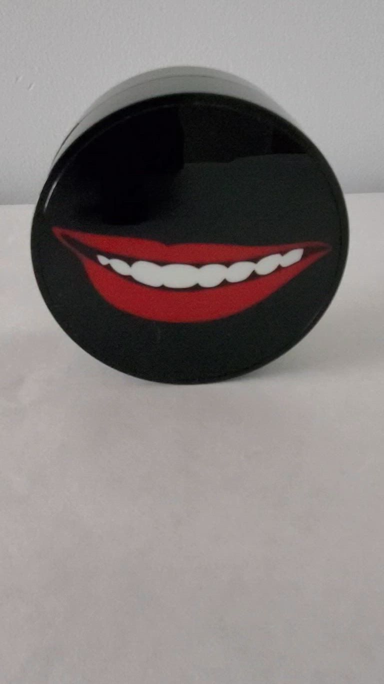 Black cylinder with seam running around at half way up height. Large smile on top. Instructions to push on smile to activate item. Requires 3 AAA batteries.Collection
