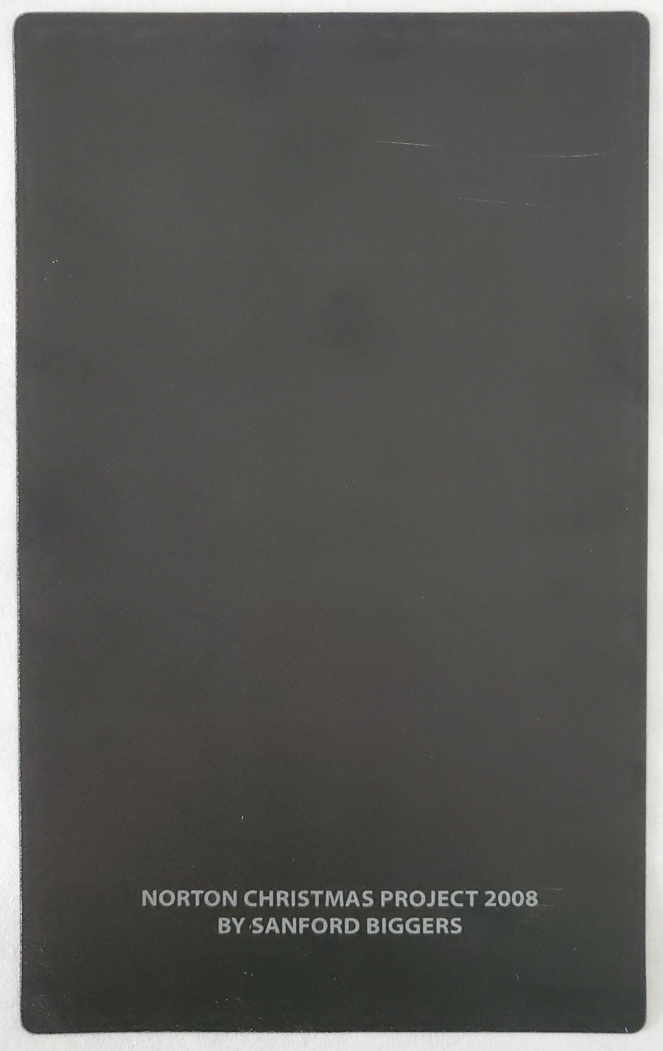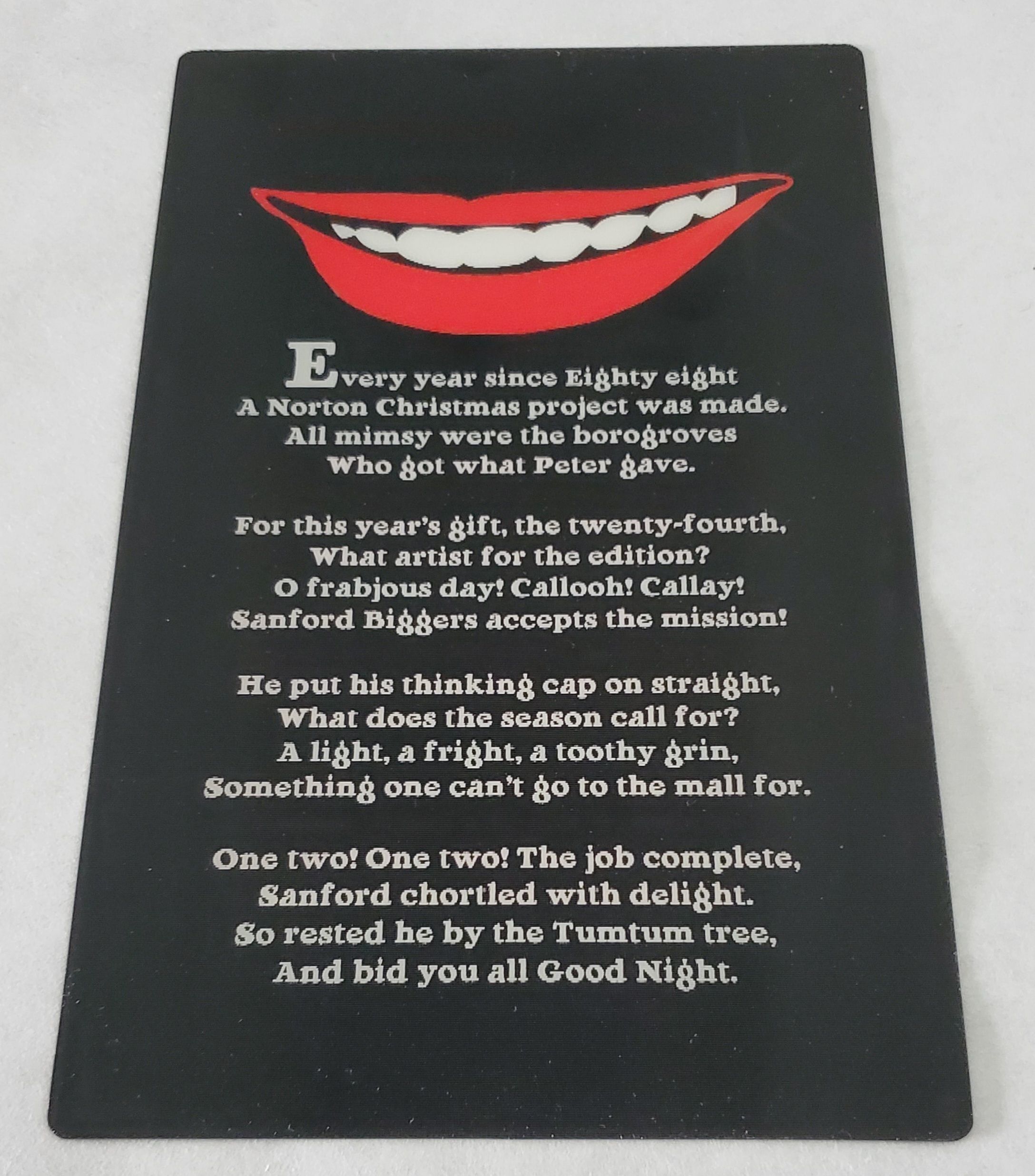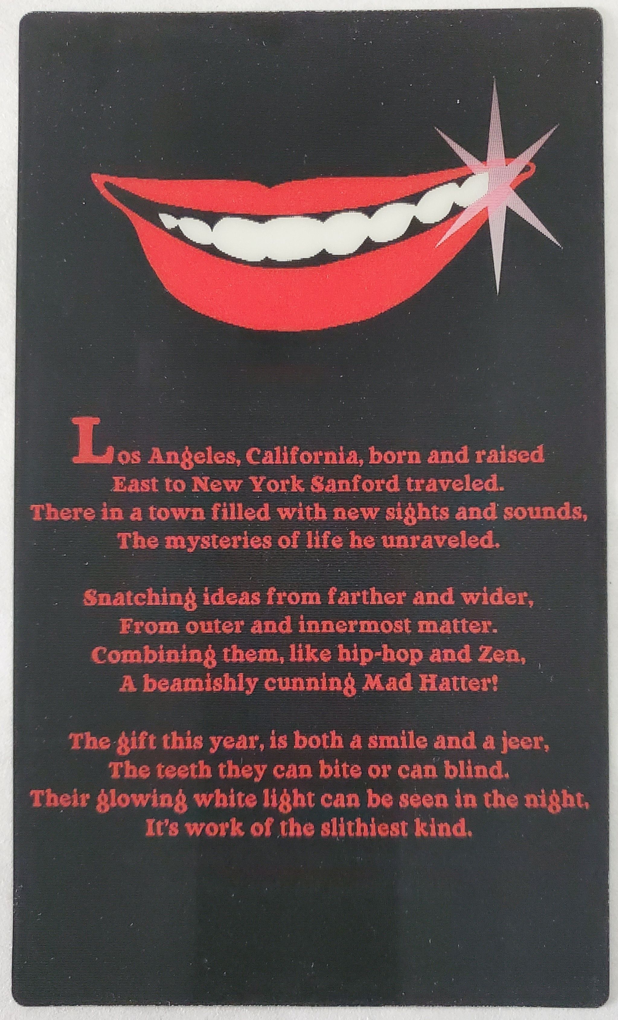 Black cylinder with seam running around at half way up height. Large smile on top. Instructions to push on smile to activate item. Requires 3 AAA batteries.Collection