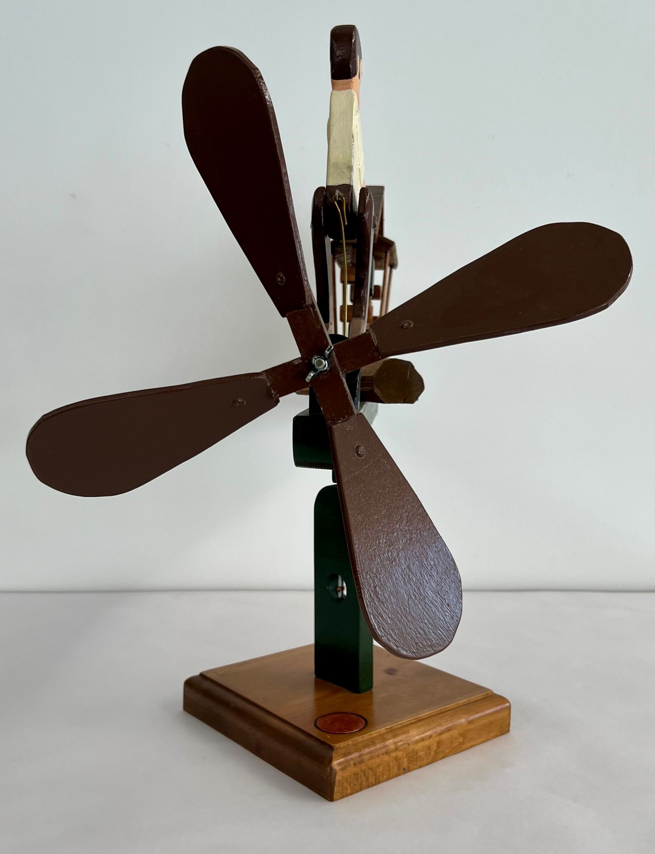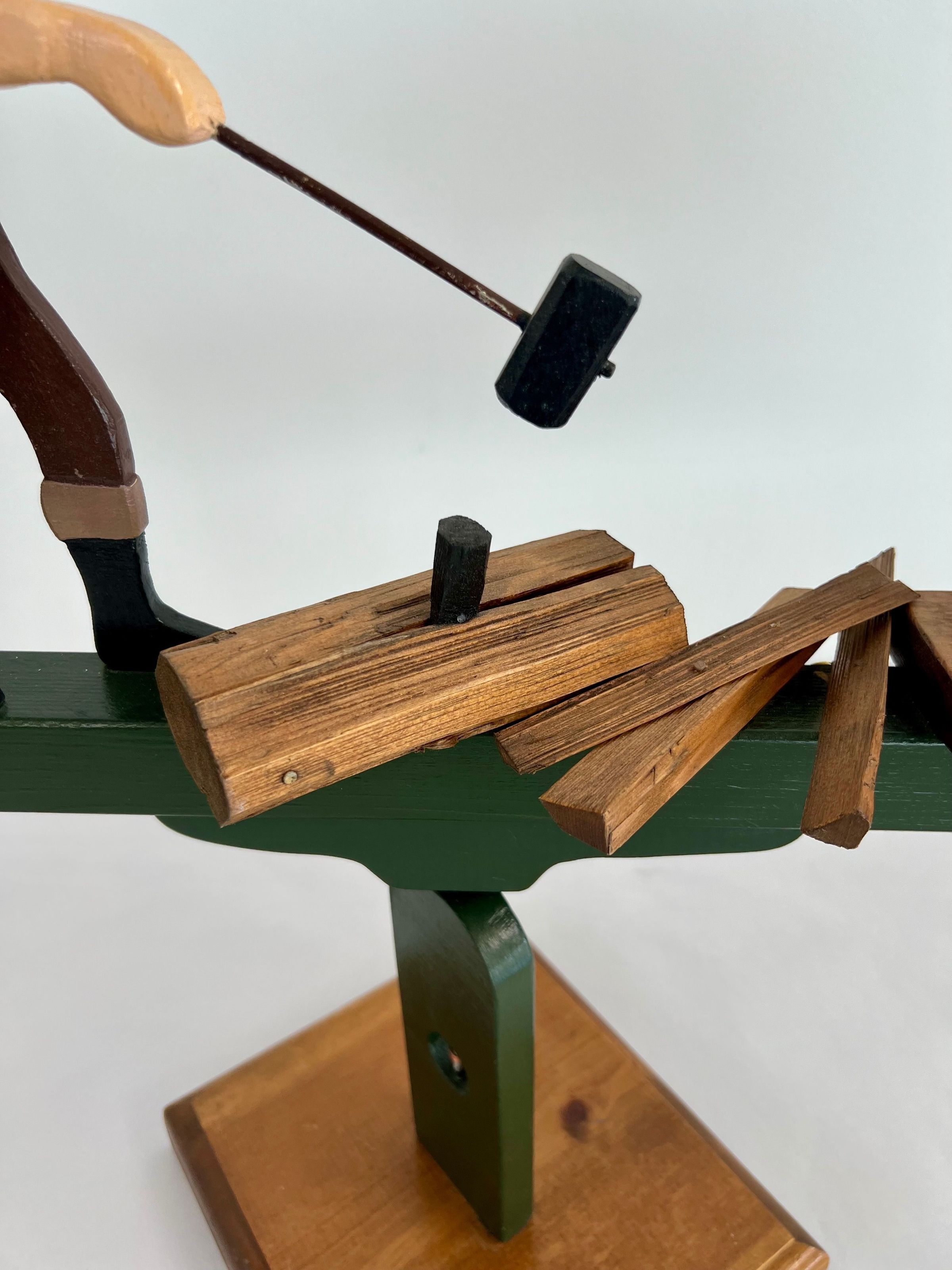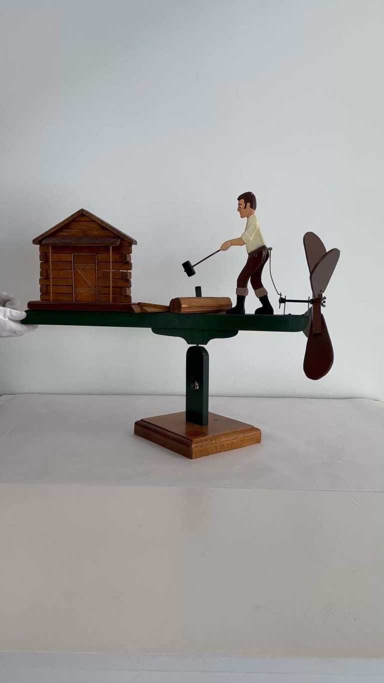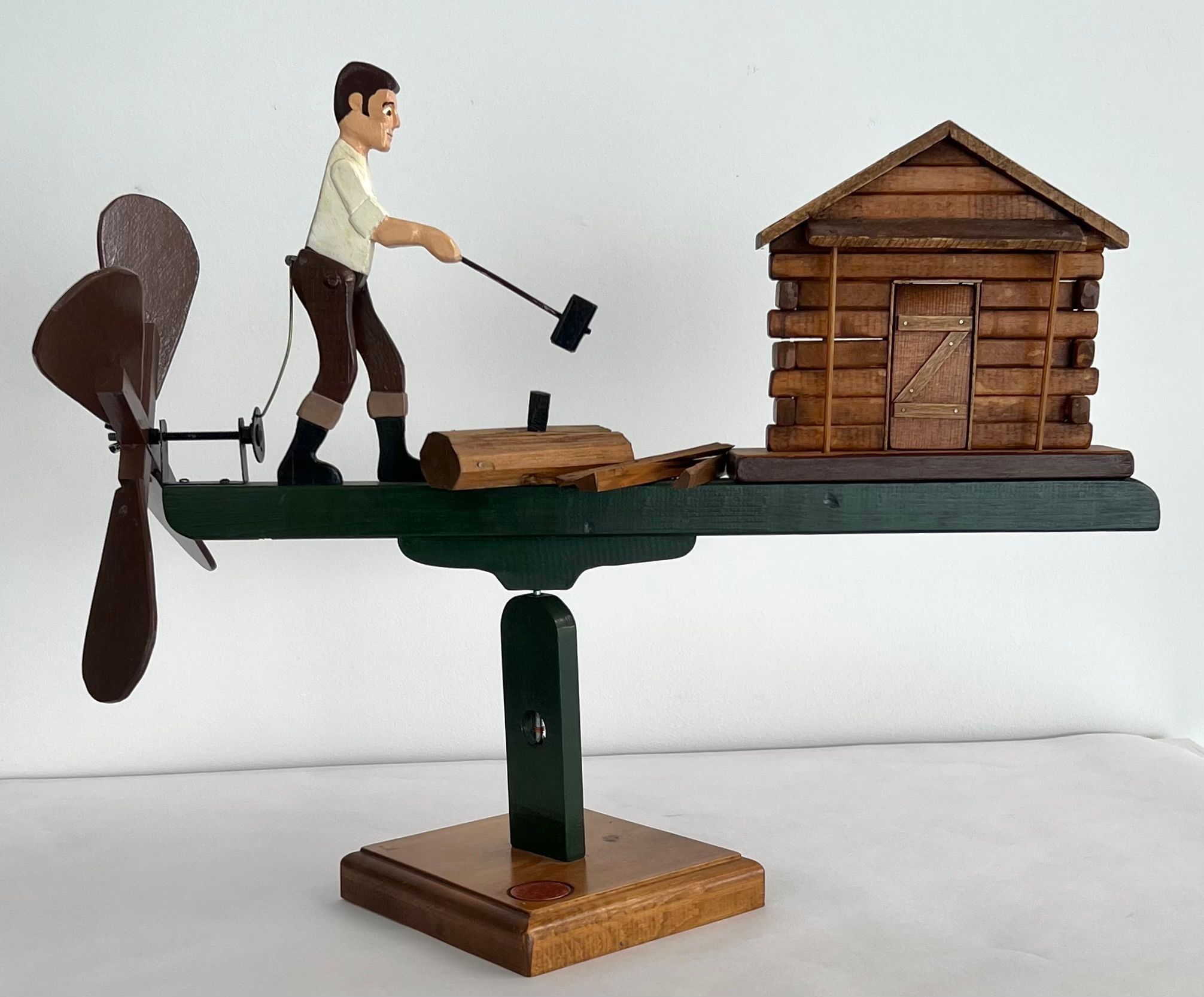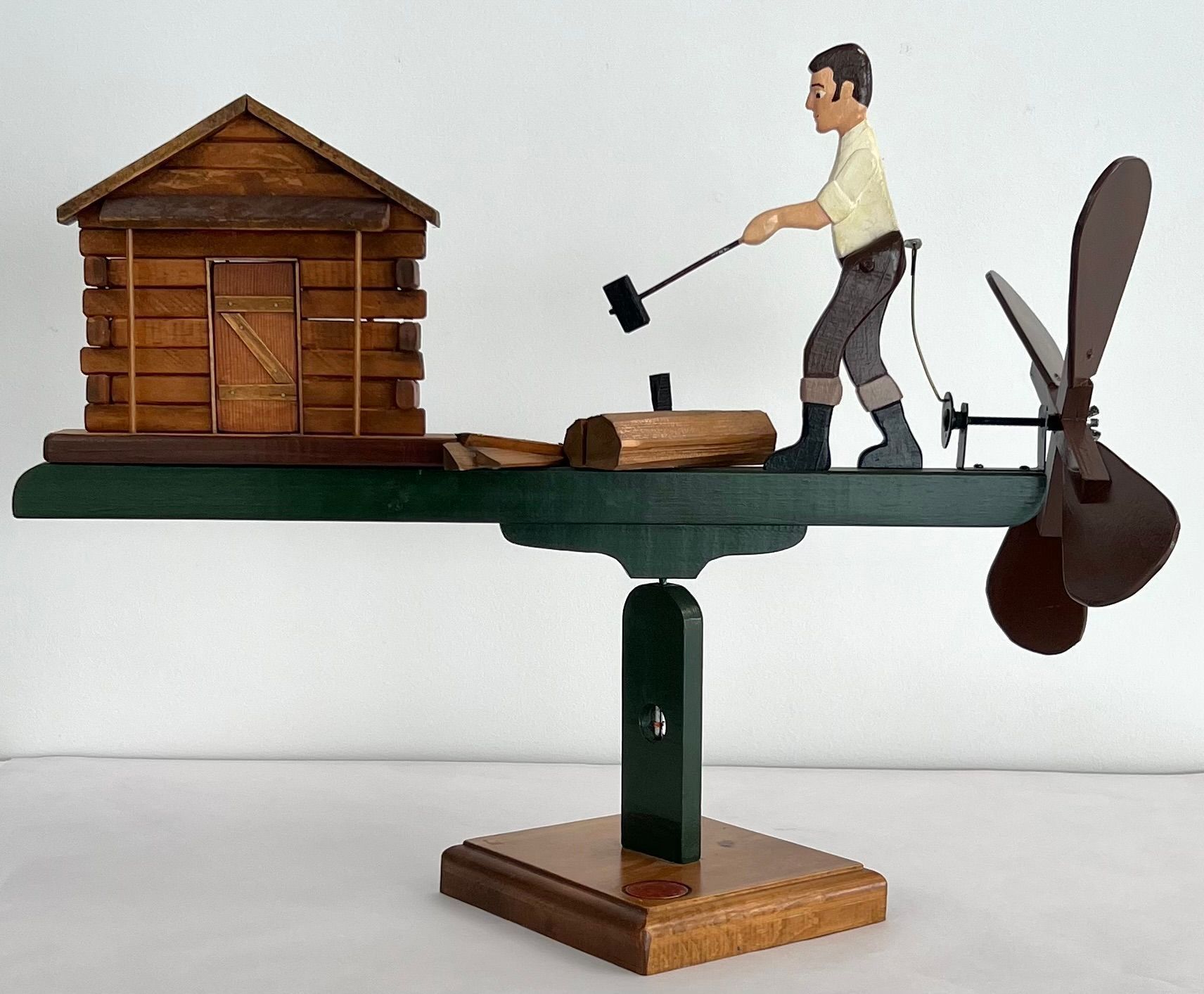 mostly green and brown/whirlygig propellow turns by wind and abe's arms move raising and lowering sledgehammer to appear that he is driving a wedge into a length of wood. Next to him is a log cabinsigned Len Norman on baseCollection