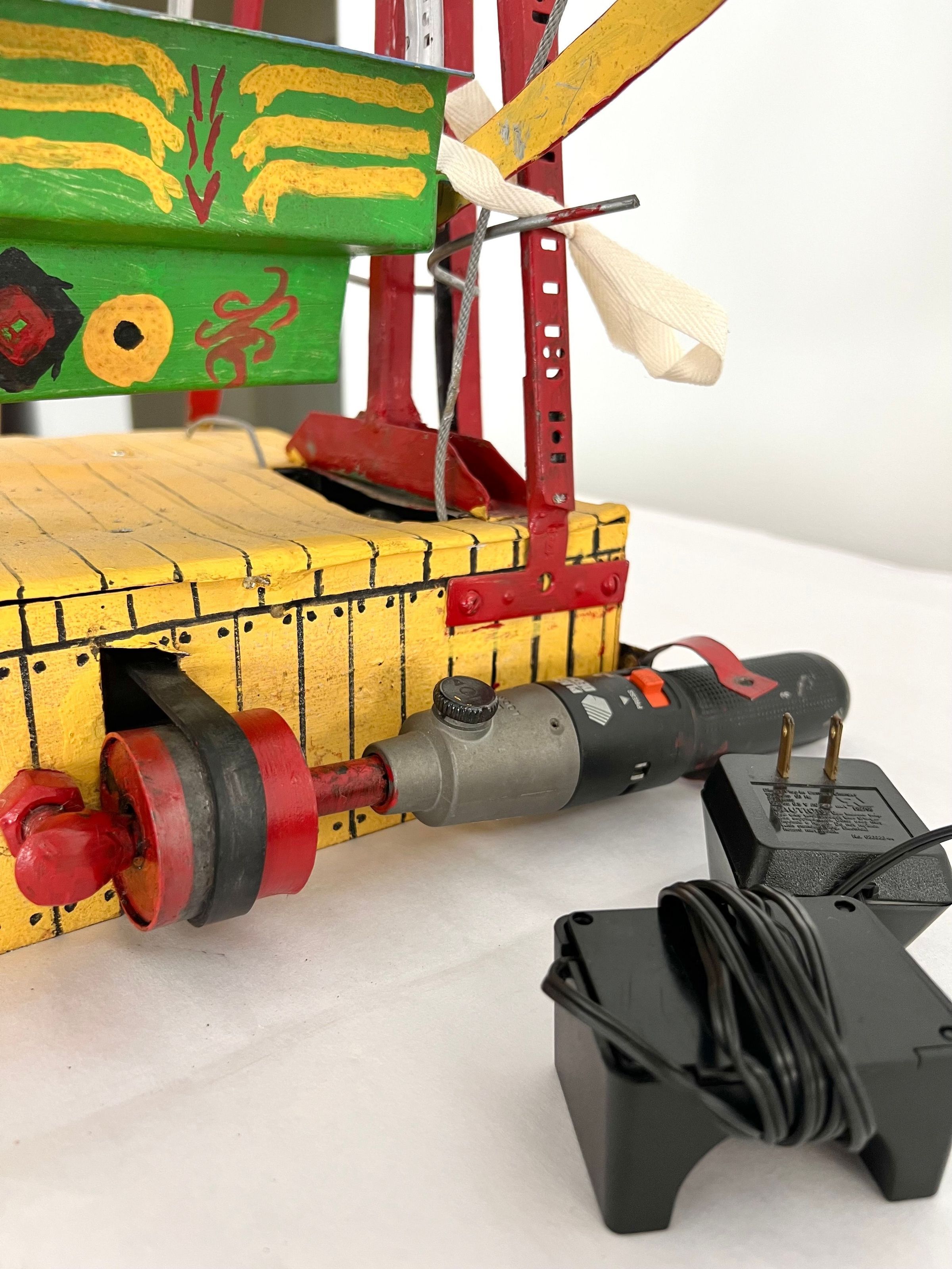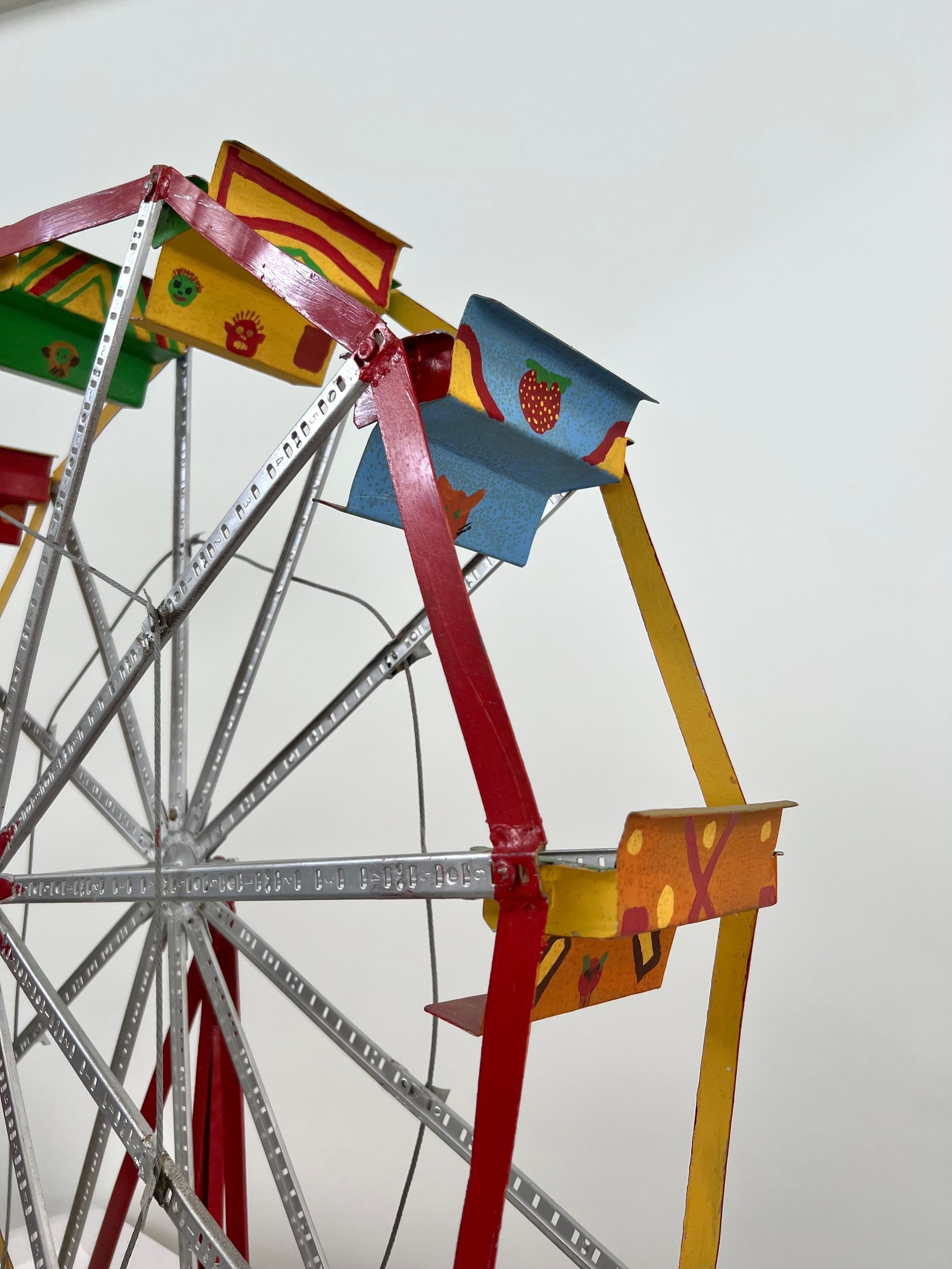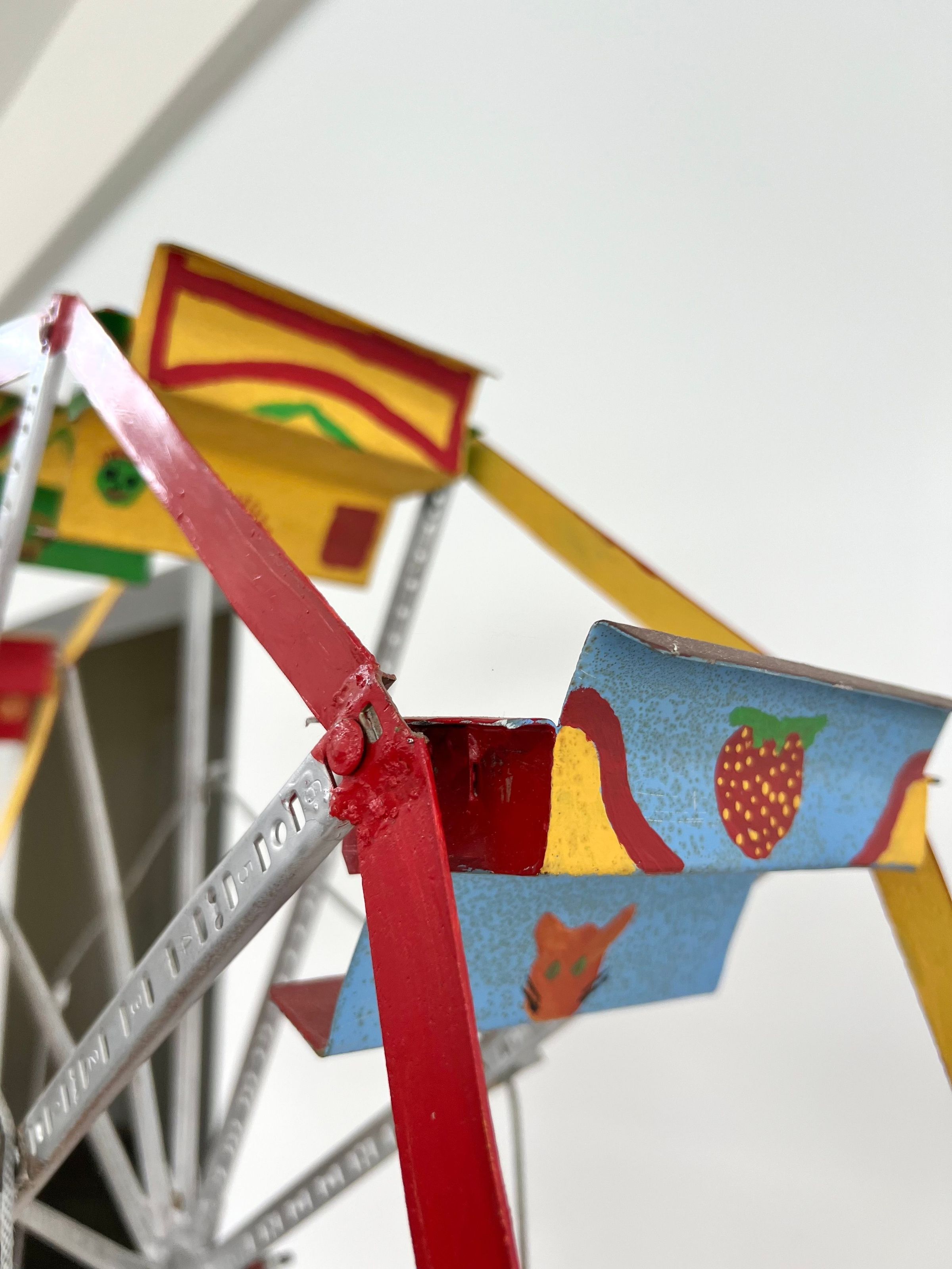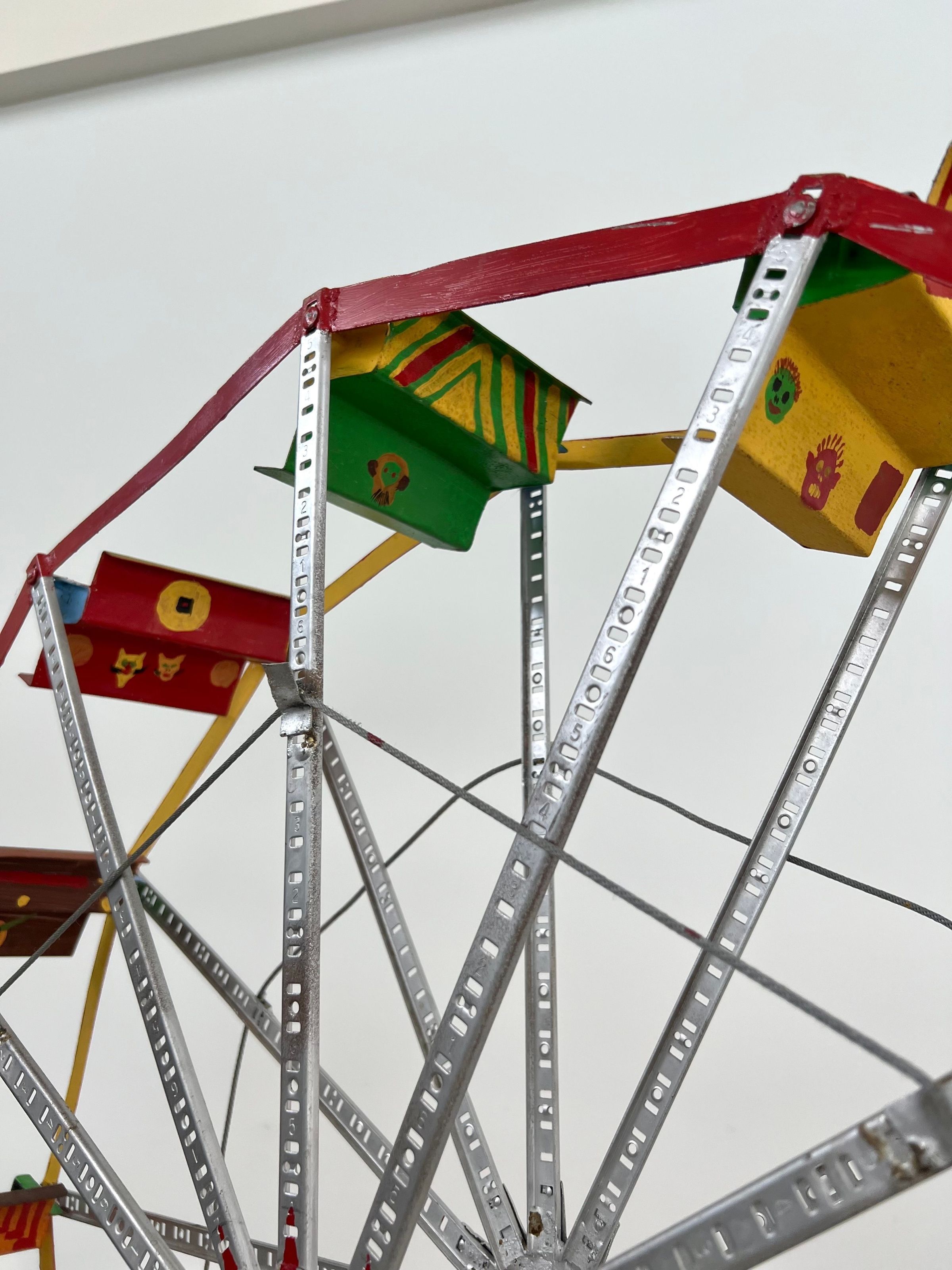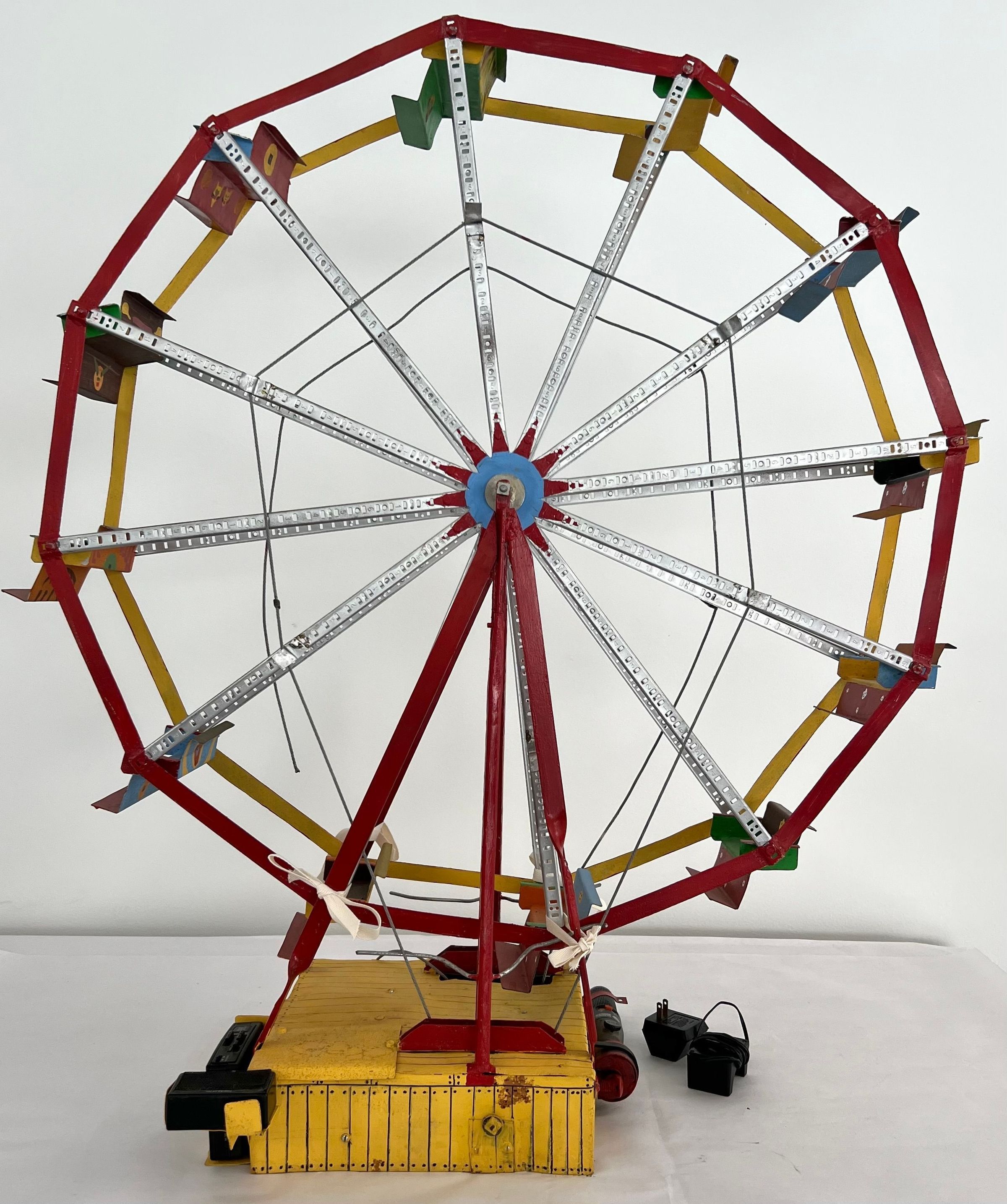 looks a little like an erector set seats are bent metal polychromed and have some sort of face on back of each one base for ferris wheel is hand formed sheet metal painted with red and yellow stripes/cordless screw driver is clamped to side of base for powering the wheelCollection