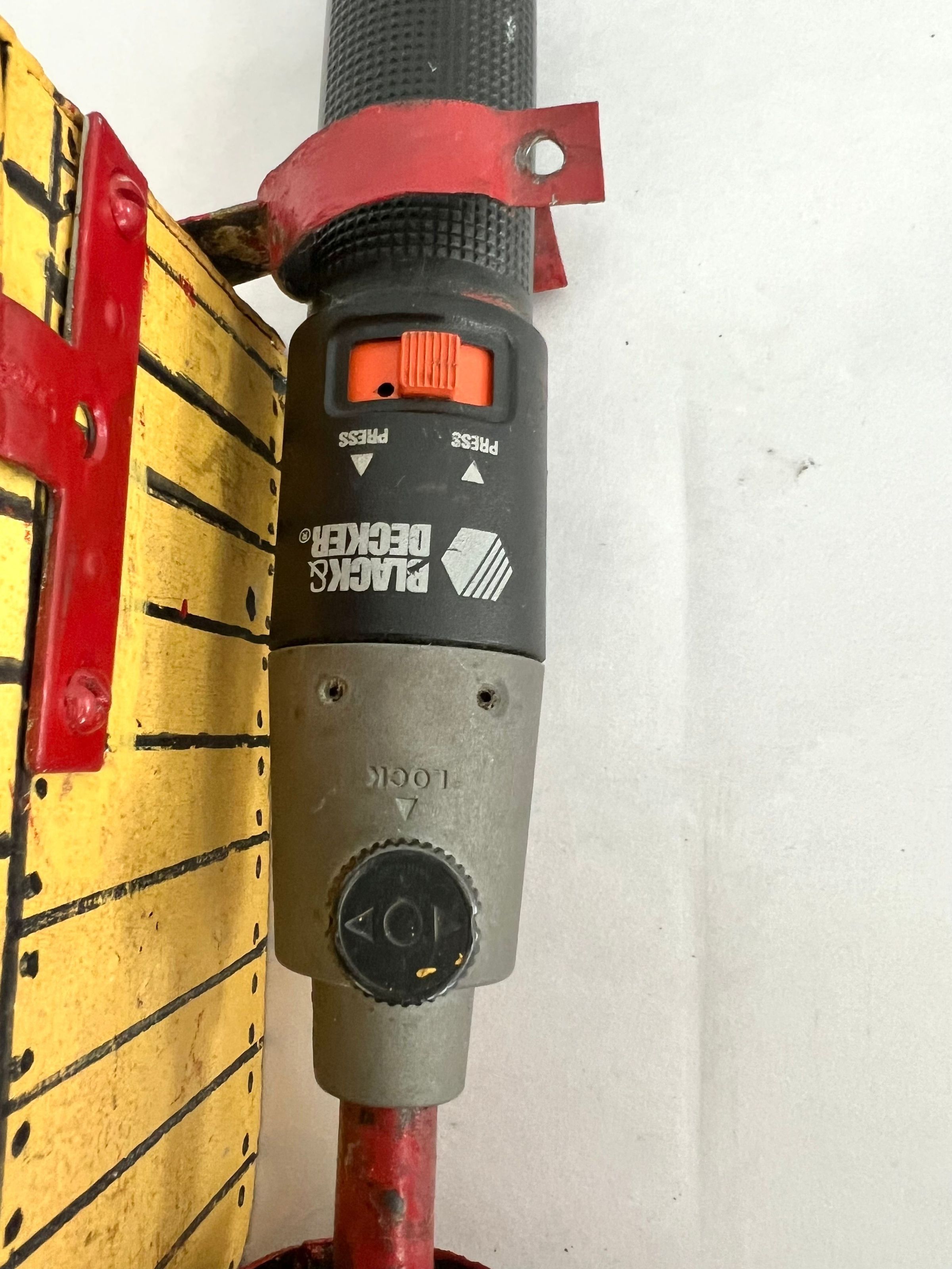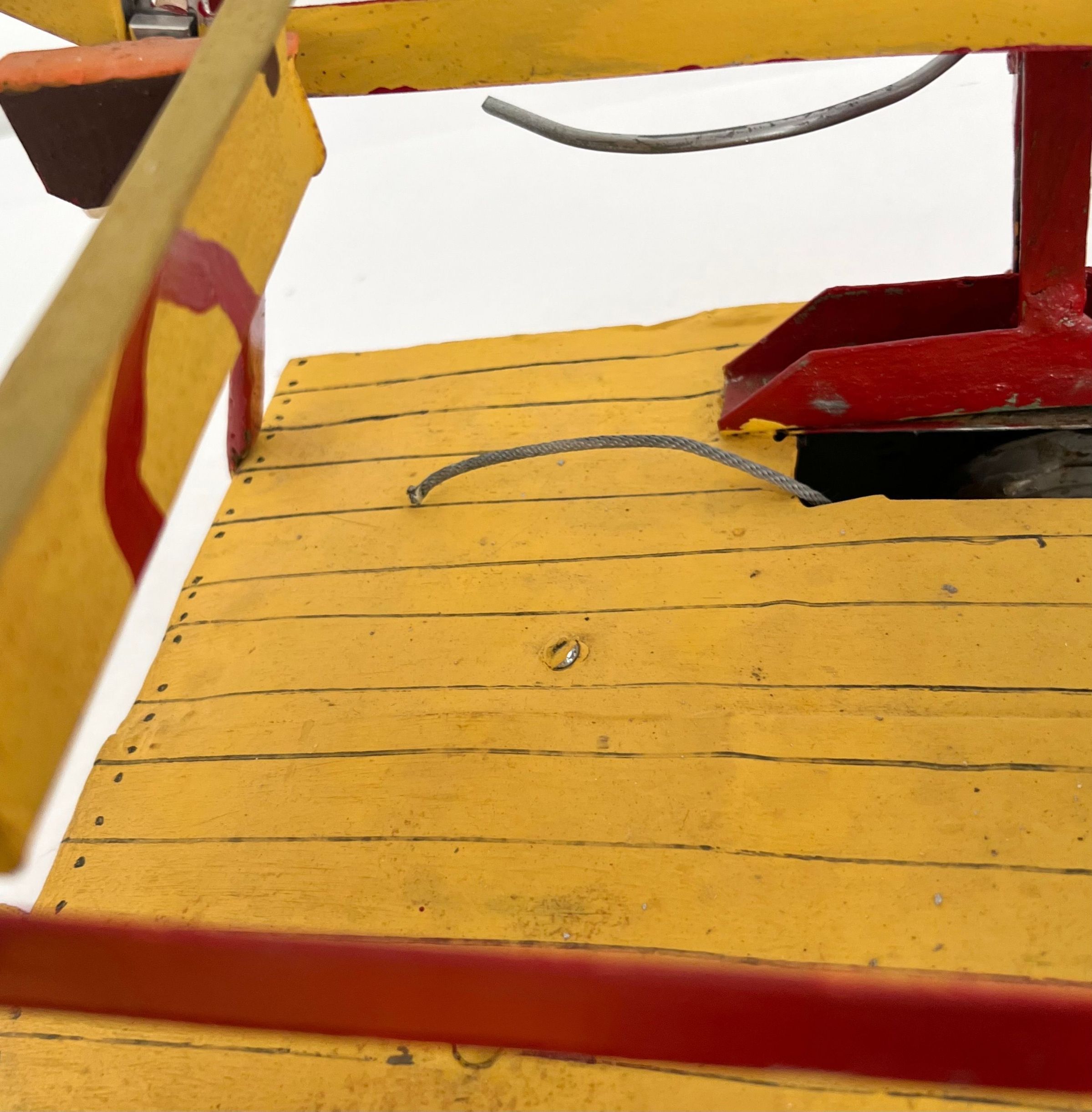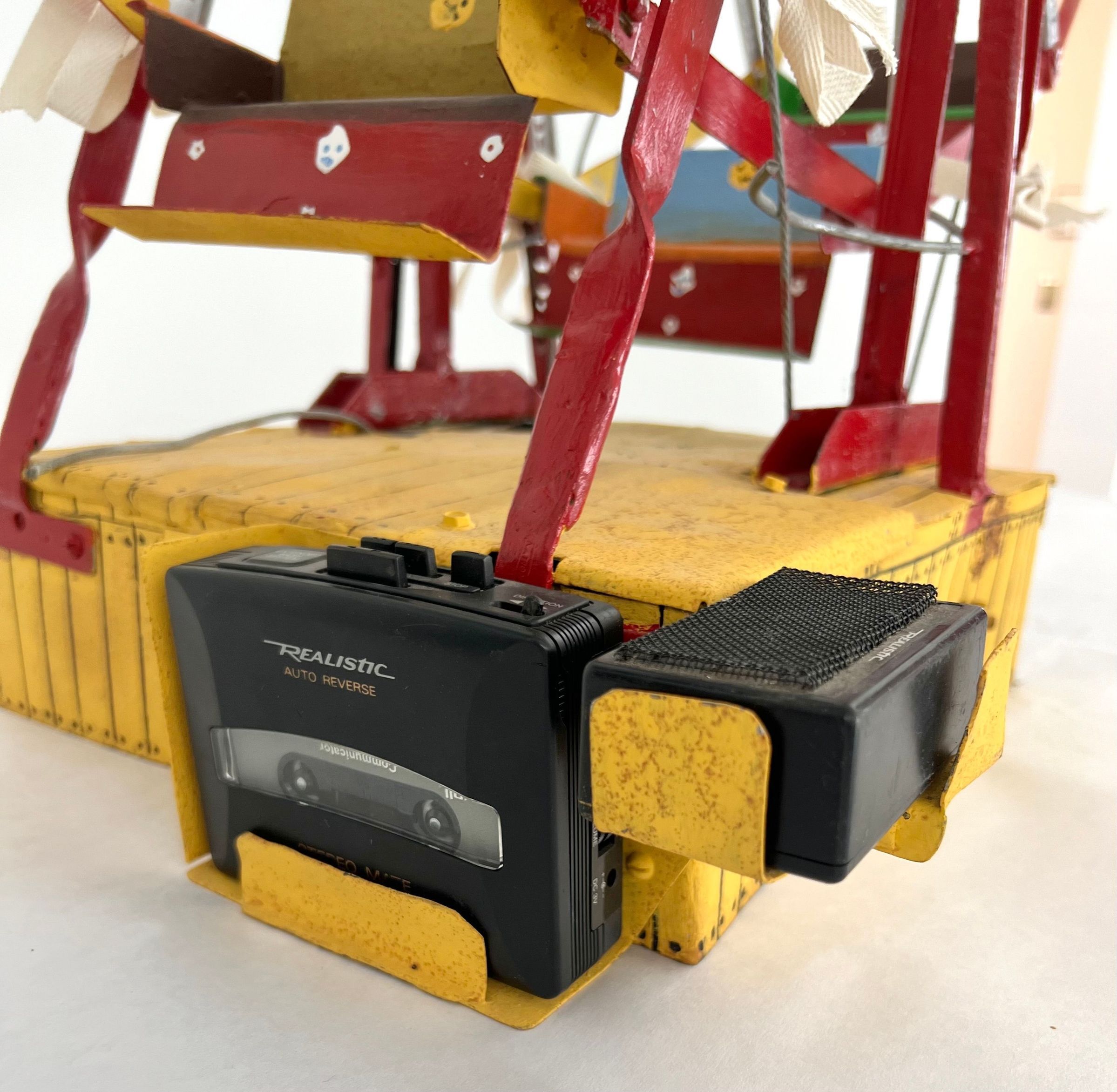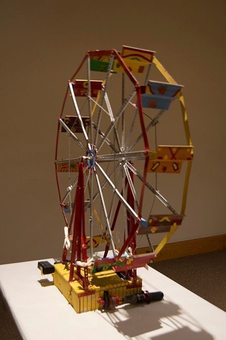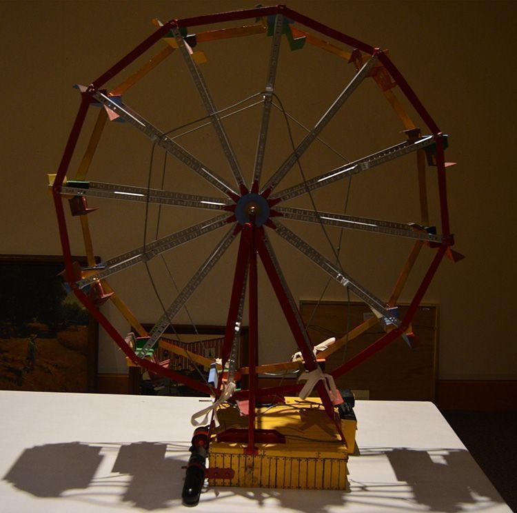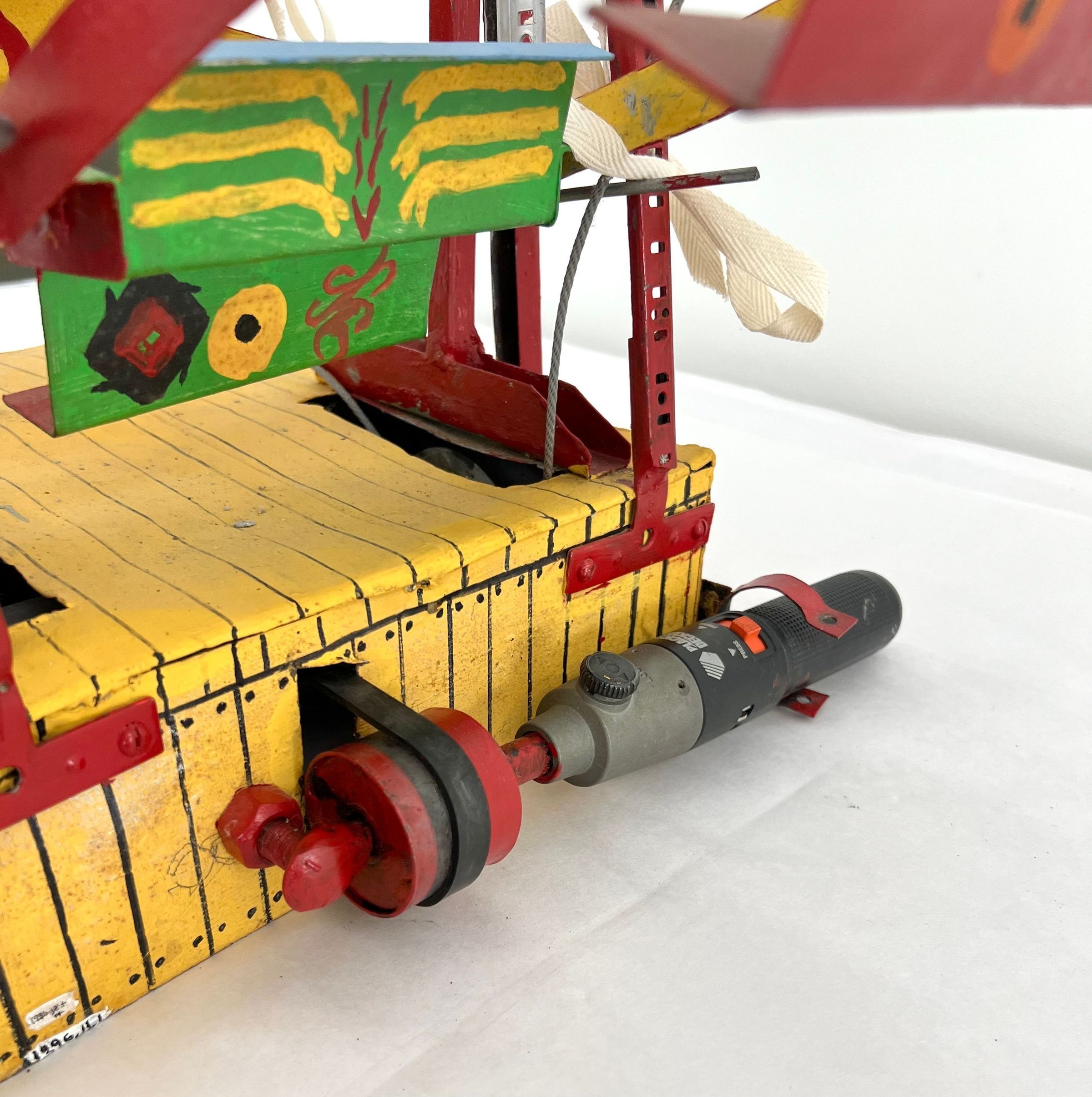 looks a little like an erector set seats are bent metal polychromed and have some sort of face on back of each one base for ferris wheel is hand formed sheet metal painted with red and yellow stripes/cordless screw driver is clamped to side of base for powering the wheelCollection