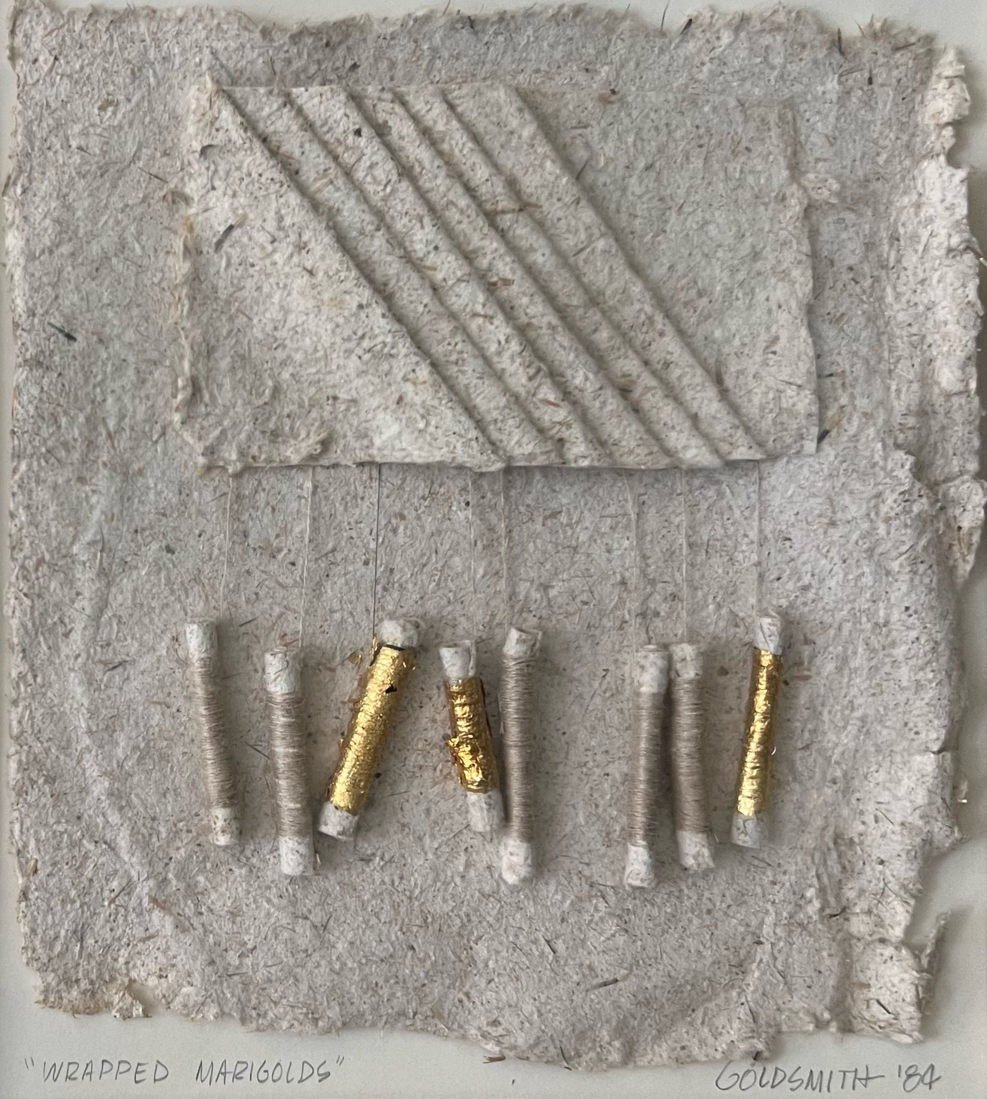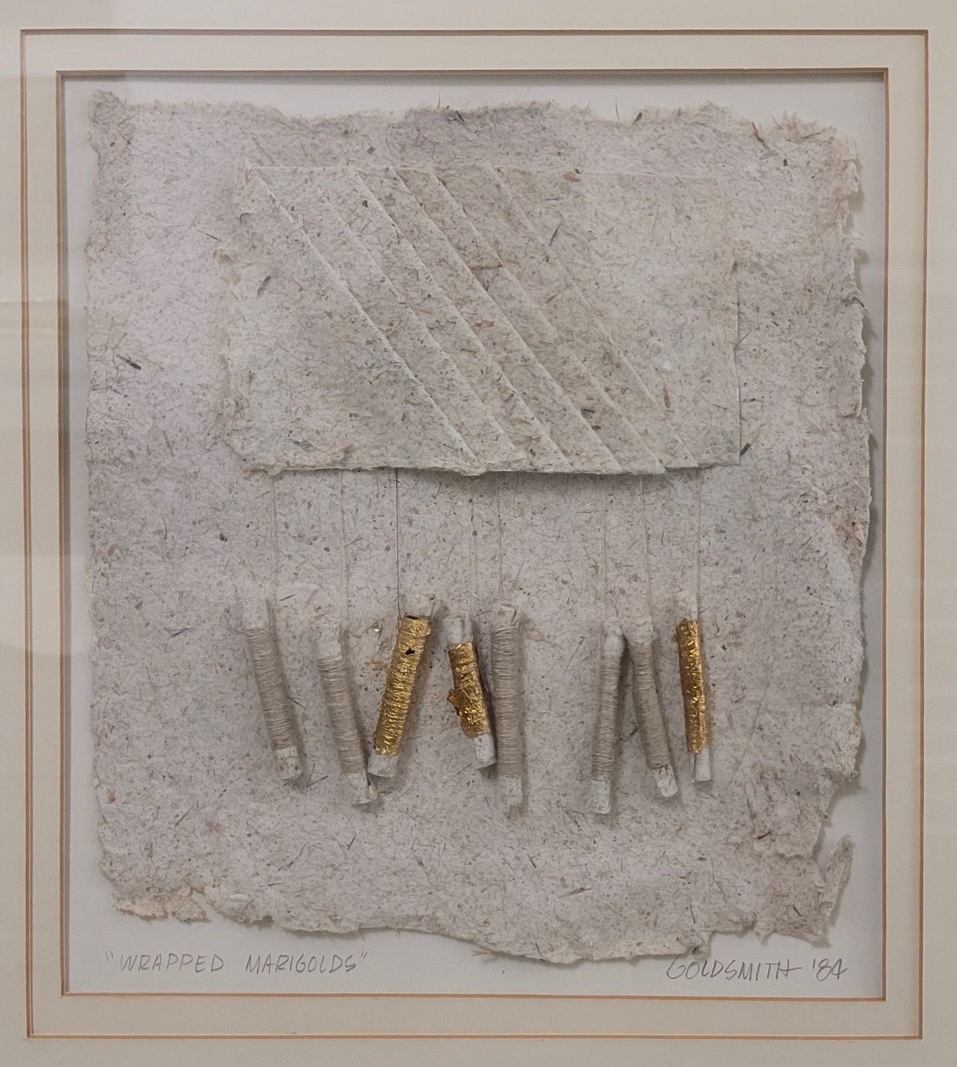 Handmade paper piece, free and mounted with deckled edge. Paper is greyish-brown in color, has straw pieces and black fibers throughout. Rectangular piece (folded 6 times at left angle). Dominations upper portion of work. 8 rolled tubular pieces (app. 3" in length) suspend from rectangular portion by light brown threads, 3 wrapped in gold leaf.. Singed Goldsmith, 84 in lower right. Mounted on white mat board, doubled matted in creme, a glass covering, silver metal frame.Artwork Details