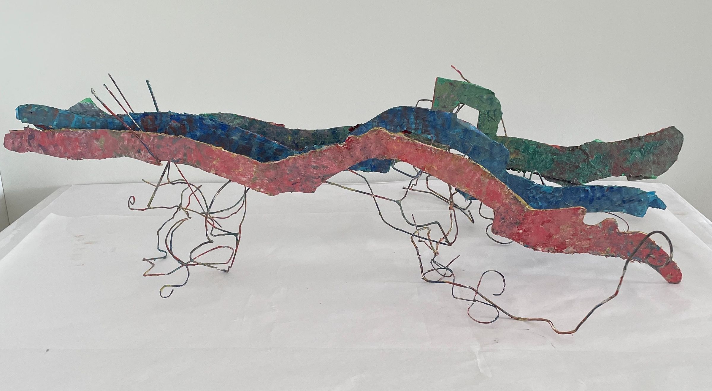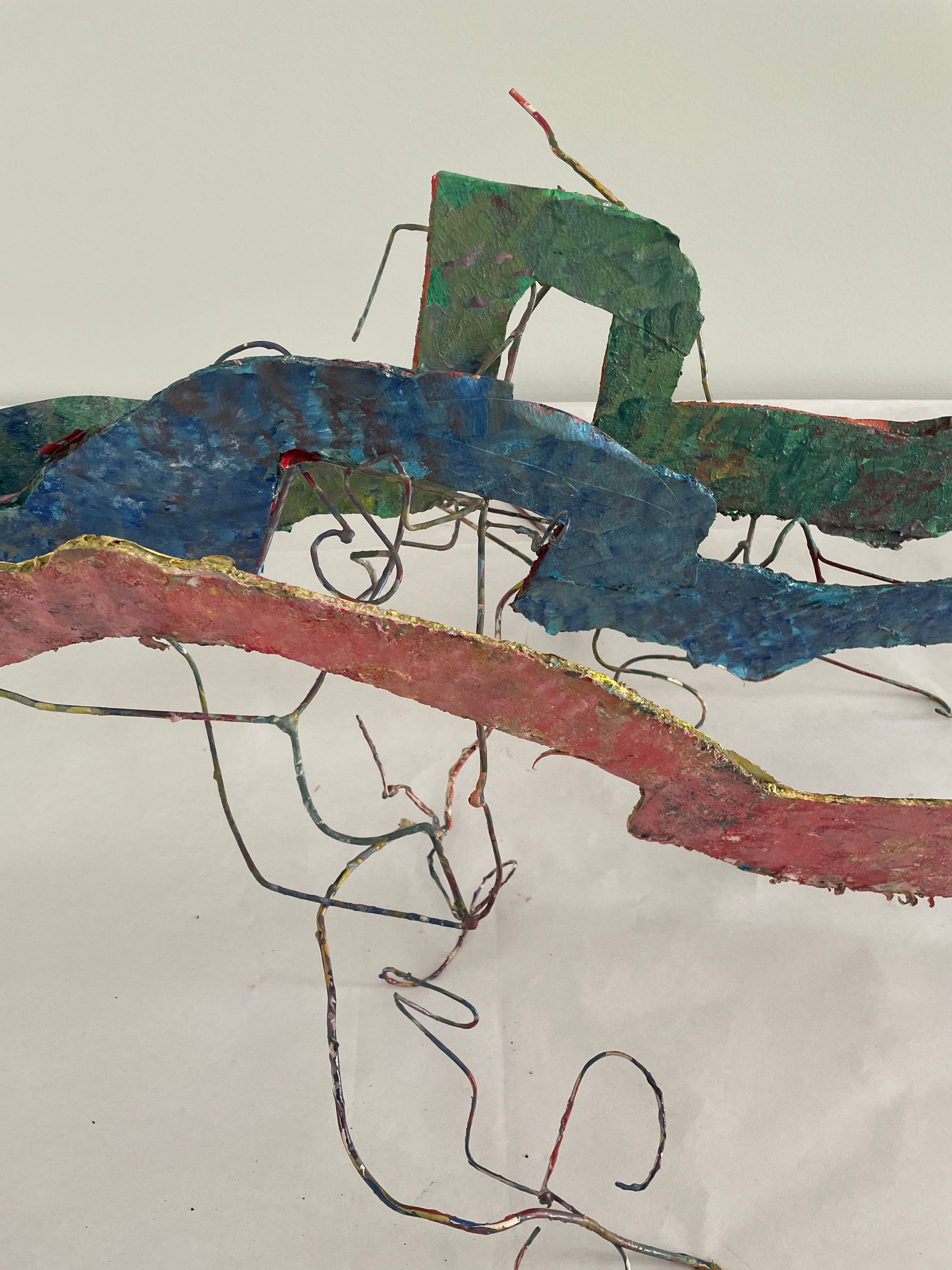Wire and particle board, 3 dimensional object painted in a variety of colors. Wire twisted and welded together painted drip style. 3" long 1/4" thick organic forms going across. Basically pink, another blue and other green.Artwork Details