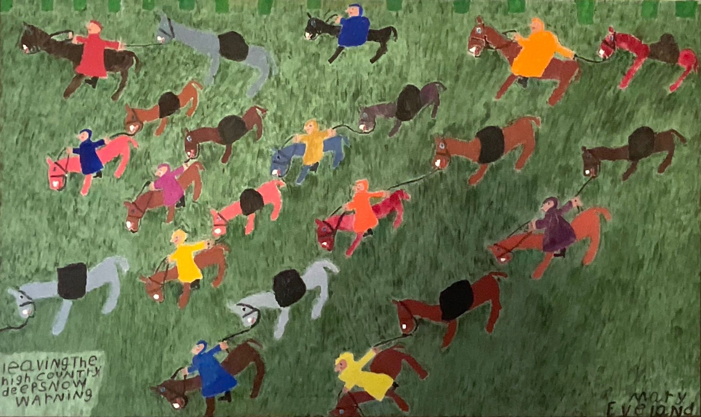Green, textured, grassy background. Repetition across composition in varying colors of coats riding and pulling on horse-like figures of different colors. Green square-esque shapes line the top of the composition. Black wording is in the bottom left of the composition, atop a desaturated green, with a signature in black in the bottom right corner.Collection