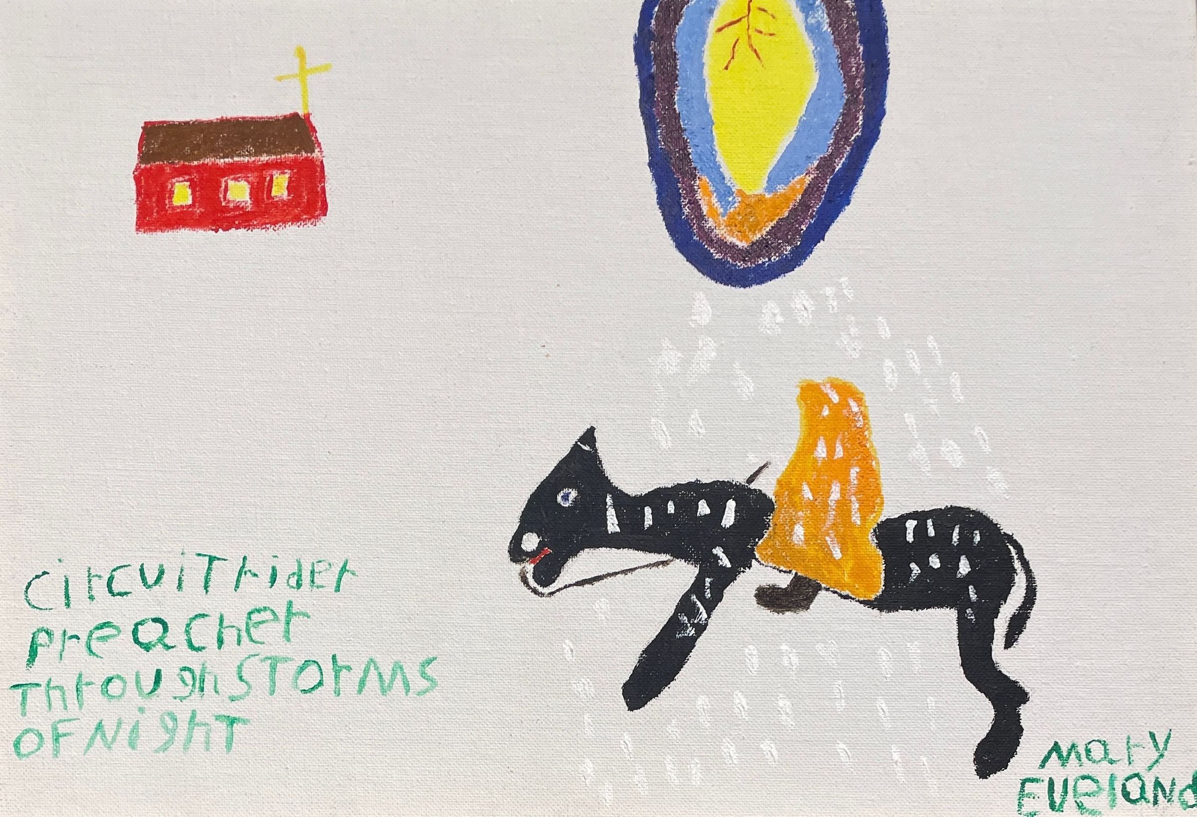 White background. Orange figure on black horse-like figure on bottom right of canvas. Colored orb above horse at top of canvas. A church like structure at the top left of the canvas. Green wording at the bottom left of the canvas as well as a green signature in the bottom right corner.Artwork Details