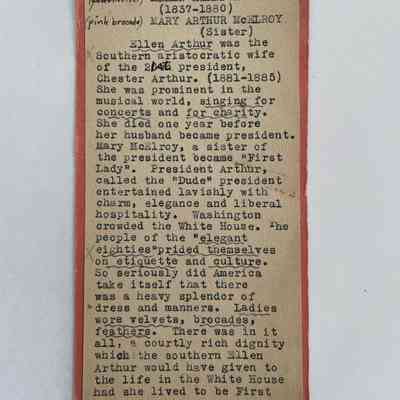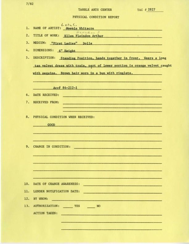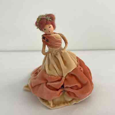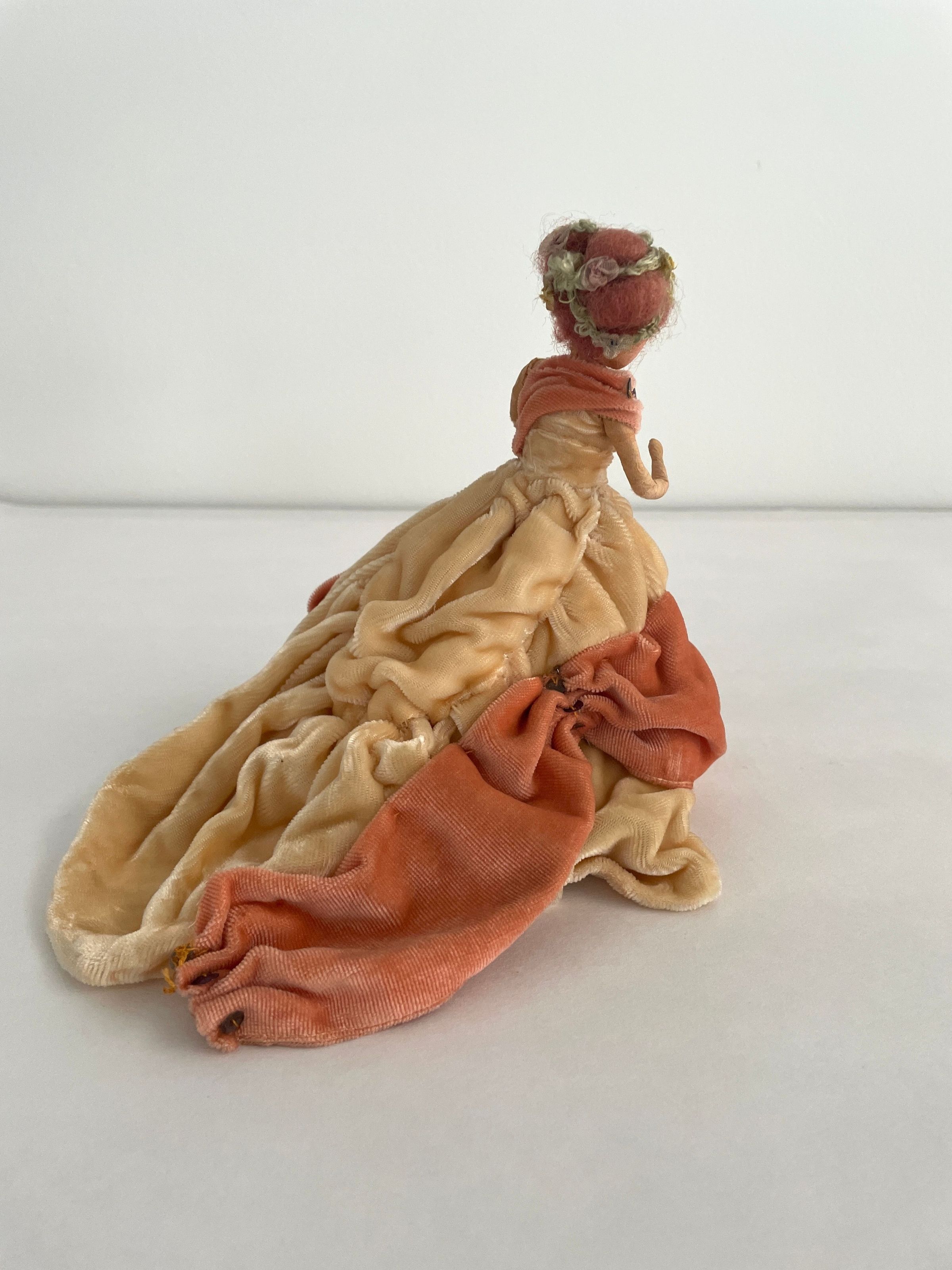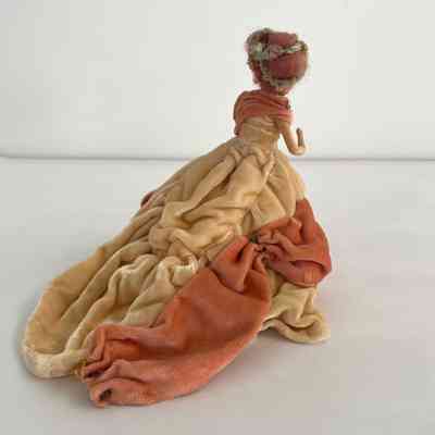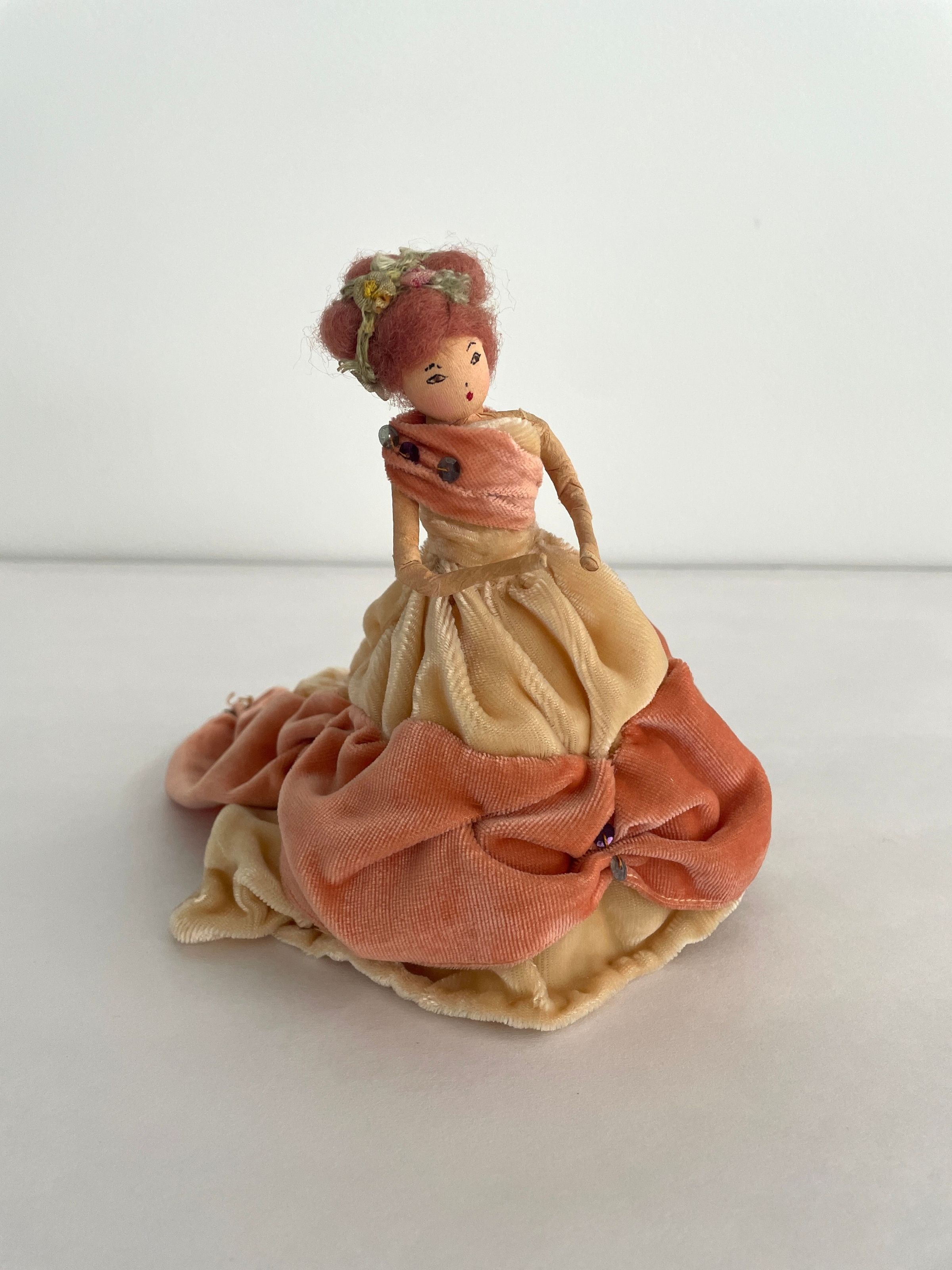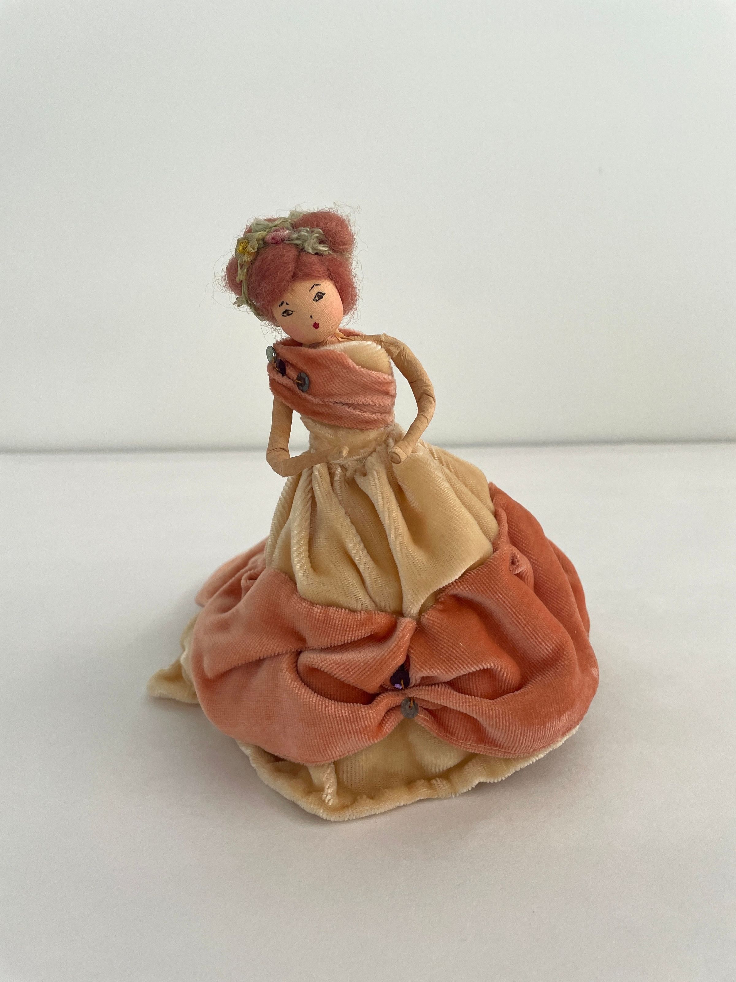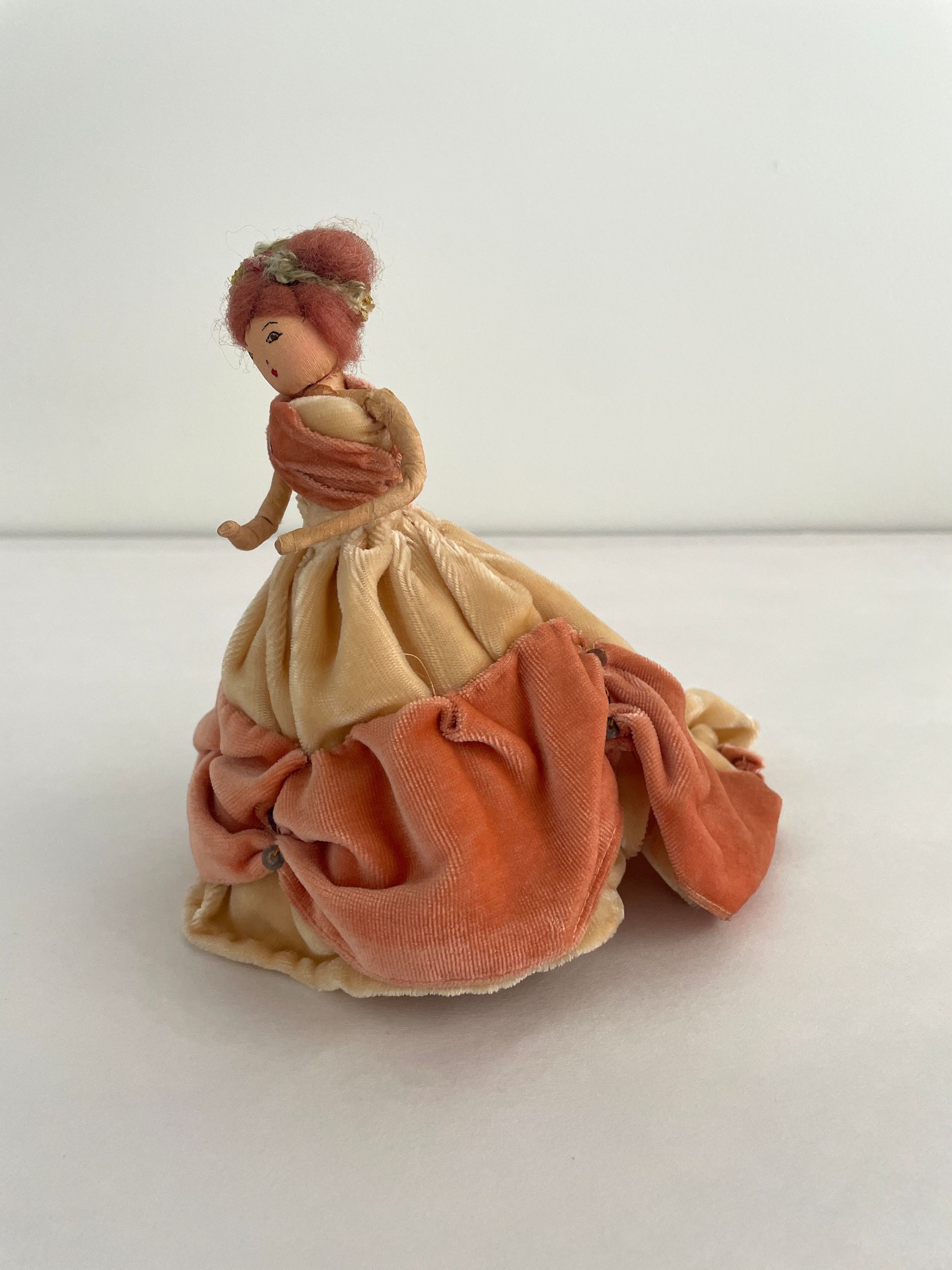Standing position, hands together in front. Wears a long tan velvet with train, part of lower portion is orange velvet caught with sequins. Brown hair worn in bun with ringlets.Collection