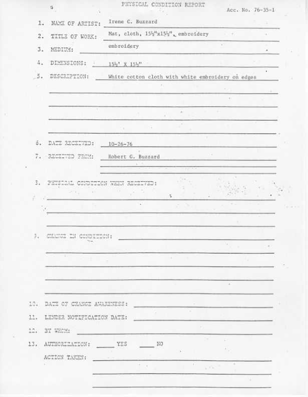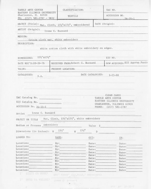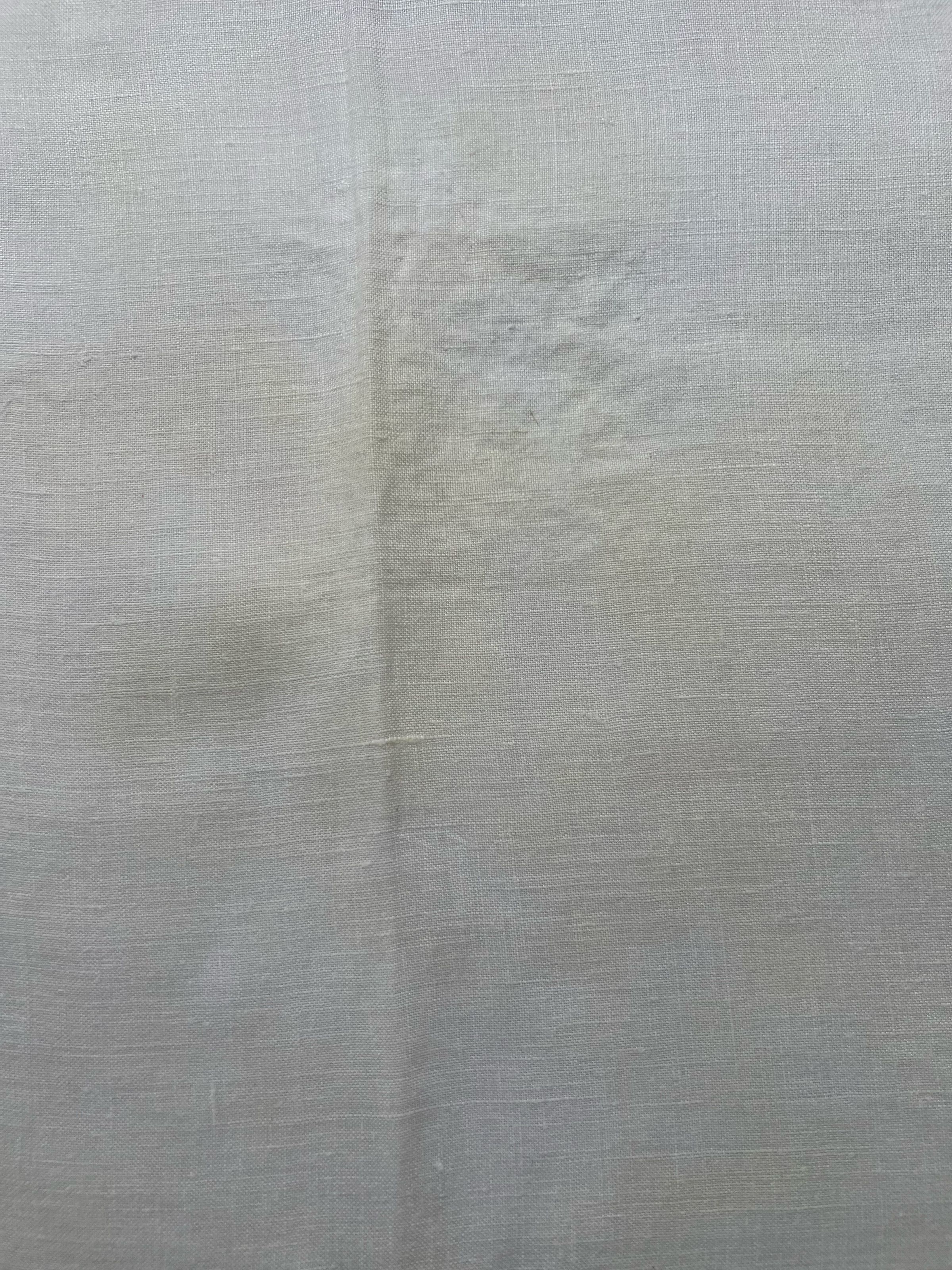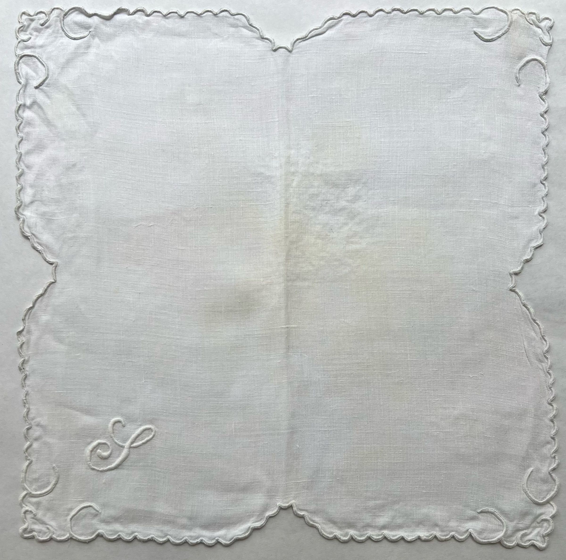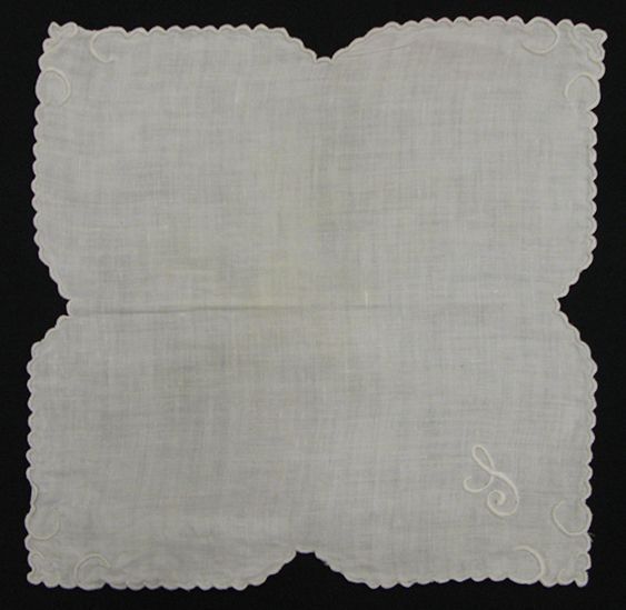 White cotton cloth with white embroidery on edges. Letter "I" monogram in lower right corner.Collection