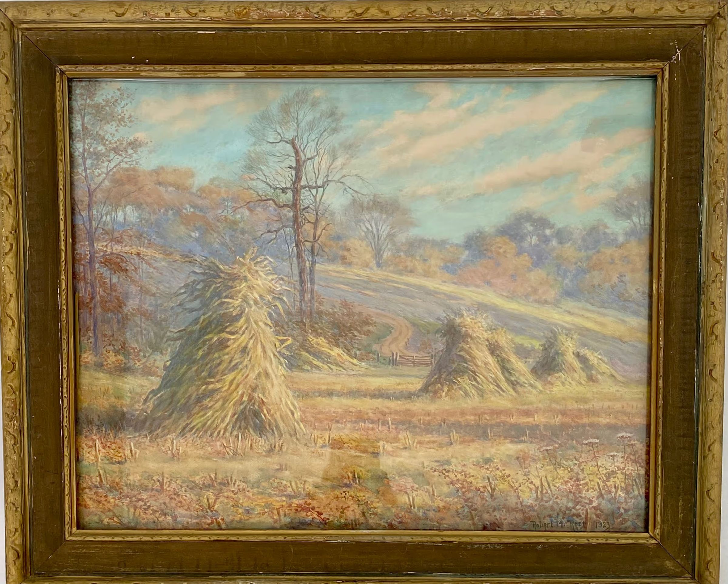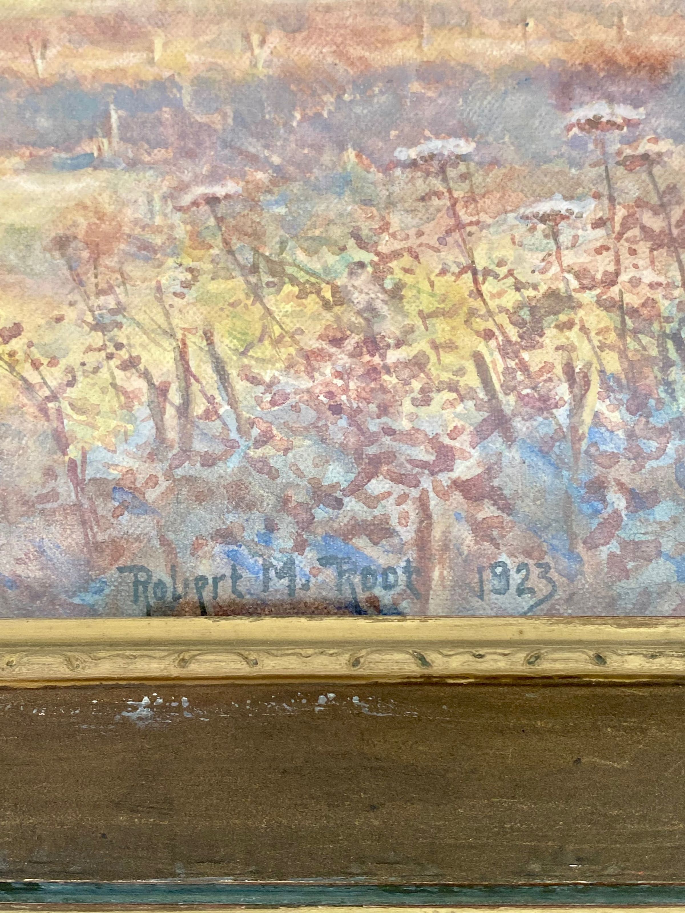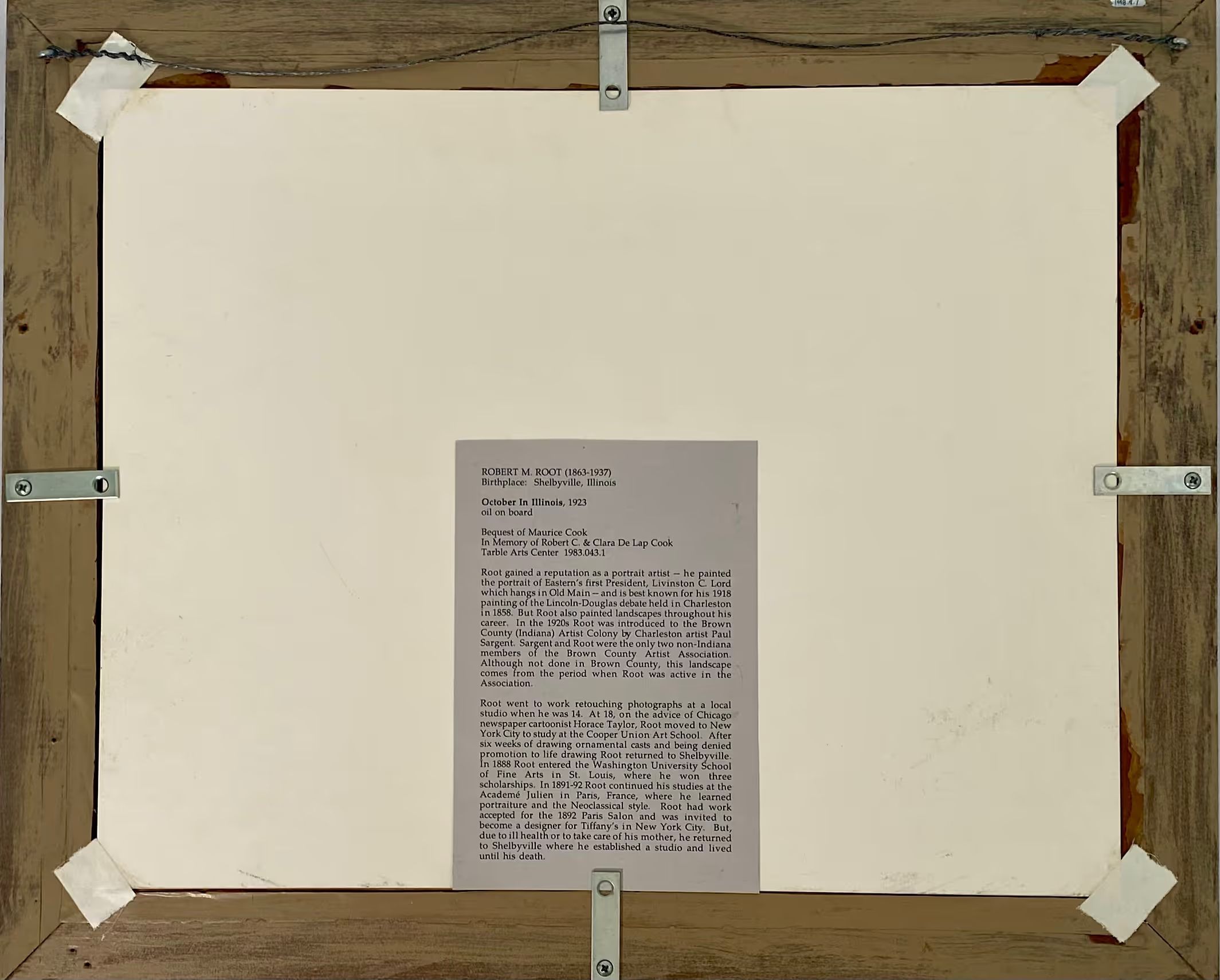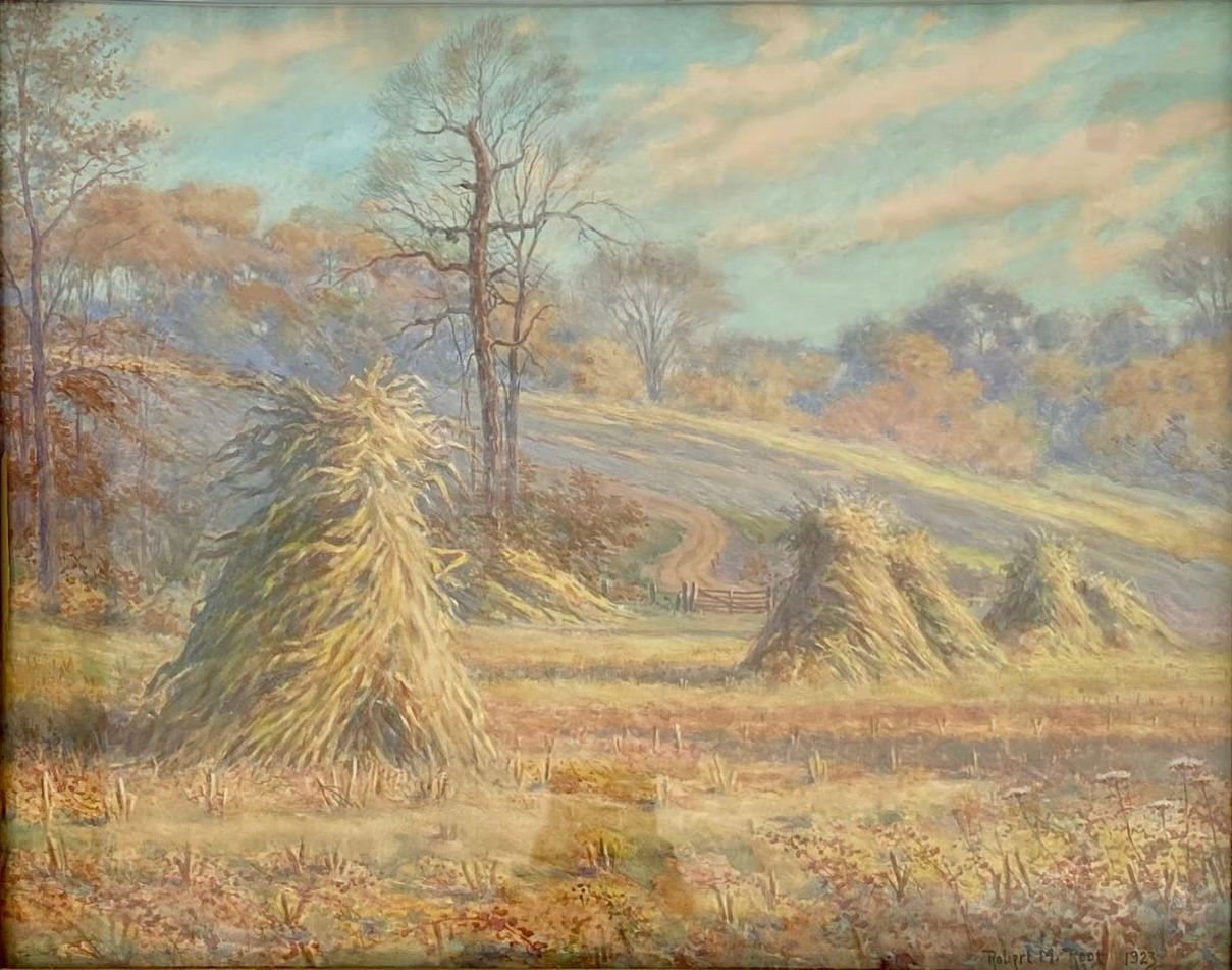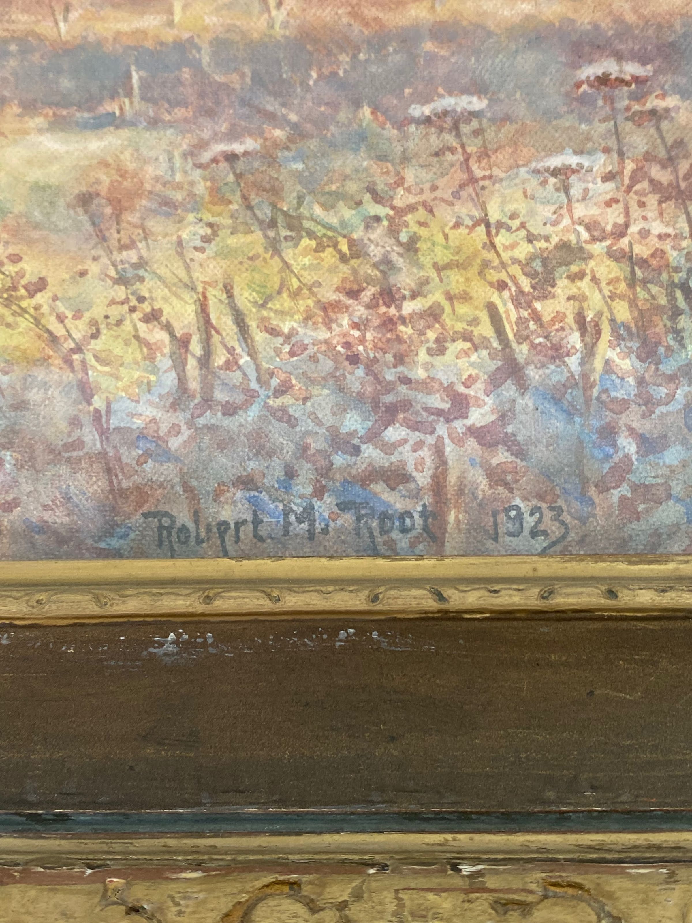 Fall scene of woods rolling fields and corn shocks predominately orange yellow and blues.Signed Robert M. Root 1923 lower right hand corner.Collection