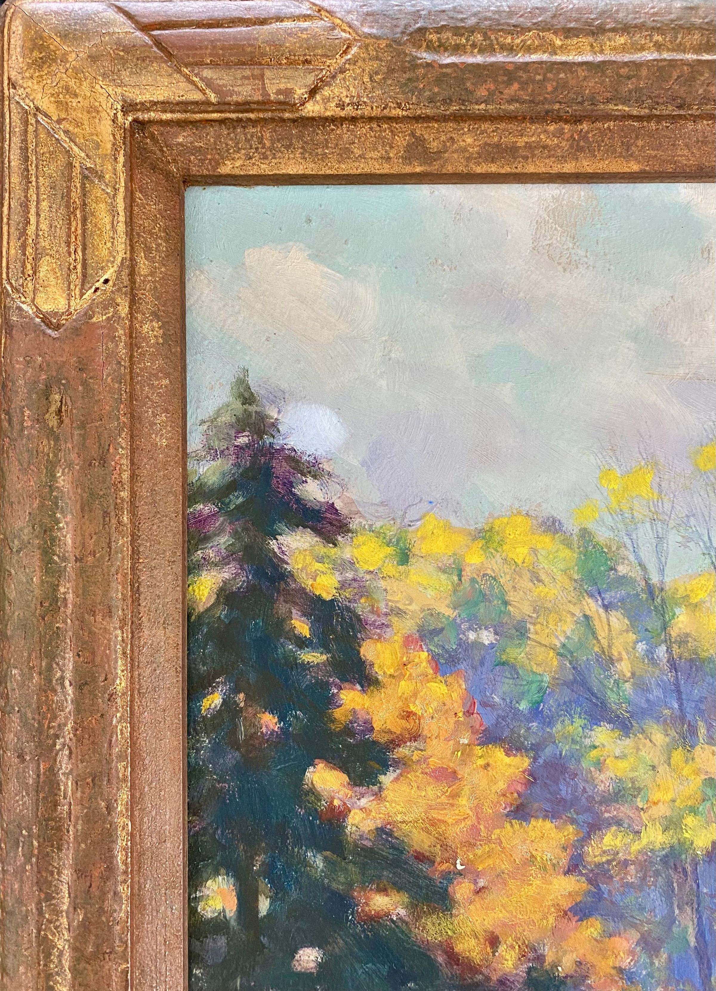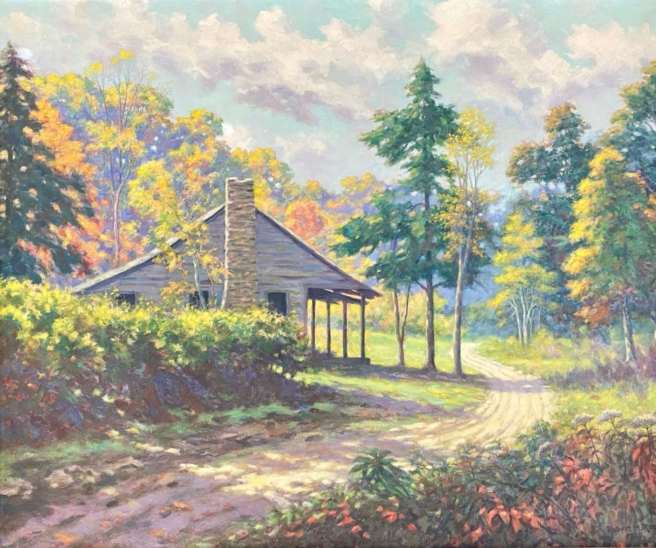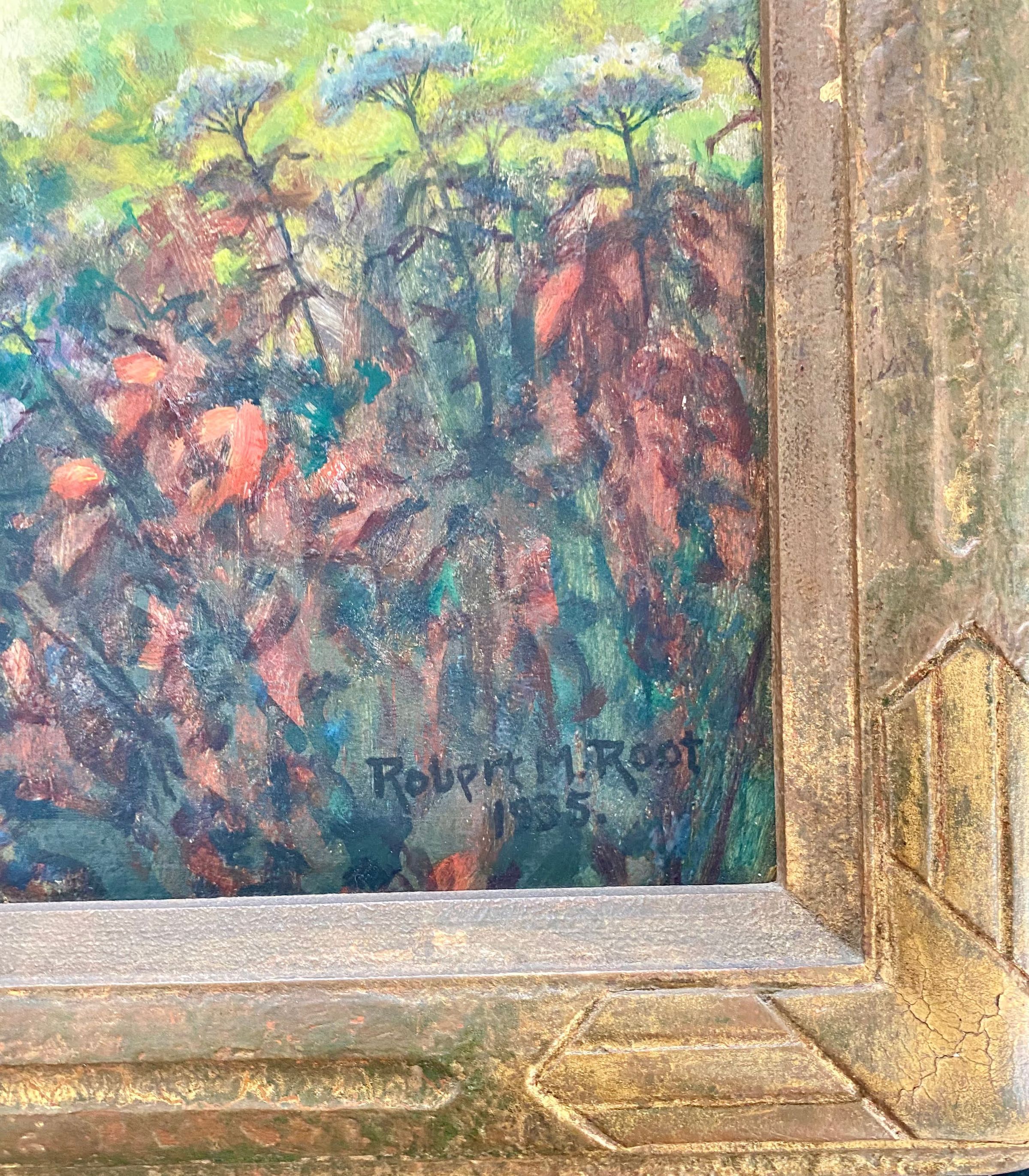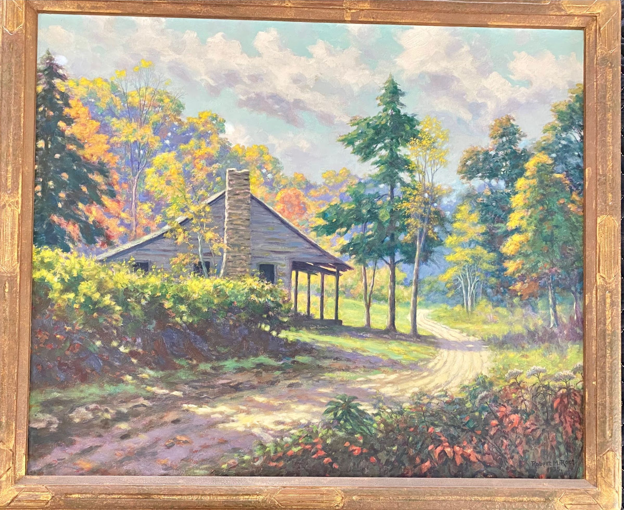 Fall scene of cabin in the woods with winding dirt road. predominately green yellow and orange signed Robert M. Root 1935 lower right corner hand carved frame.Collection
