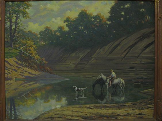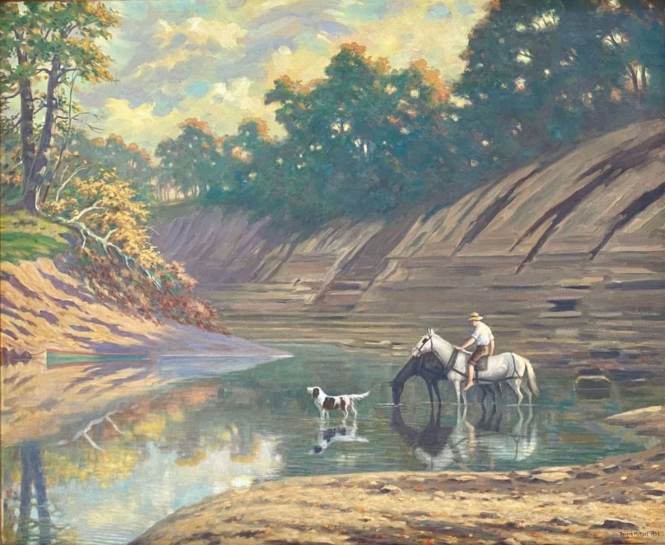 dog horse and rider wading in river steep river banks in backgroundCollection