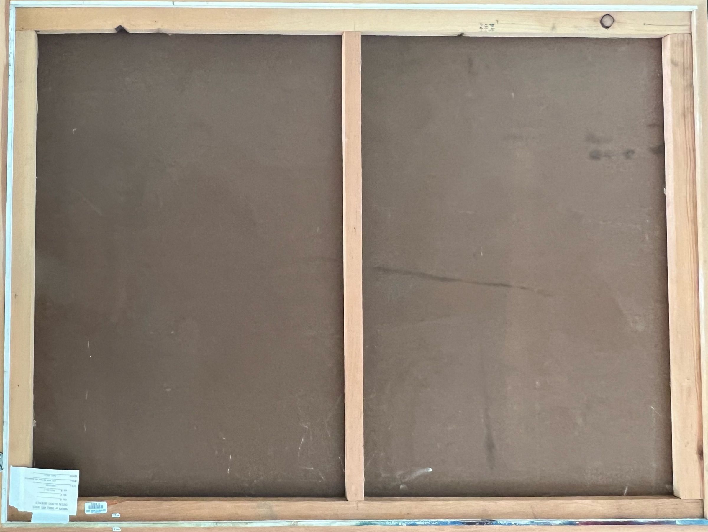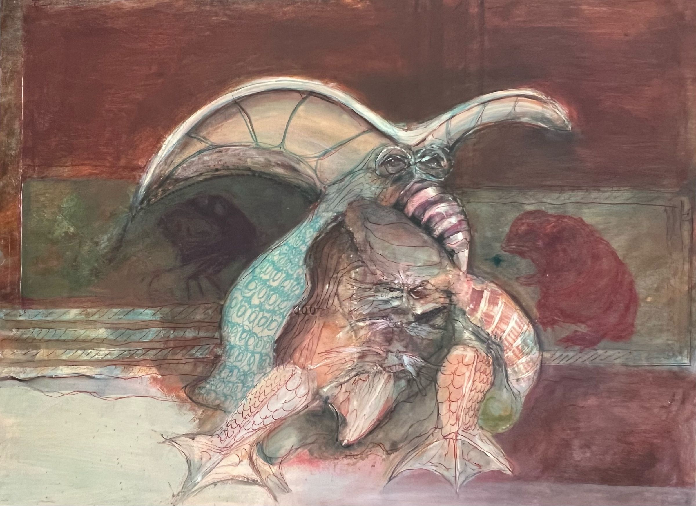 Non-objective images with fish scale detail. At center object with blue detail two realistic eyes and a black and white striped "beak." Below a set of eyes. Two fish-like bodies at lower center.Collection