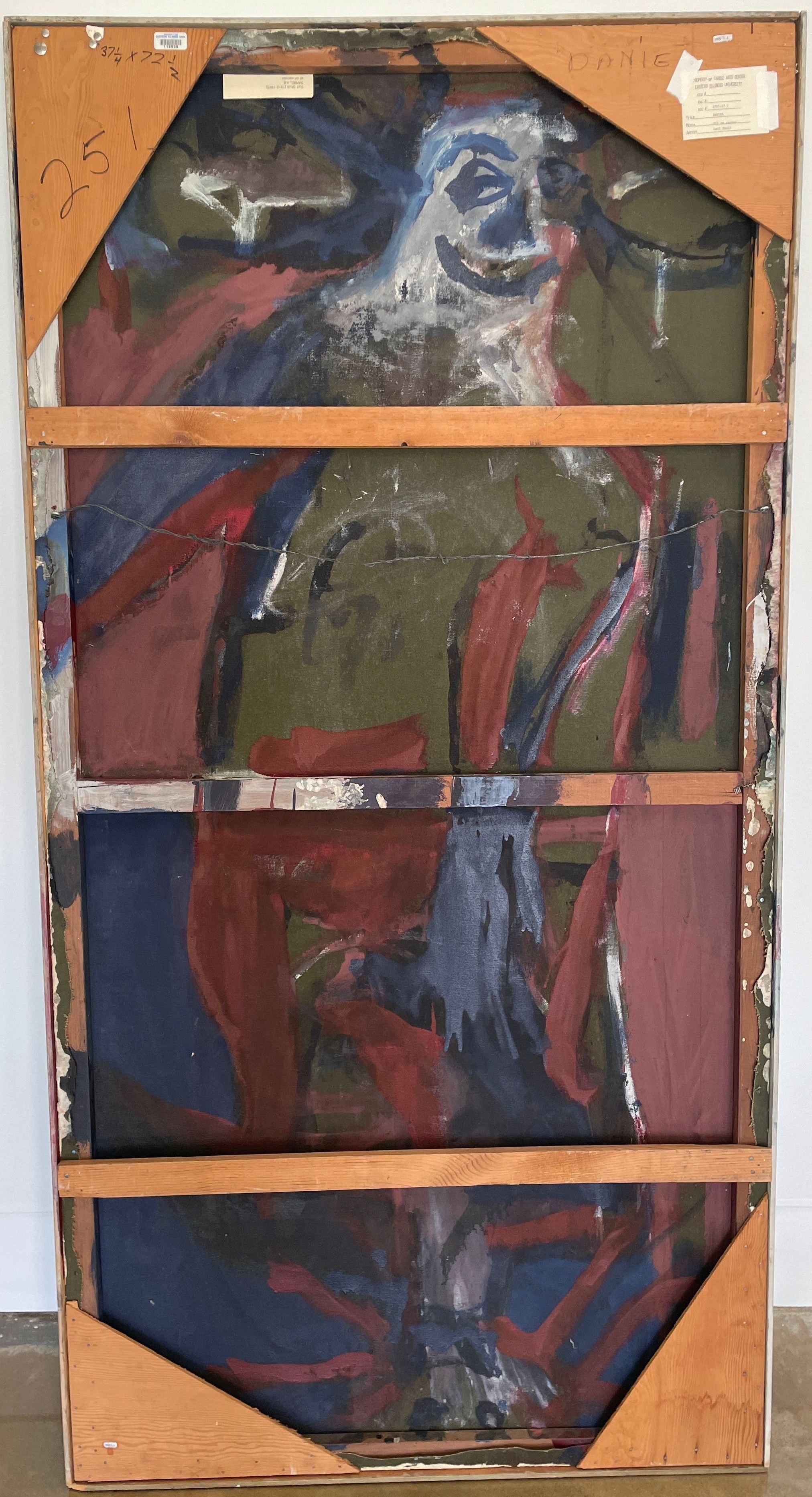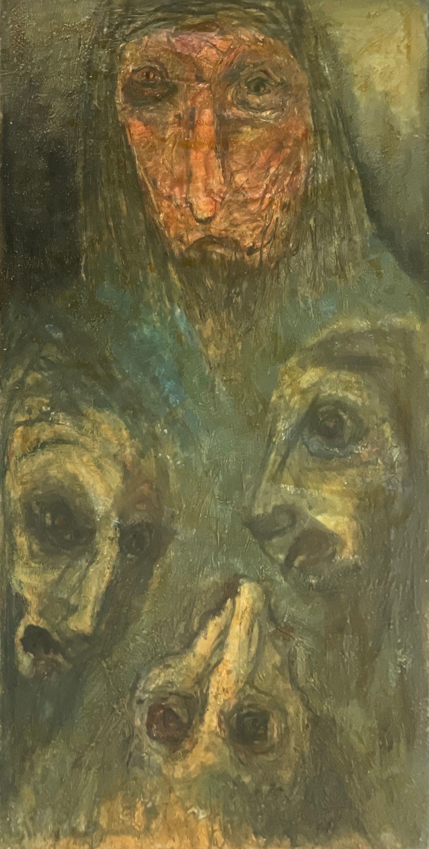 Muted colors greens and browns. One large human figure with gaunt emaciated face. Three sheep-like faces at bottom.Collection