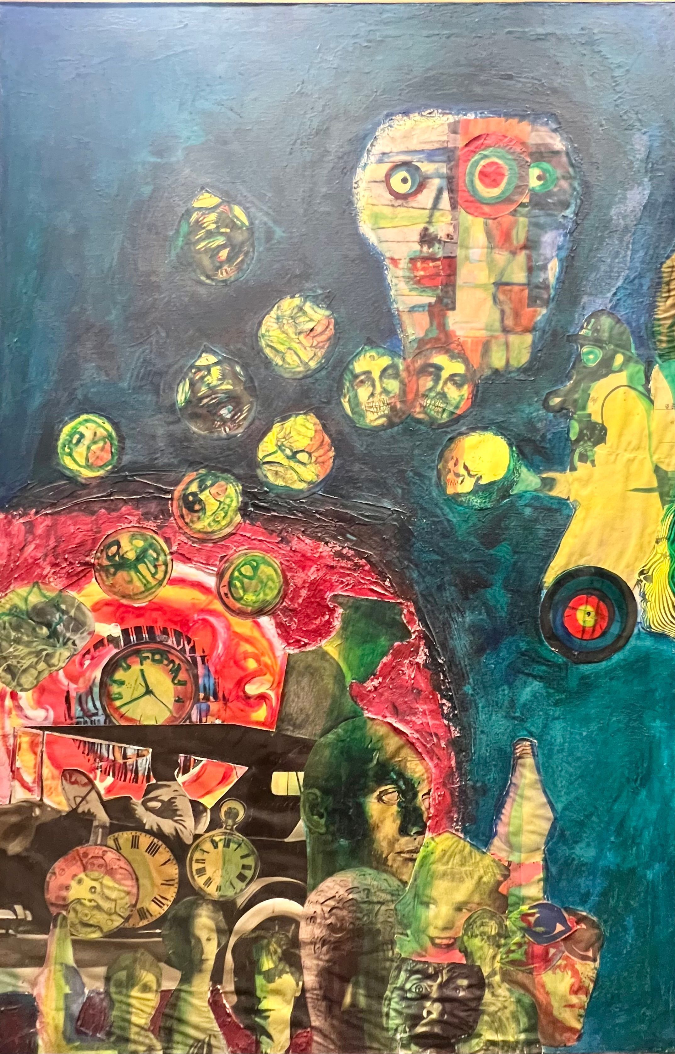 Vertical collage of human faces and clock faces on a large blue-green painted board. Circular magazine cut outs of faces and shapes in a random pattern. Central to lower left faces of humans and clocks cut from magazines applied to the board.Collection