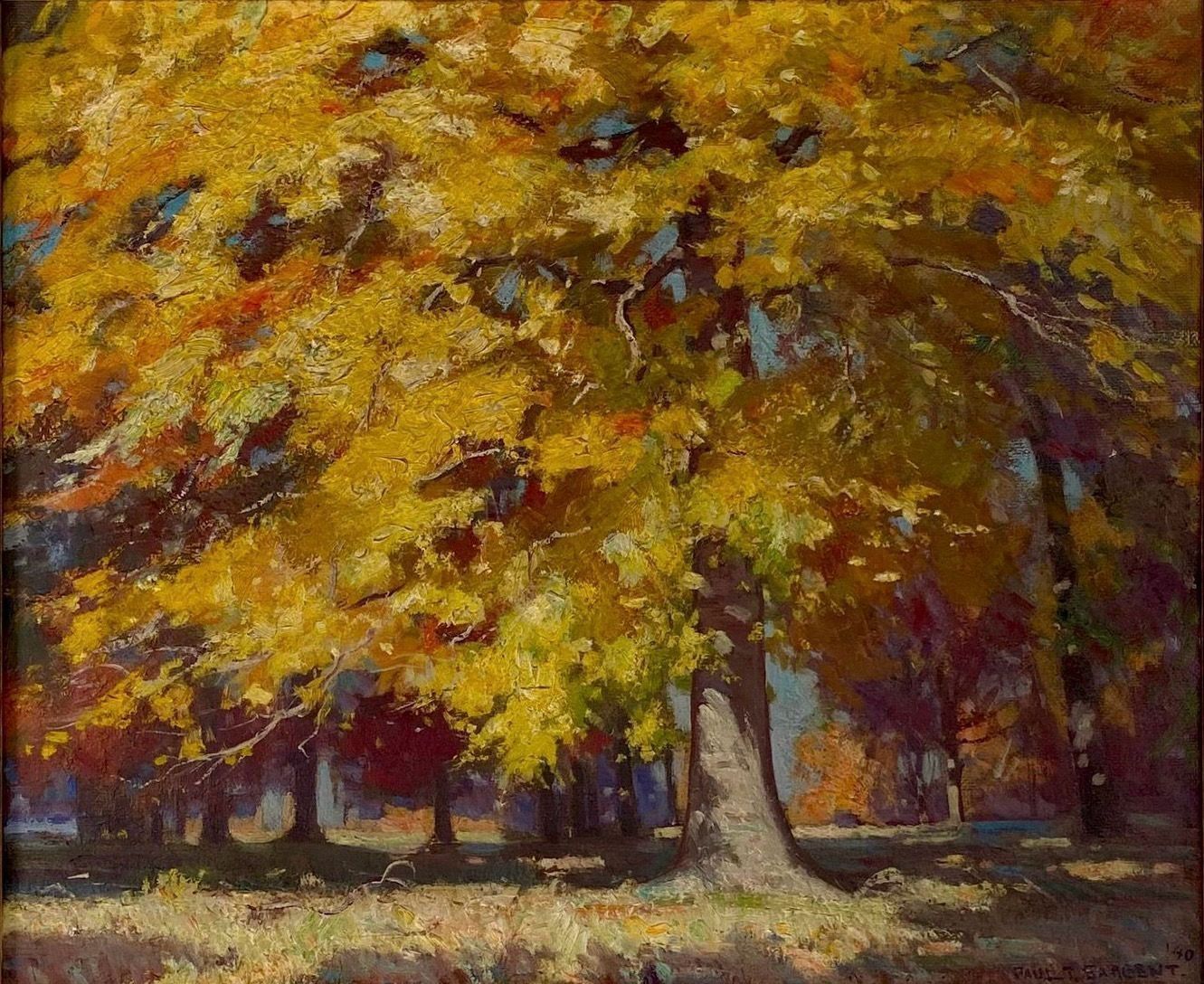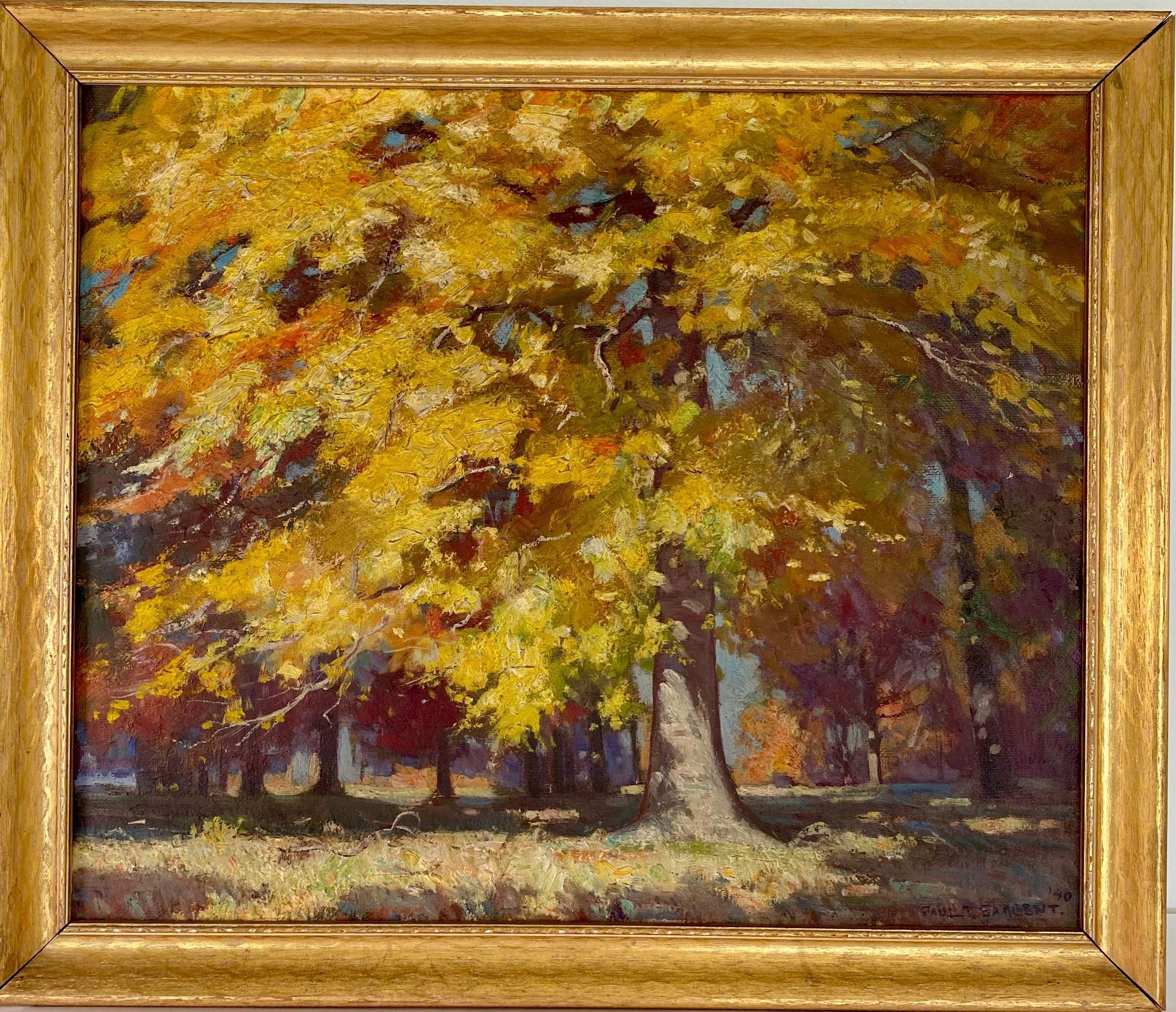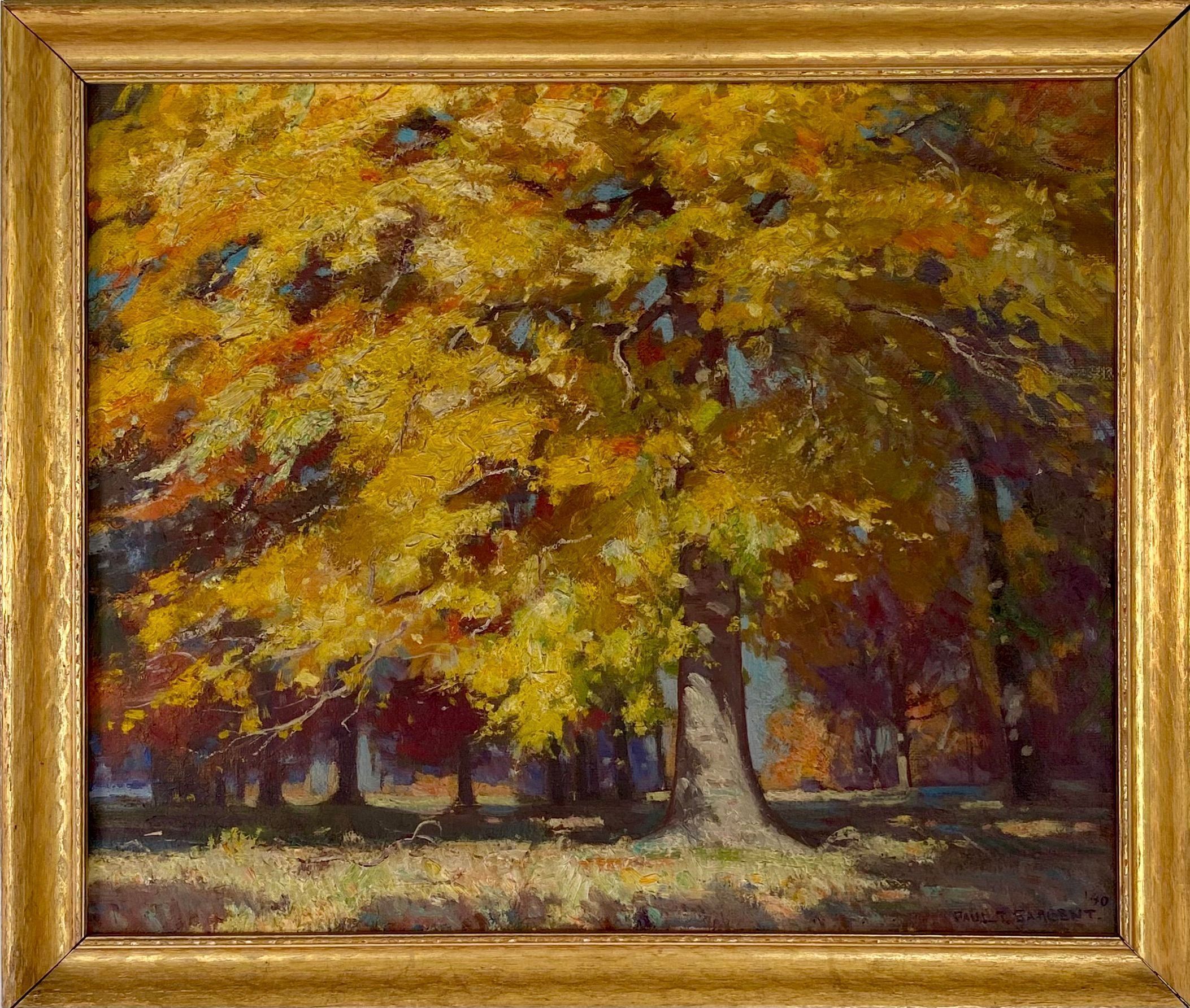 one main tree takes up foreground- orange green yellow signed Paul T. Sargent '40 lower right cornerCollection