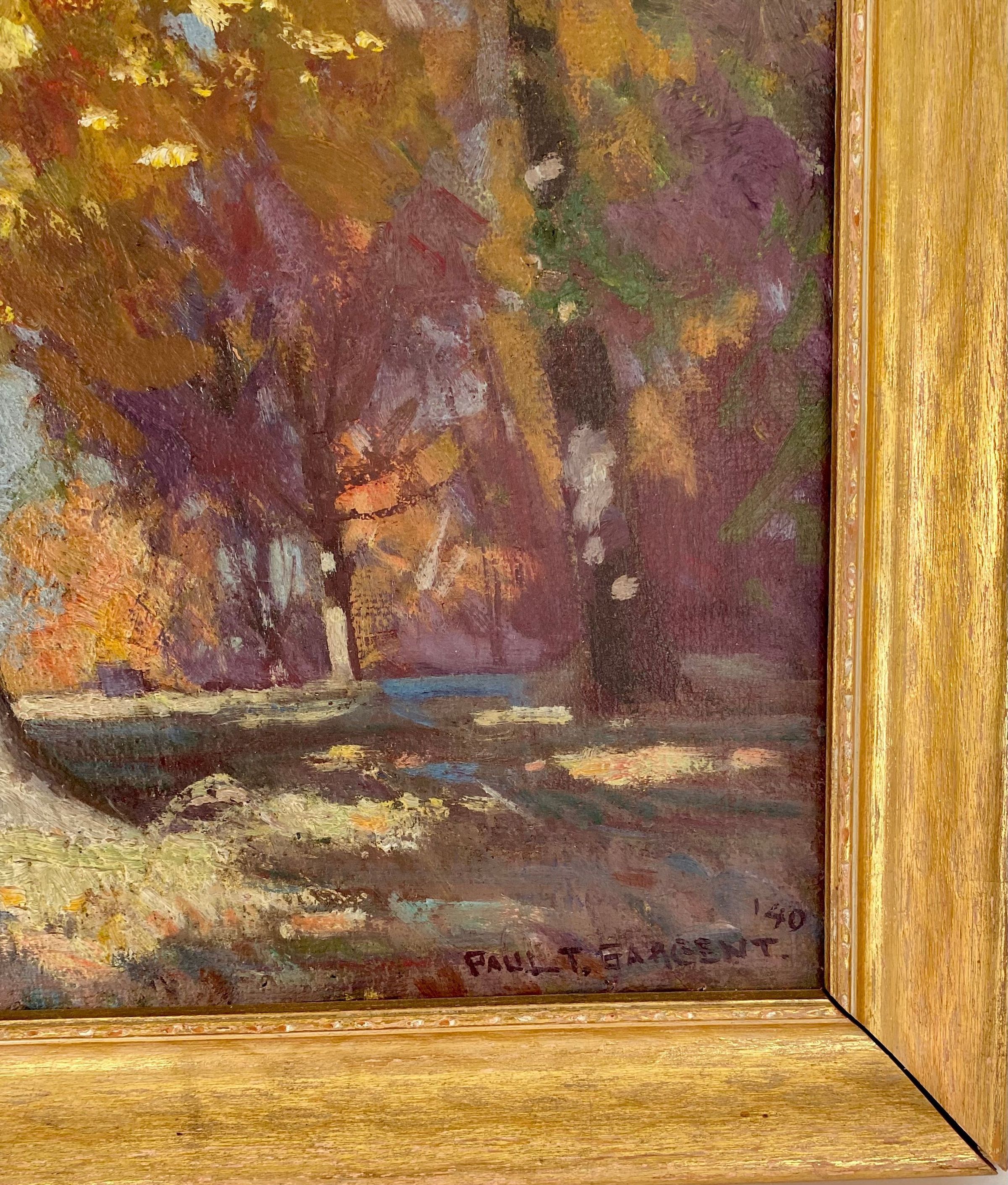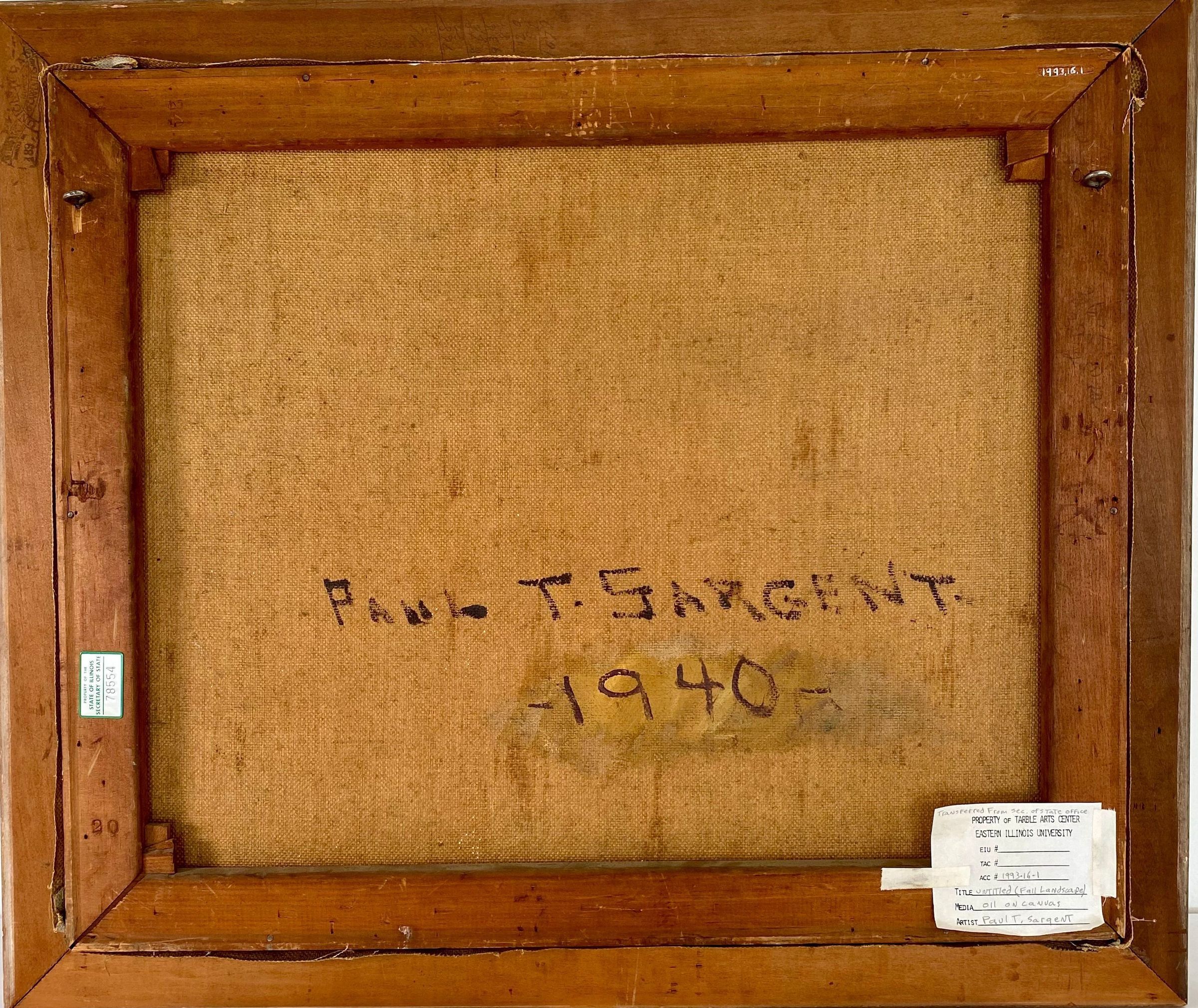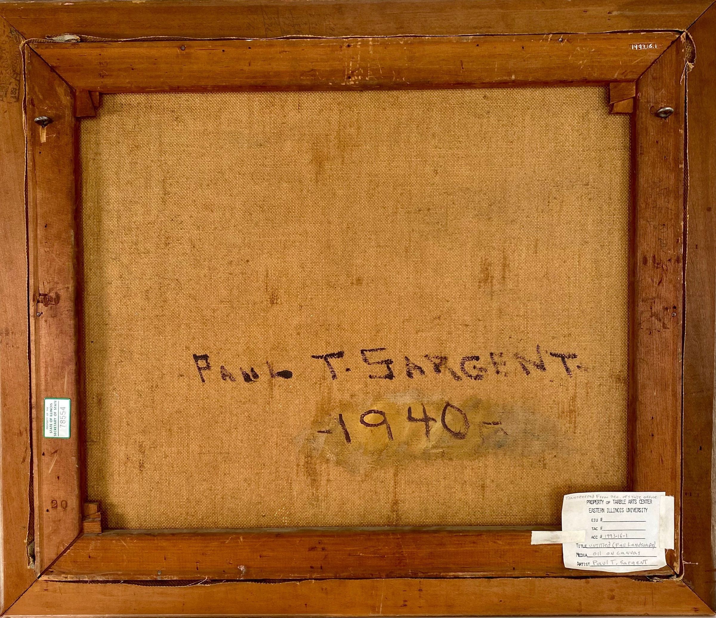 one main tree takes up foreground- orange green yellow signed Paul T. Sargent '40 lower right cornerCollection