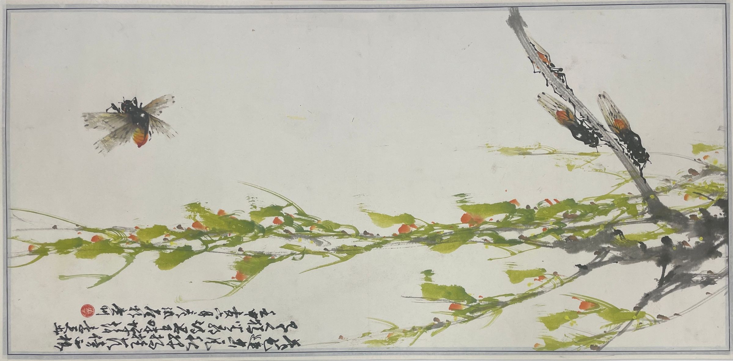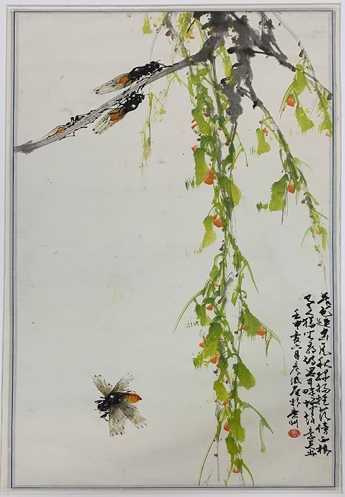 vertical format vines or leaves hanging vertically full length of picturetwo cicada's sitting on brach at upper portion one flying in lower portionwhite backgroundCollection
