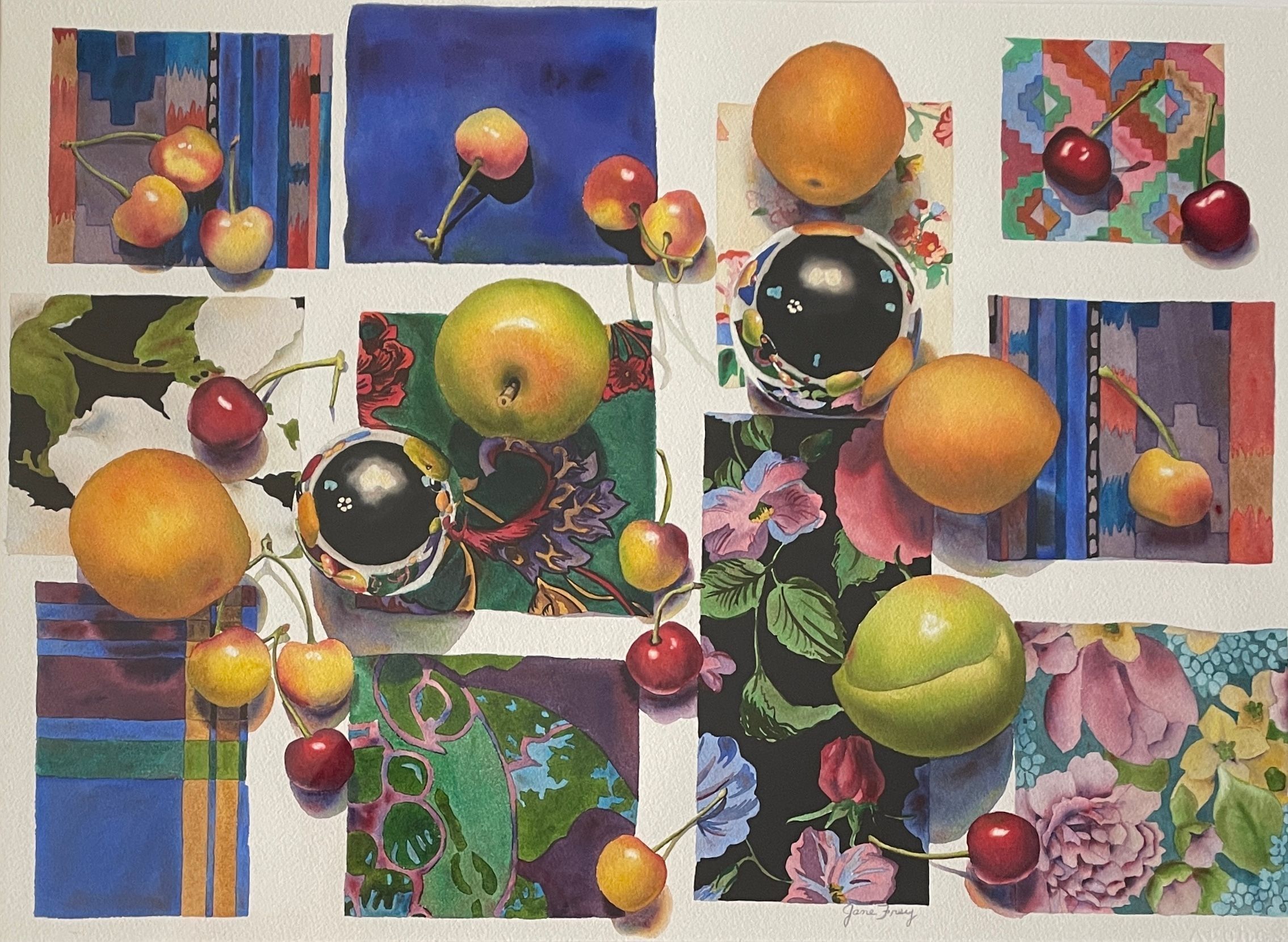 horizontal; still life with swatches of multicolored patterned material with fruit and reflective spheres laying on them(viewed from above); signed right center bottom Jane FreyCollection