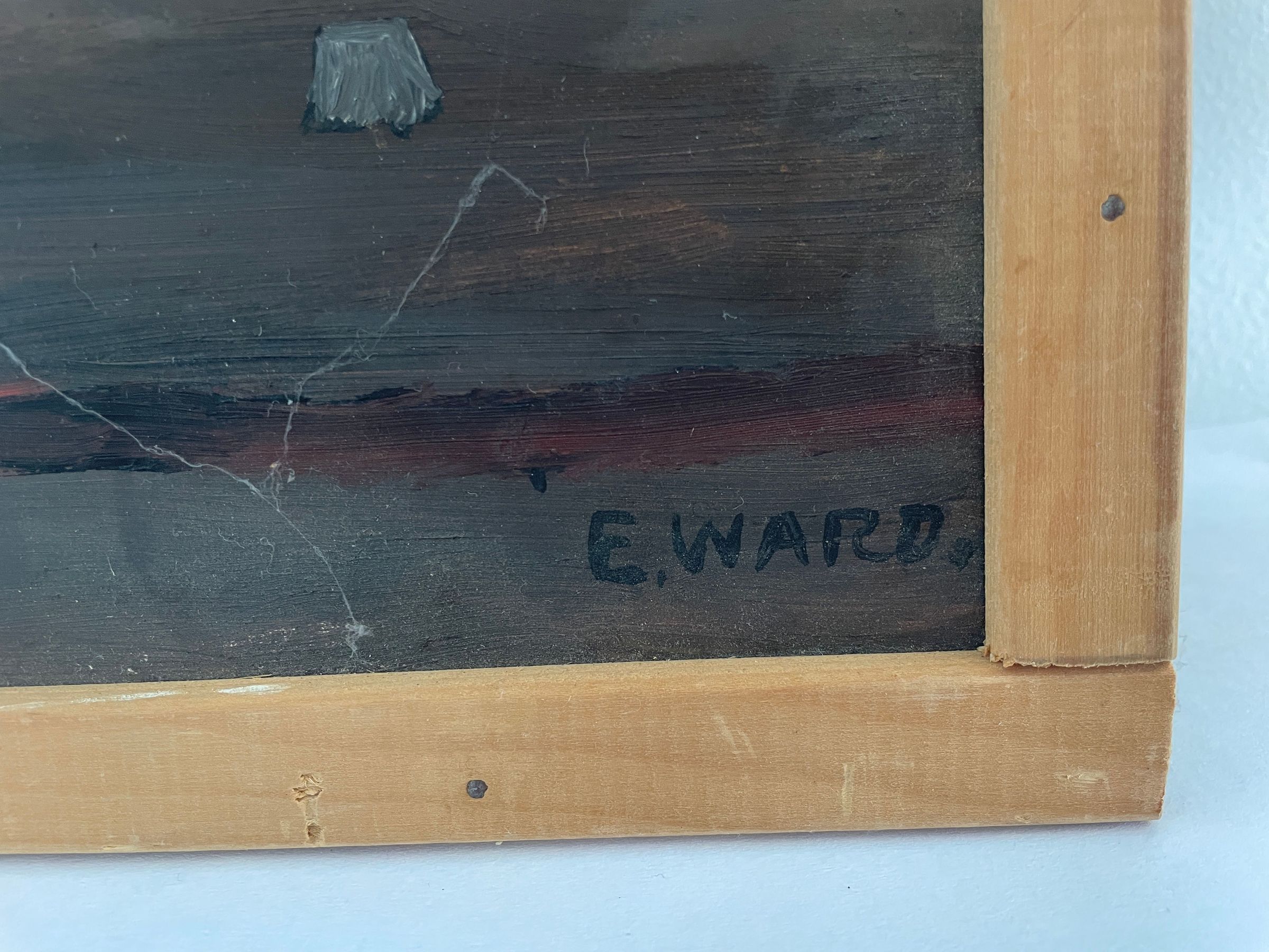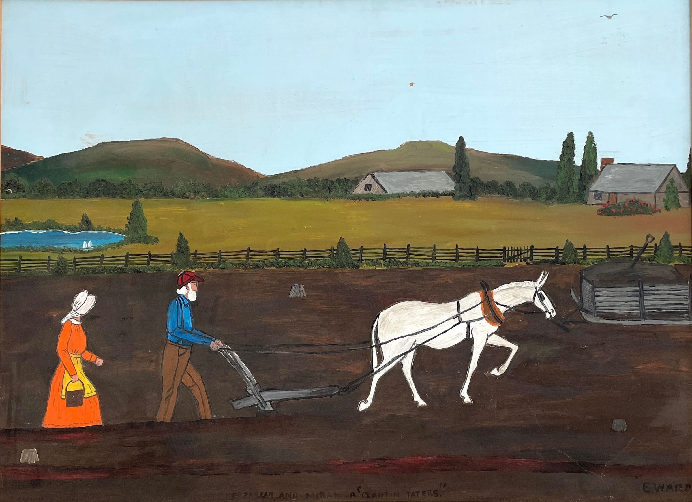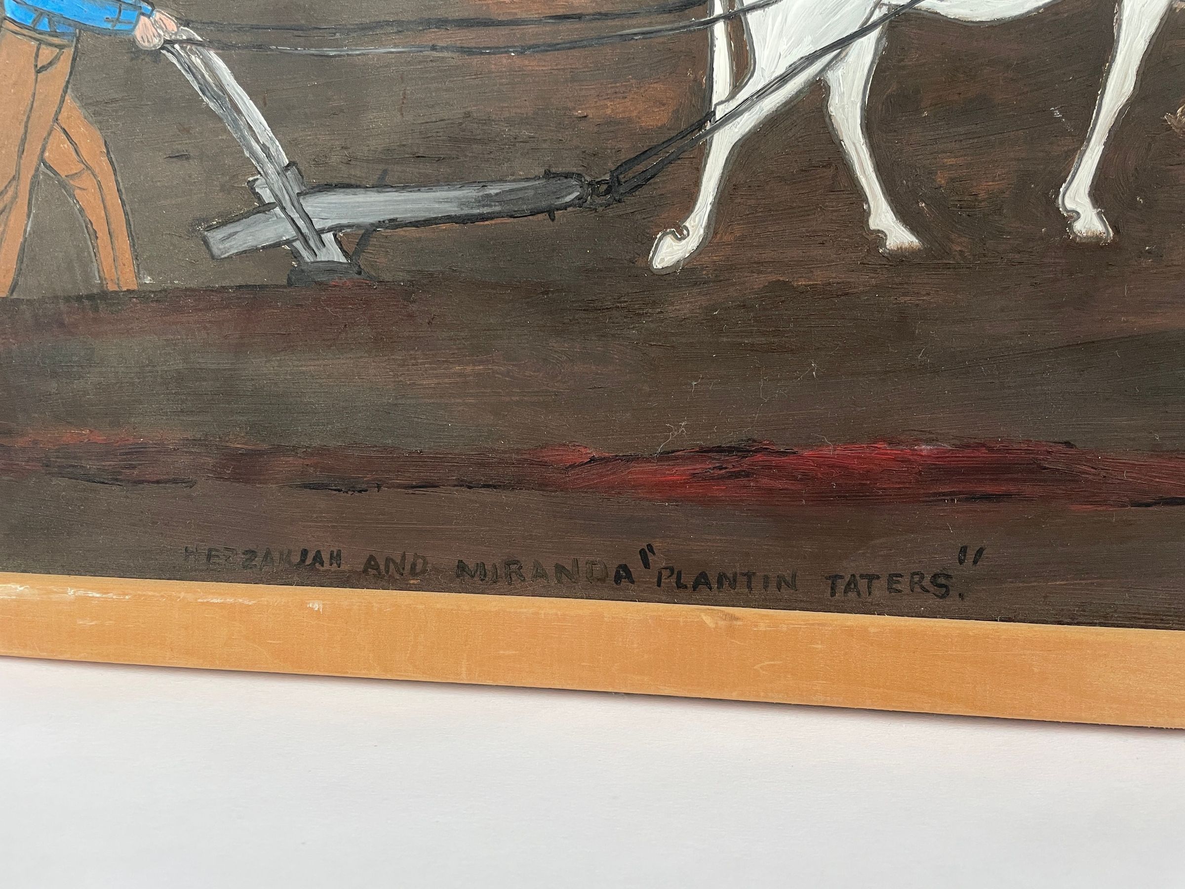 Grandma Moses of the Ozarks; man and woman plowing with a mule. Painted on masonite board, unfinished wood strips nailed to the masonite.Collection