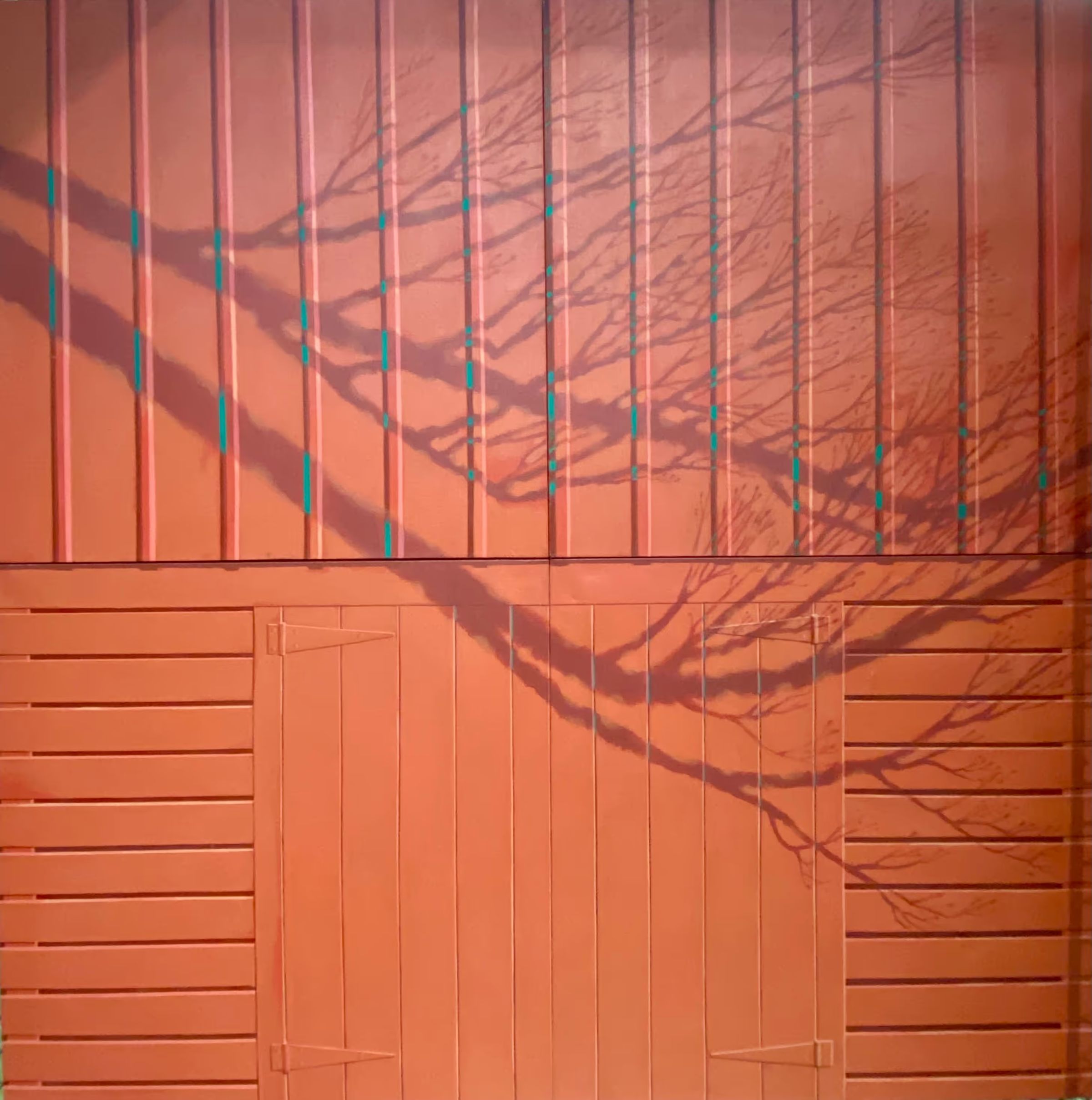 Painting of siding on red barn, 4 canvases each 40"x40" are bolted together. Shadow of tree limbs stretch across; signed "Harriet Rex-Smith 73" lower right.Collection