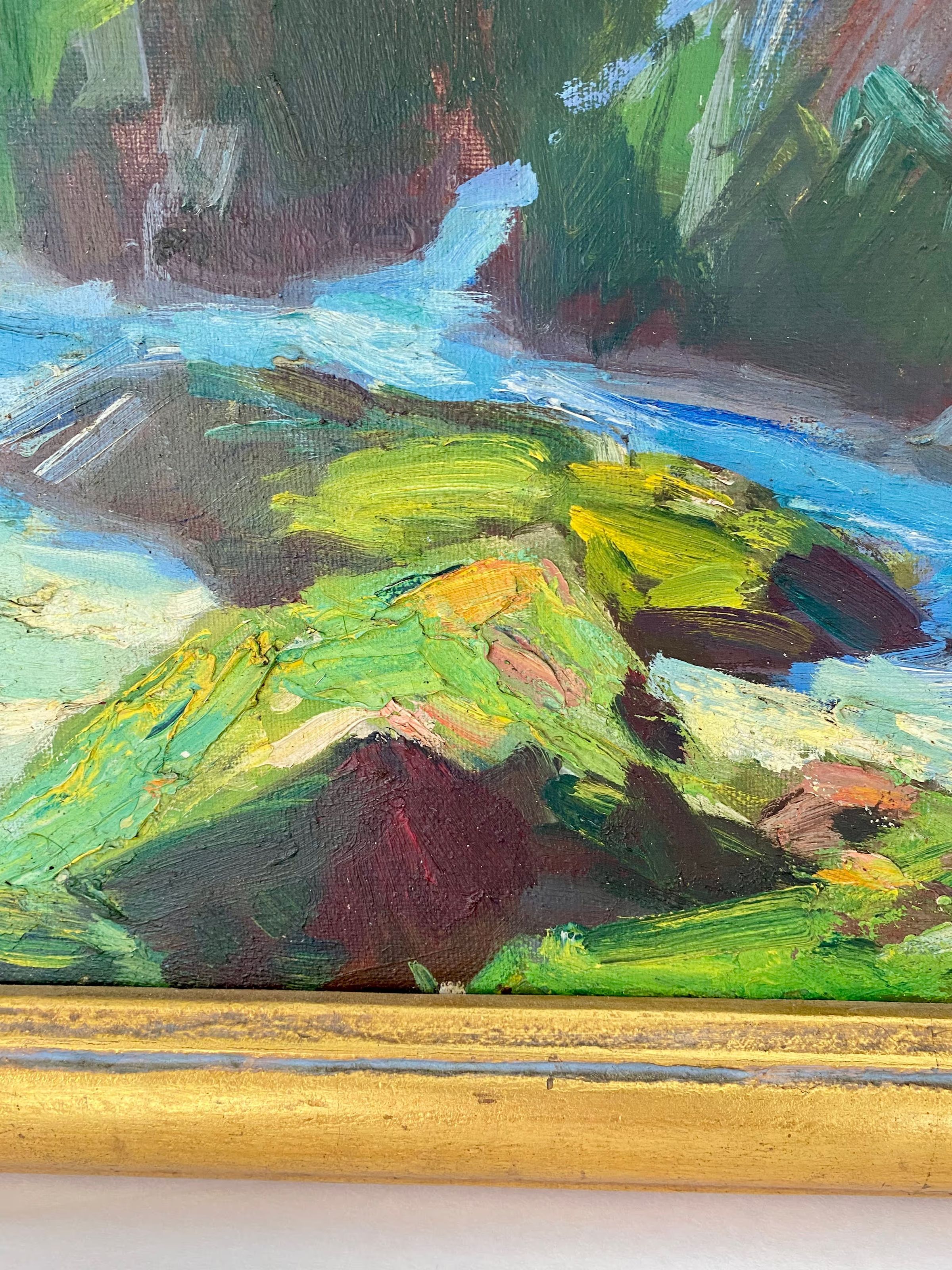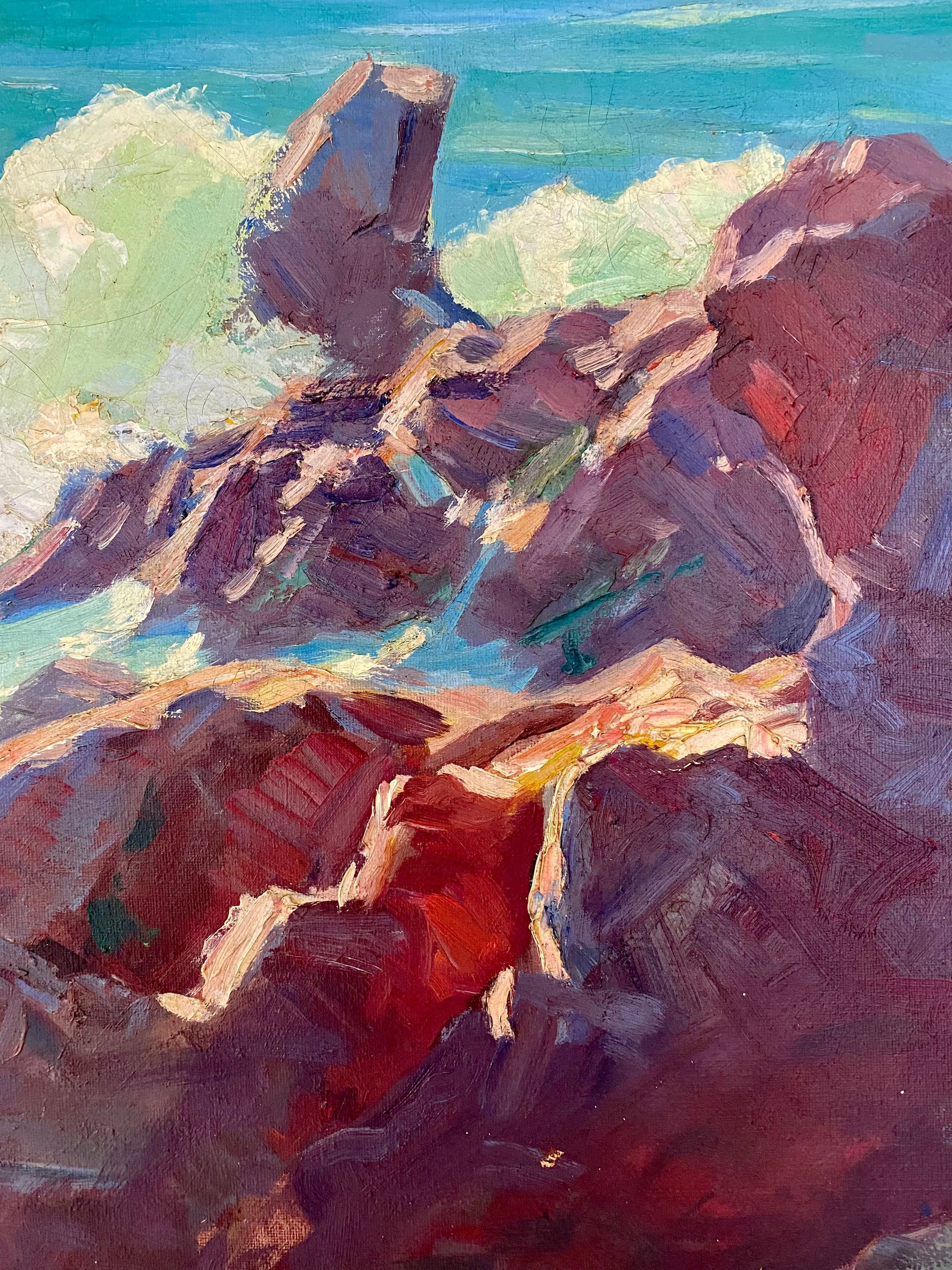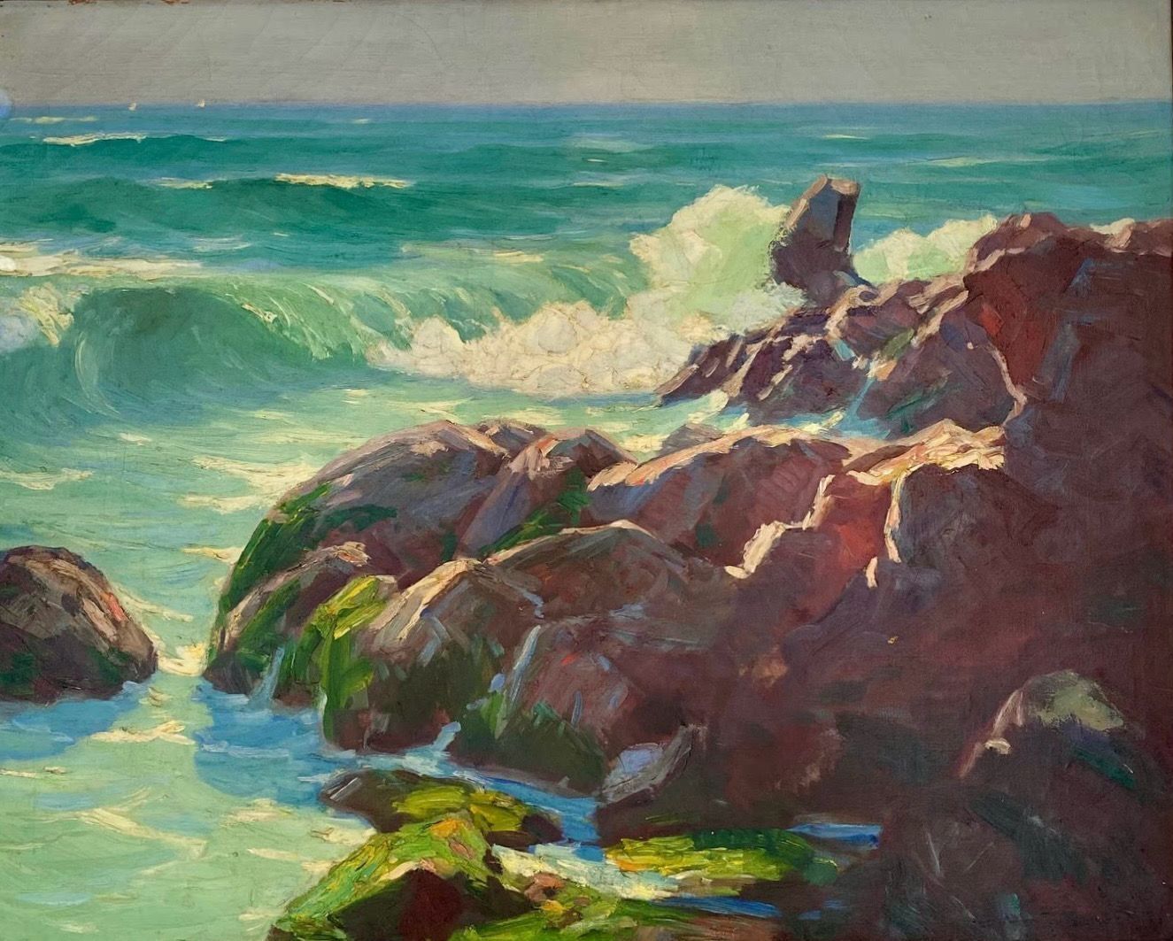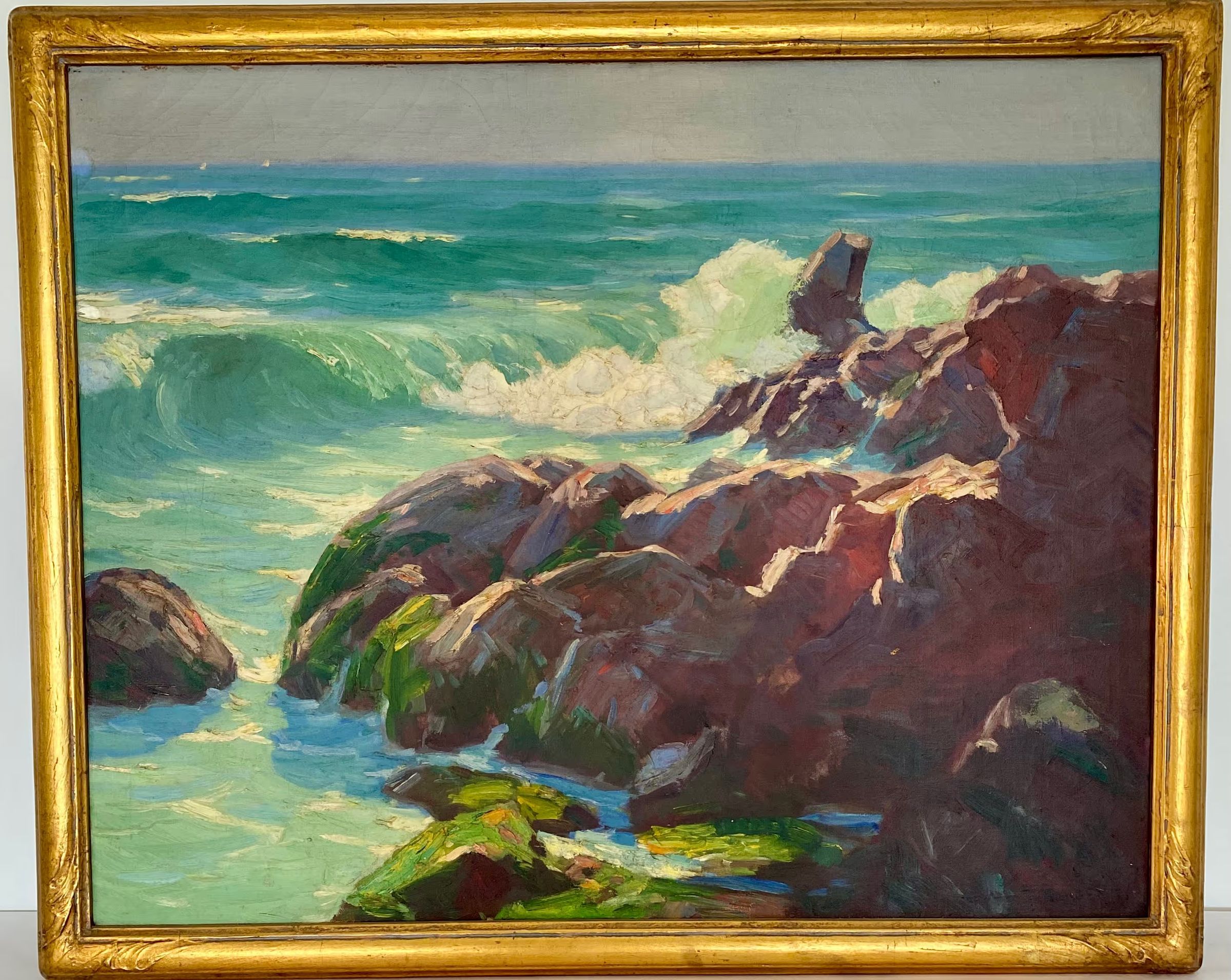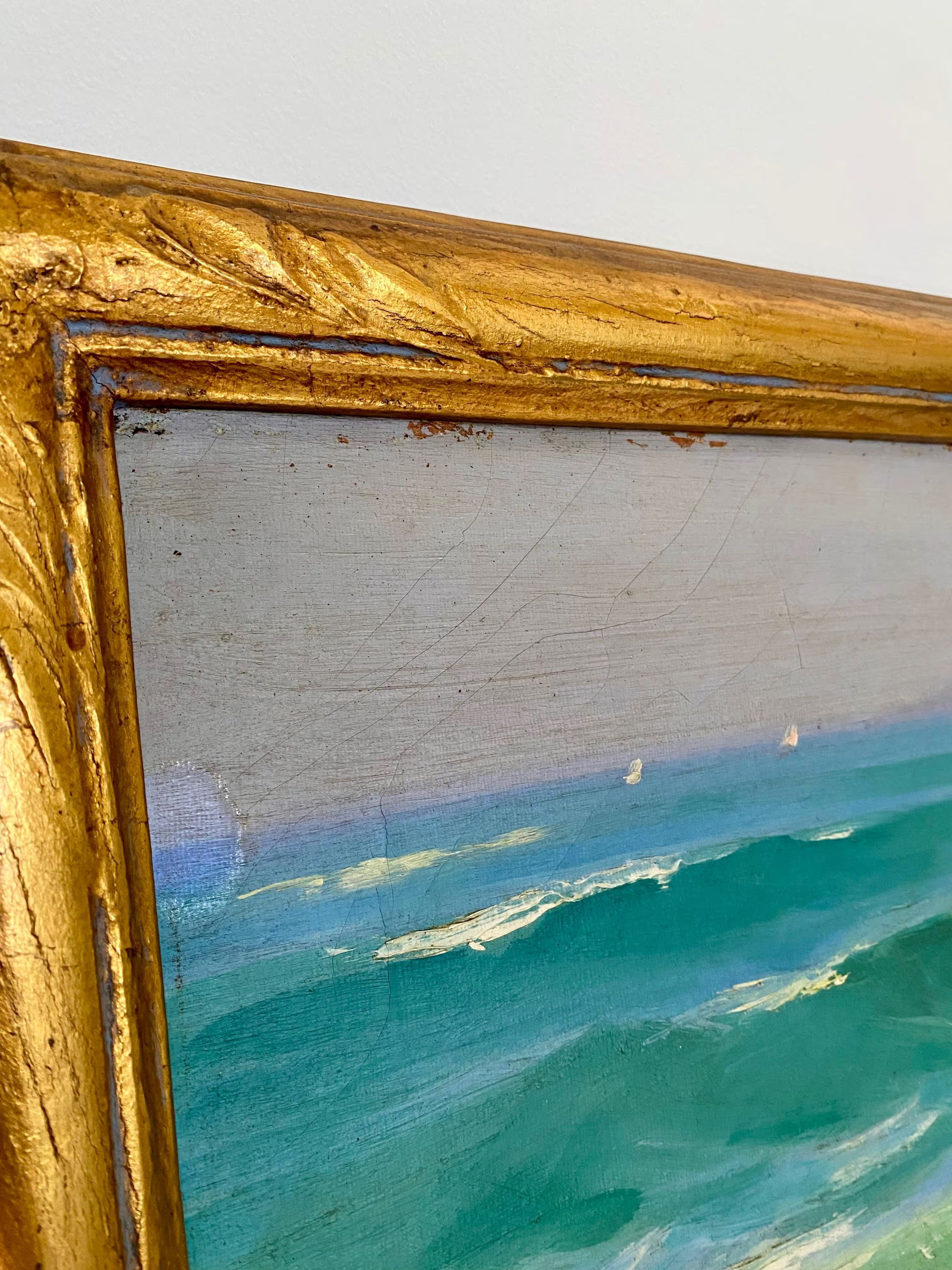 Ocean scene crashing upon a rocky shore, wood frame painted gold.Collection