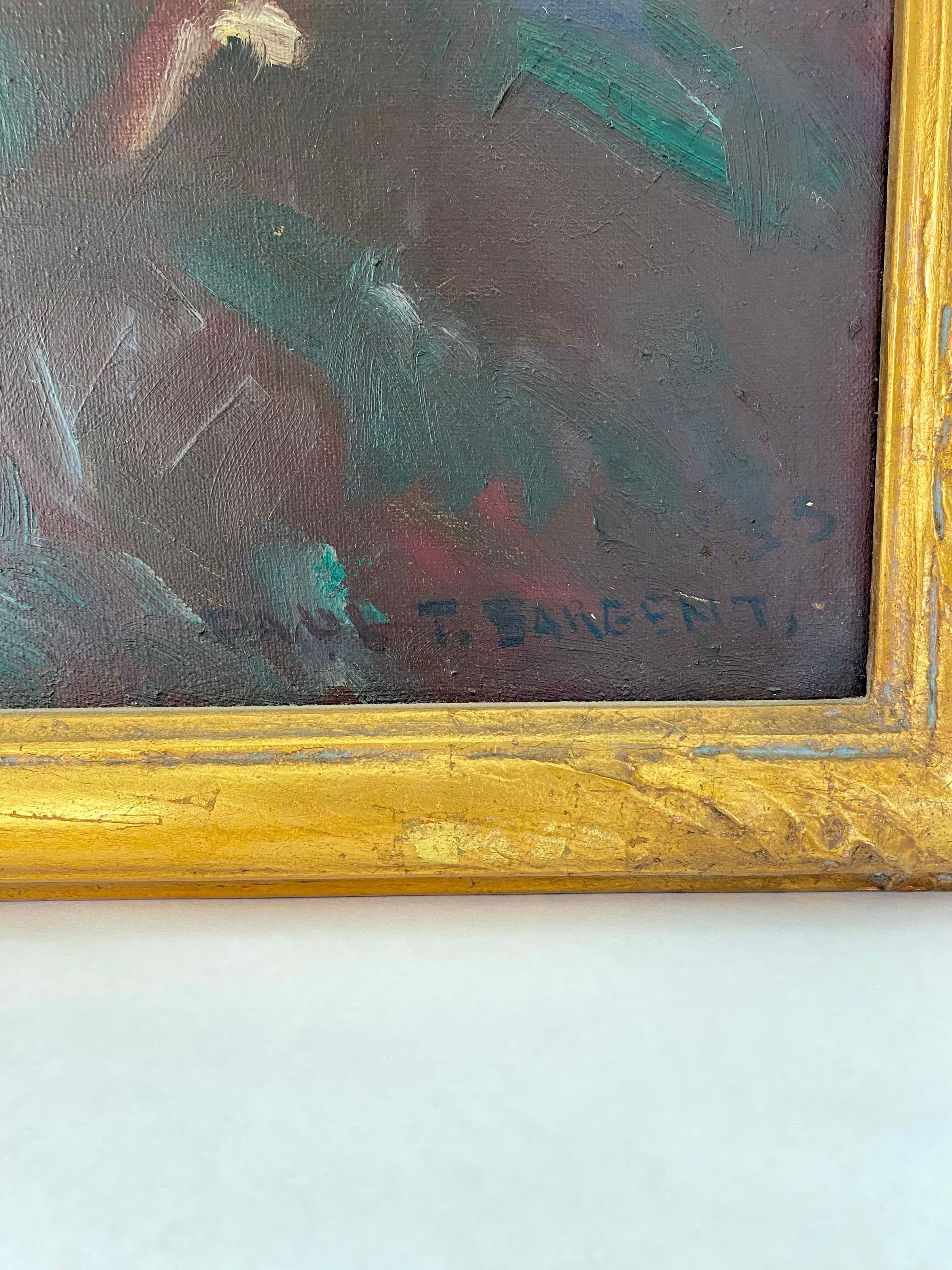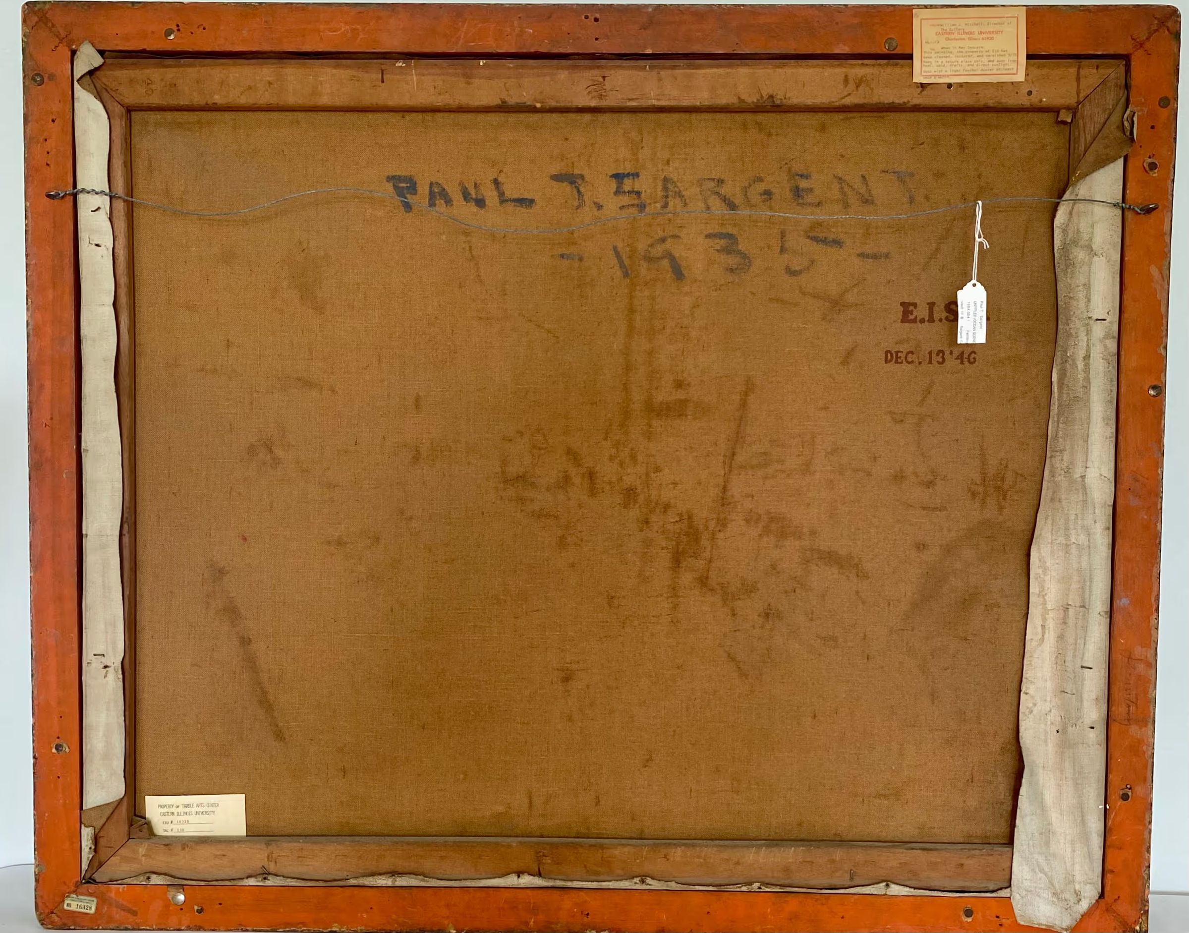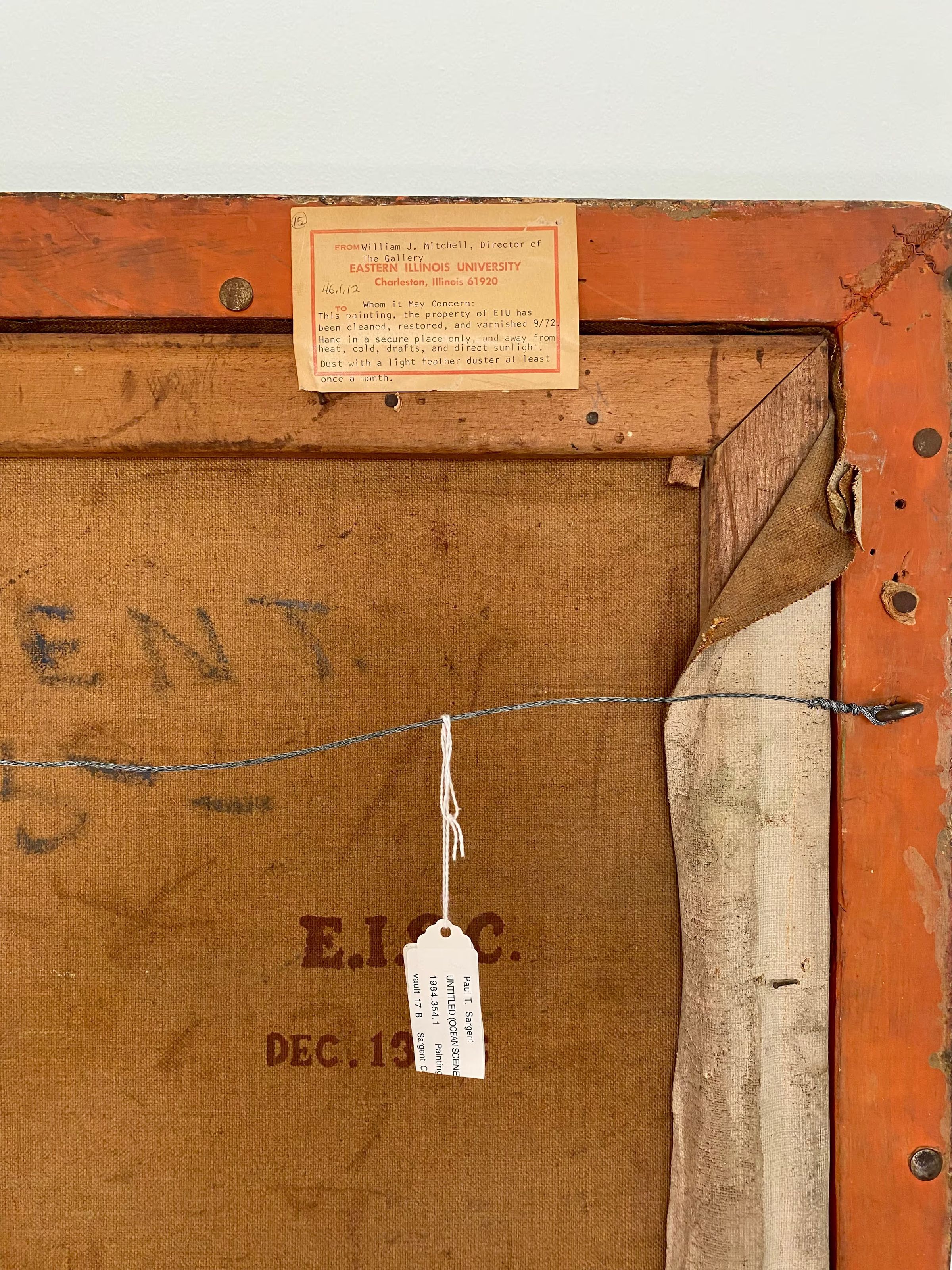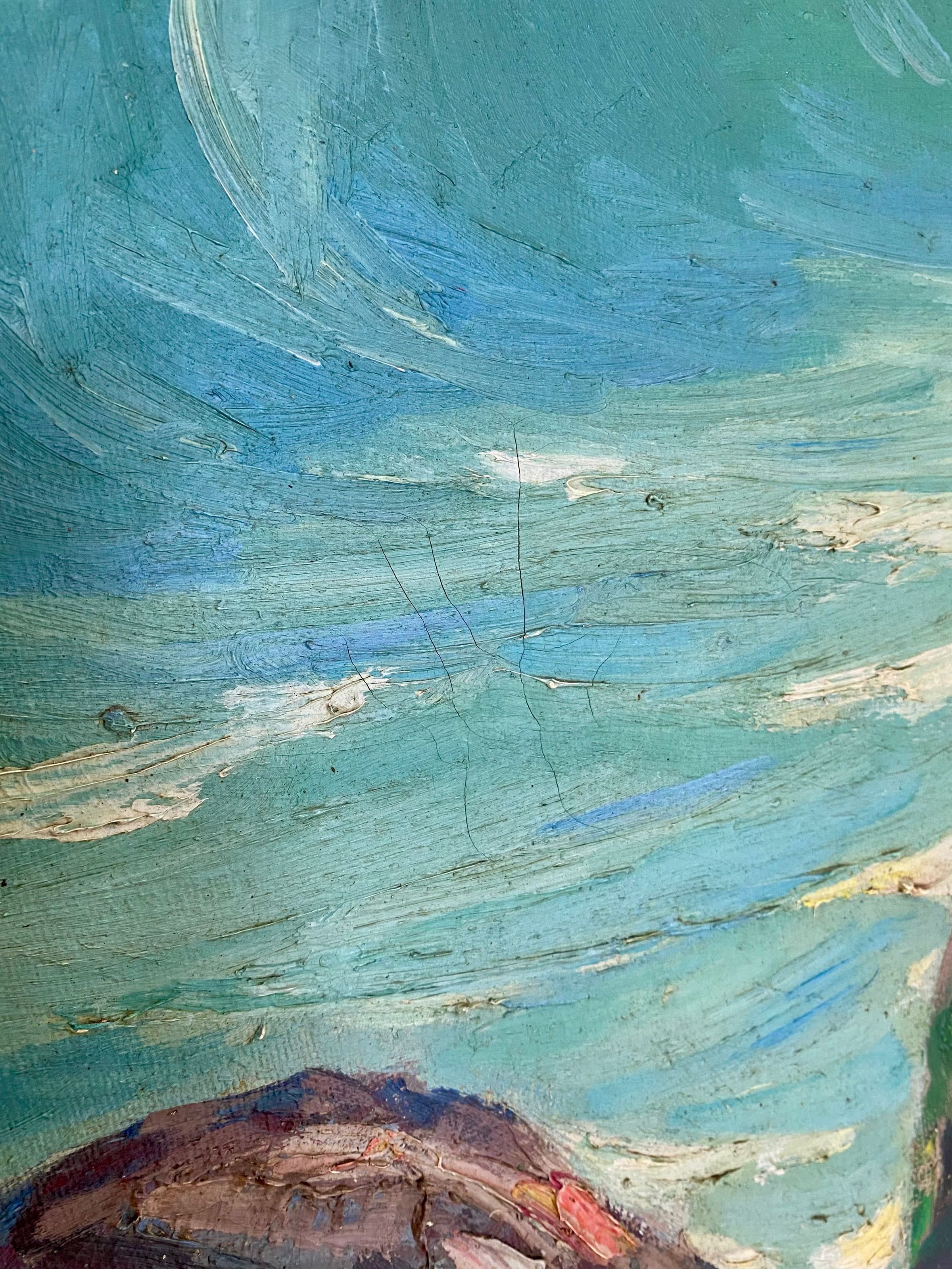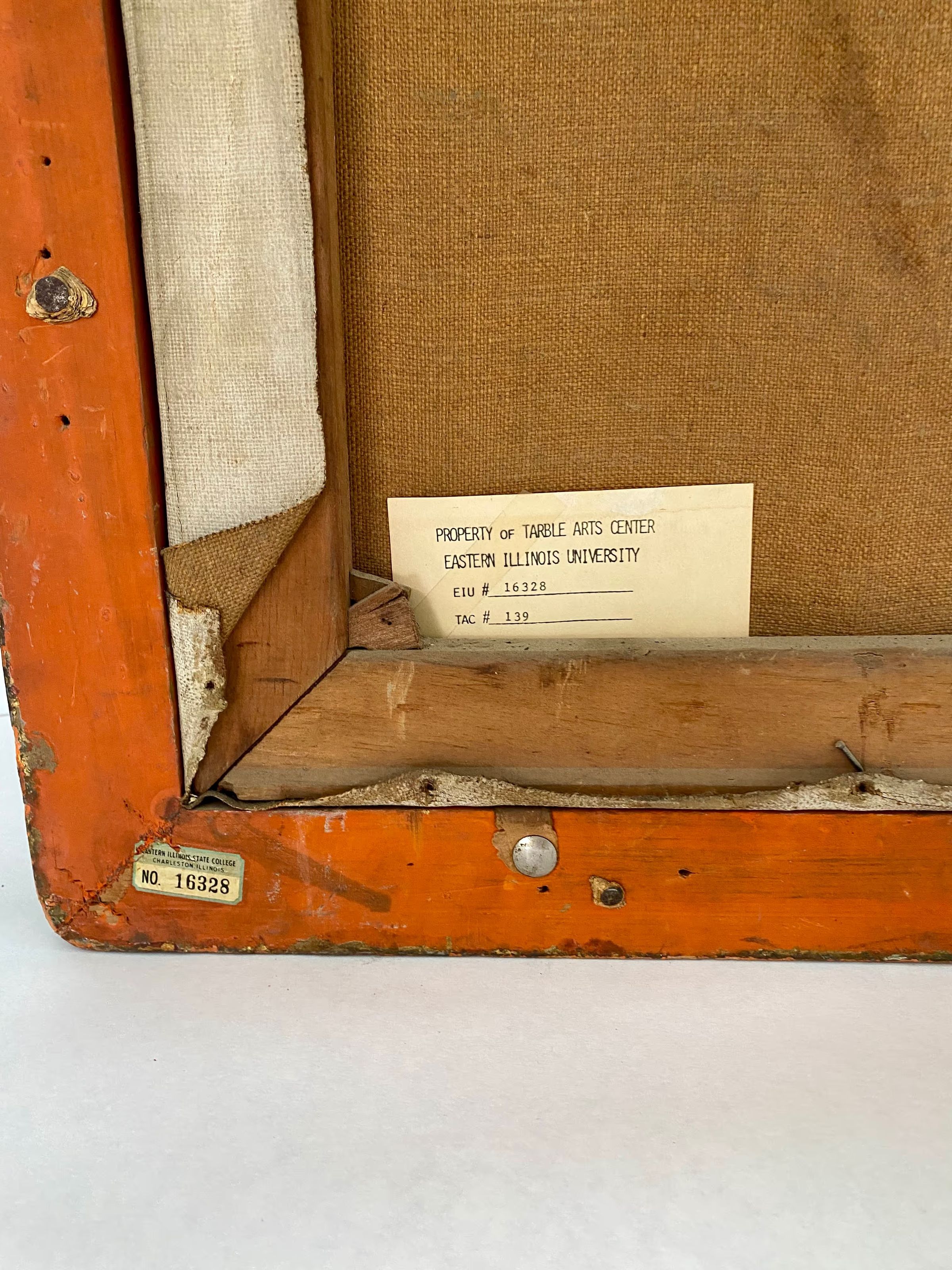 There is a small hole in this painting, it at first looks like a small dab of pink paint but upon closer inspection it is a hole that goes through the canvas.Created By