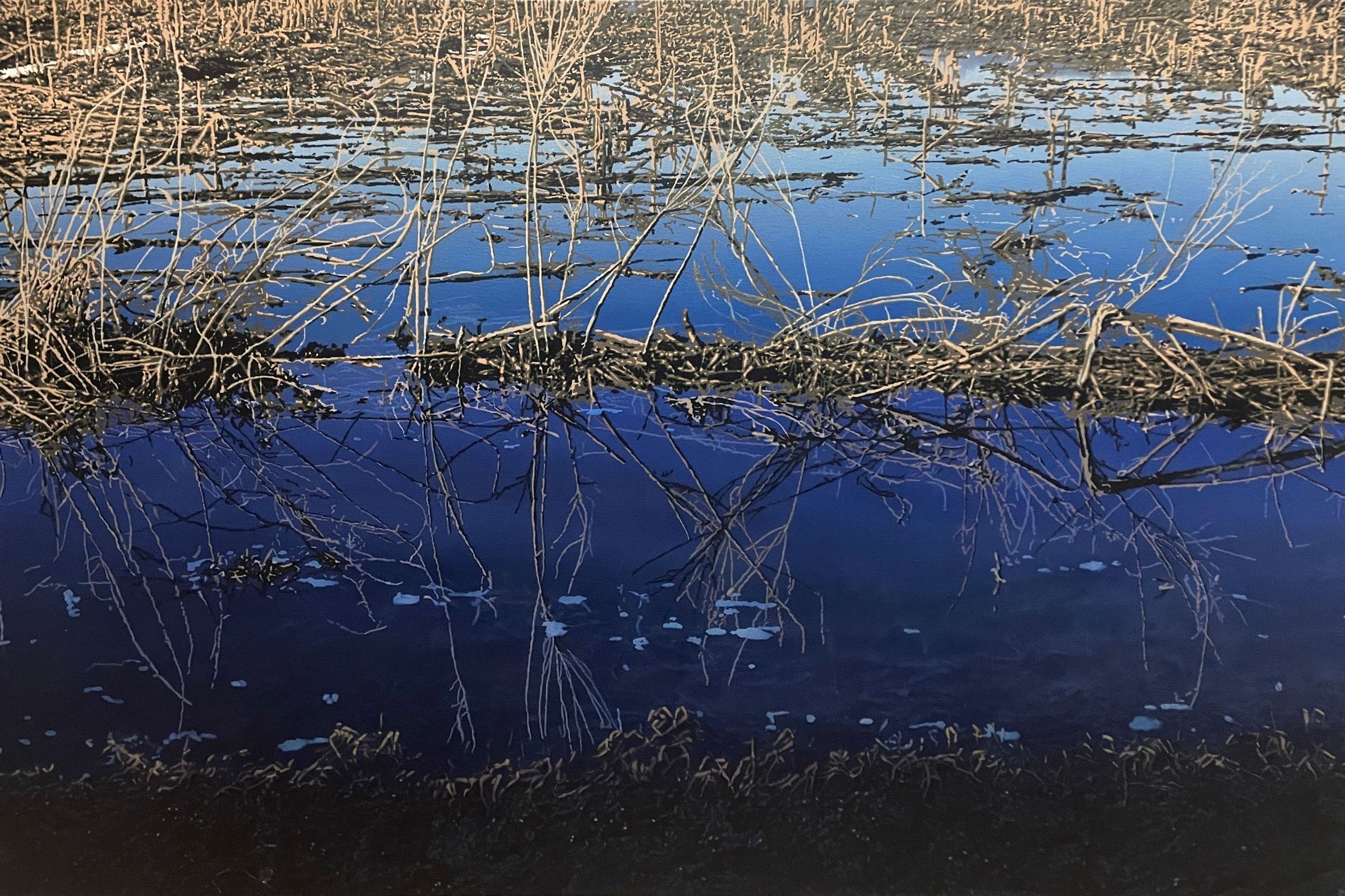 A farm field with standing water, foreground has deep blue water with small lighter blue floating patches, tan stalks begin at center of picture and recede into background, black accents around stalks. Chrome frame.Collection