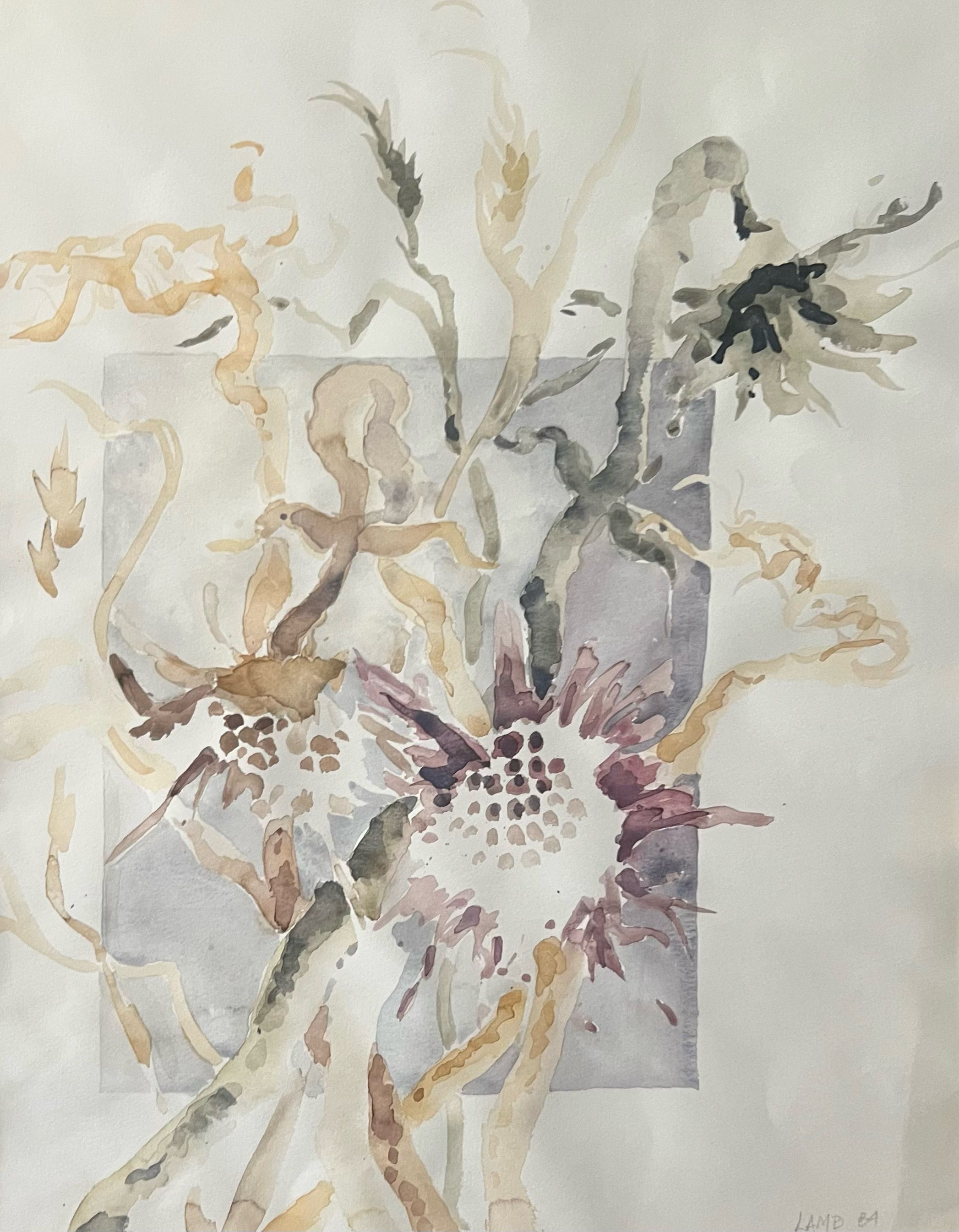 Sunflower painting with colors of brown, green and purple. Matted in white background with brown frame.Acquisition