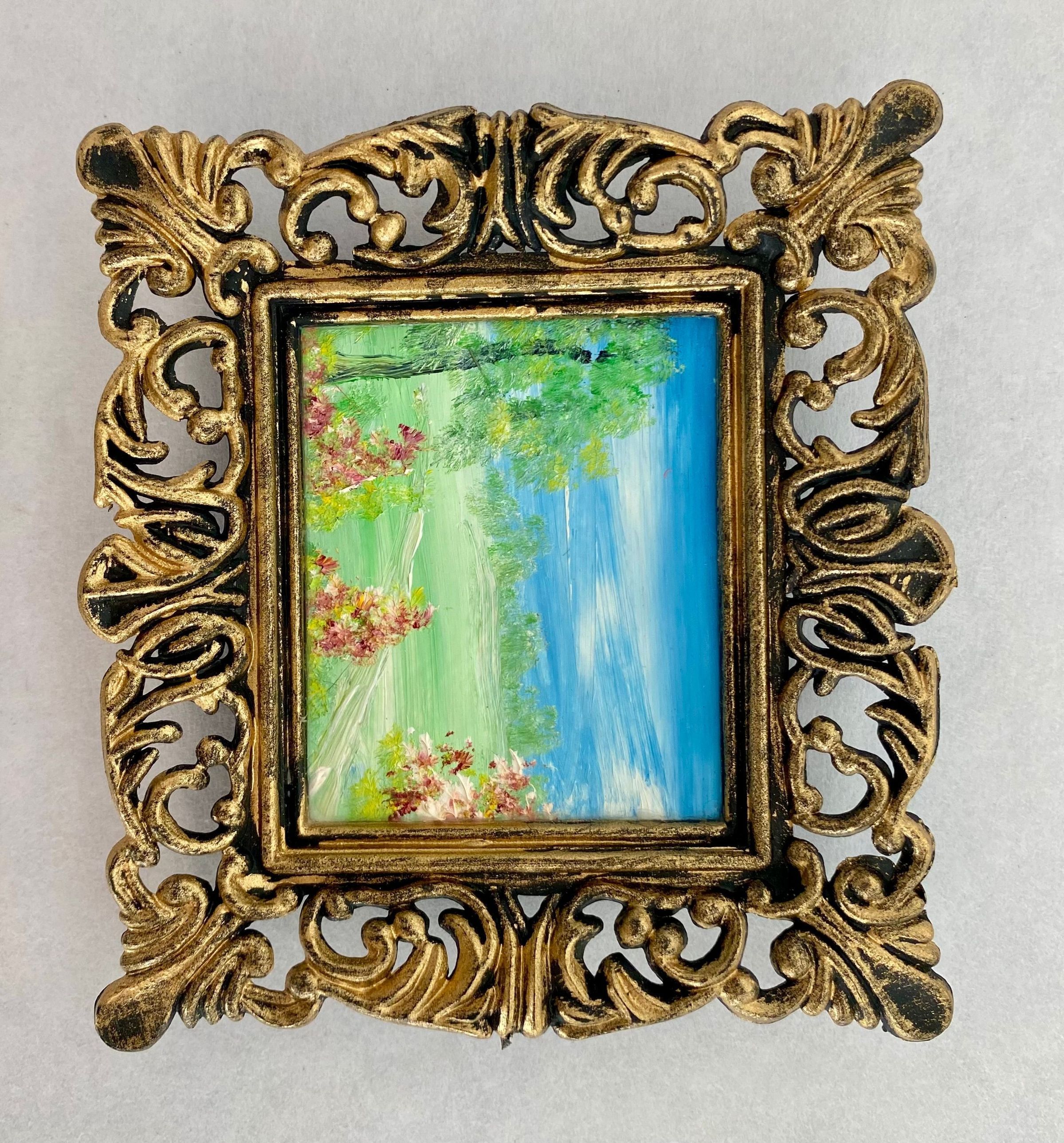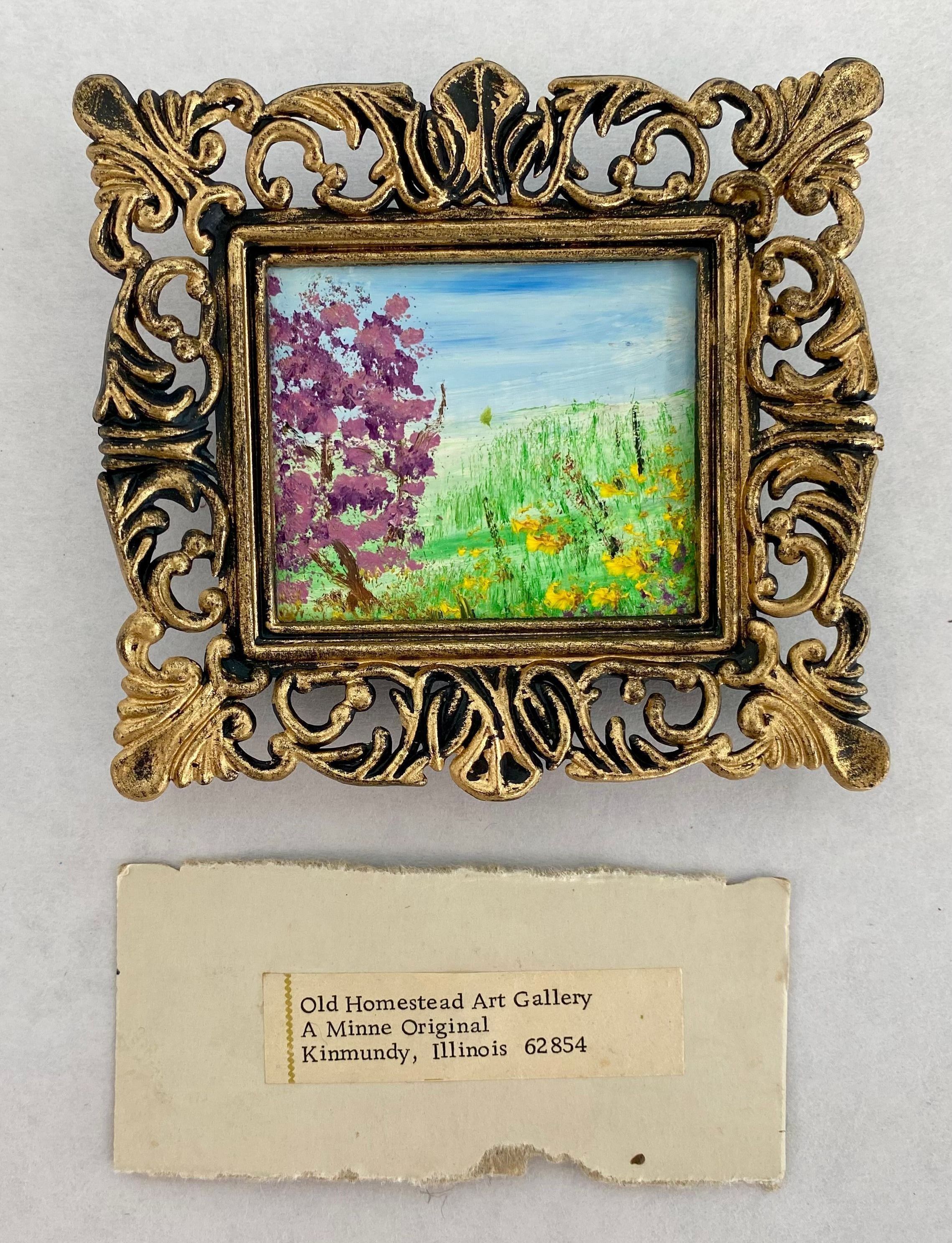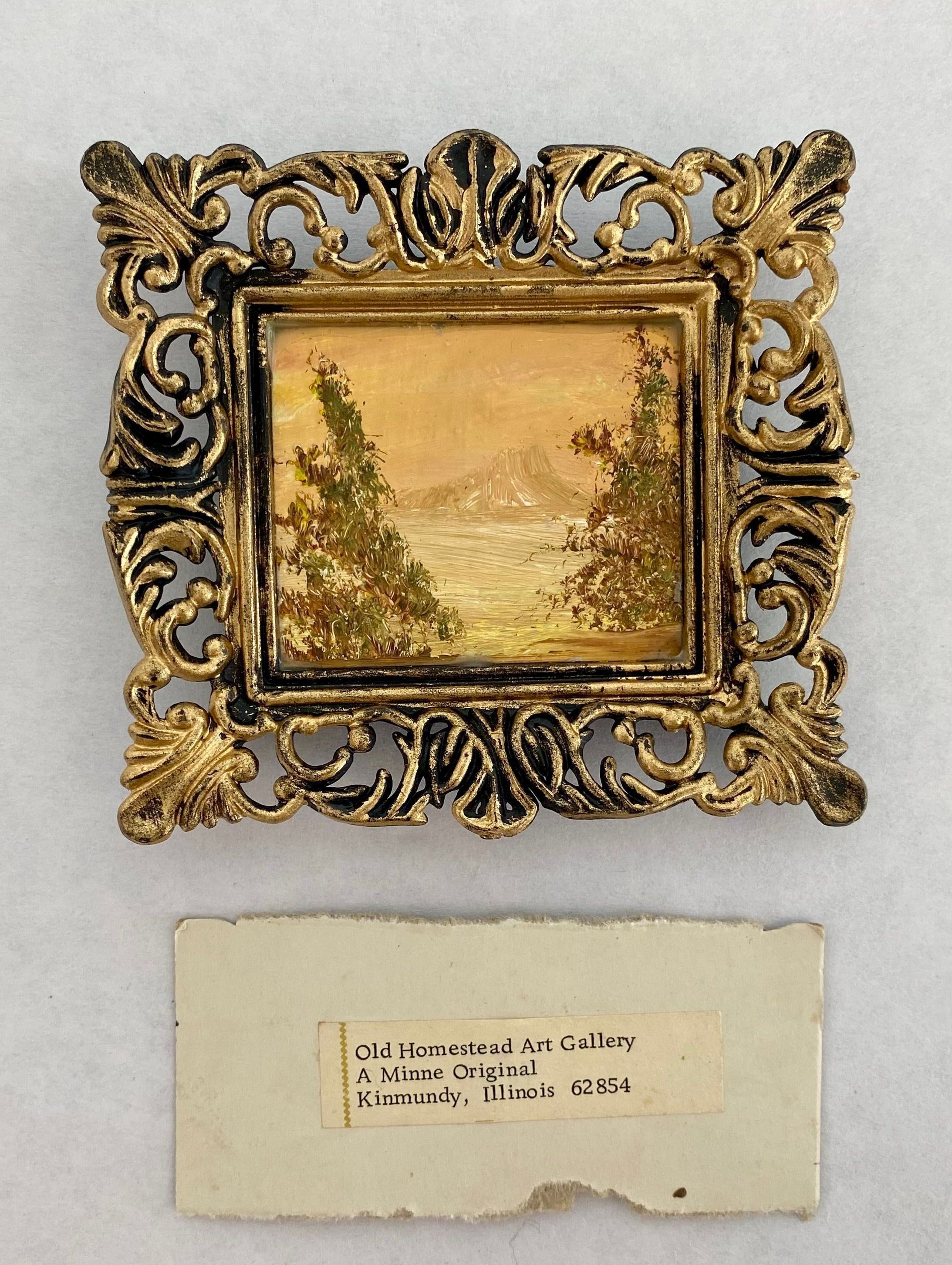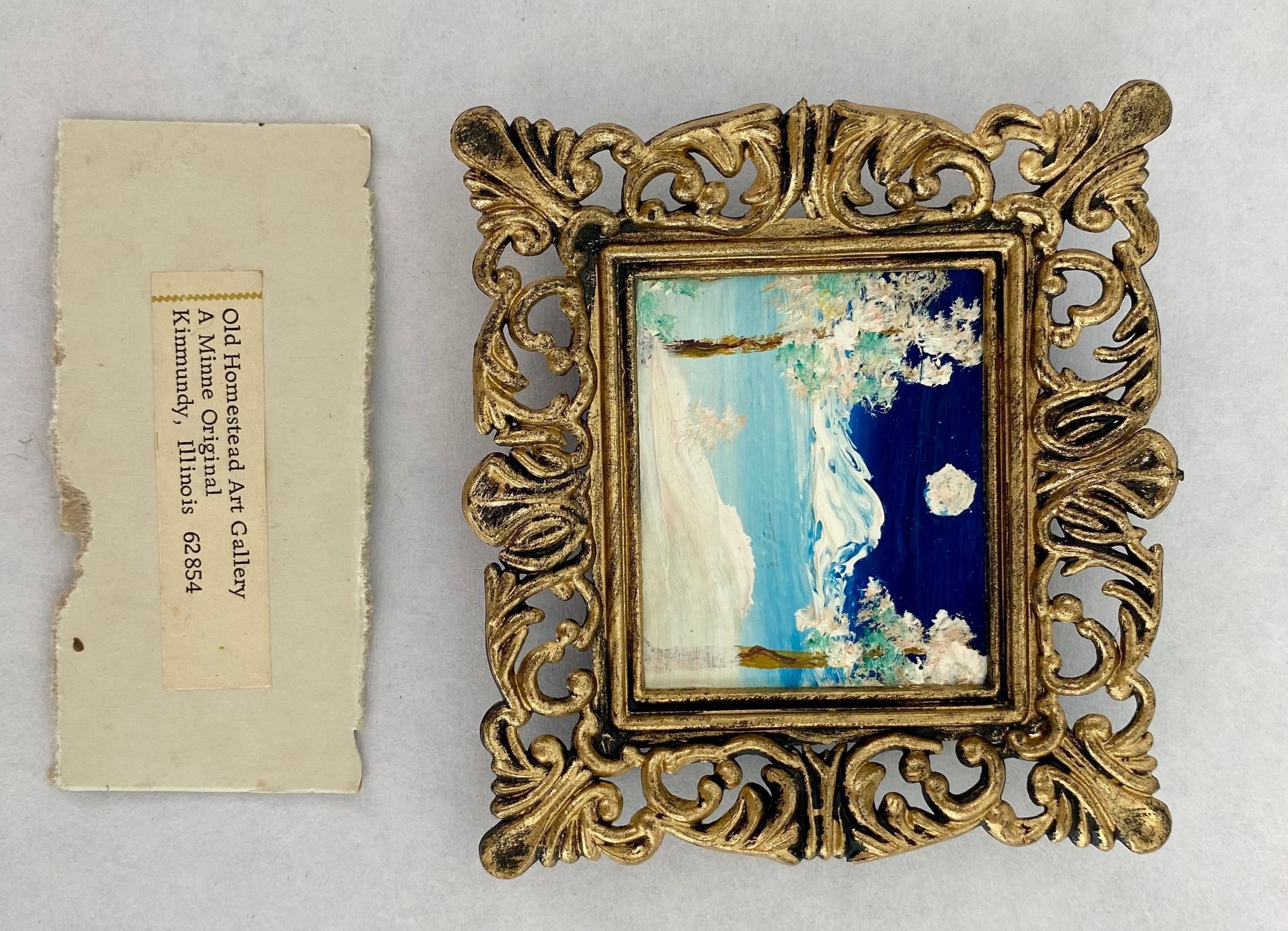 Eight tiny landscapes paintings depicting the four season; Framed in ornate gold plastic with black backing.Collection