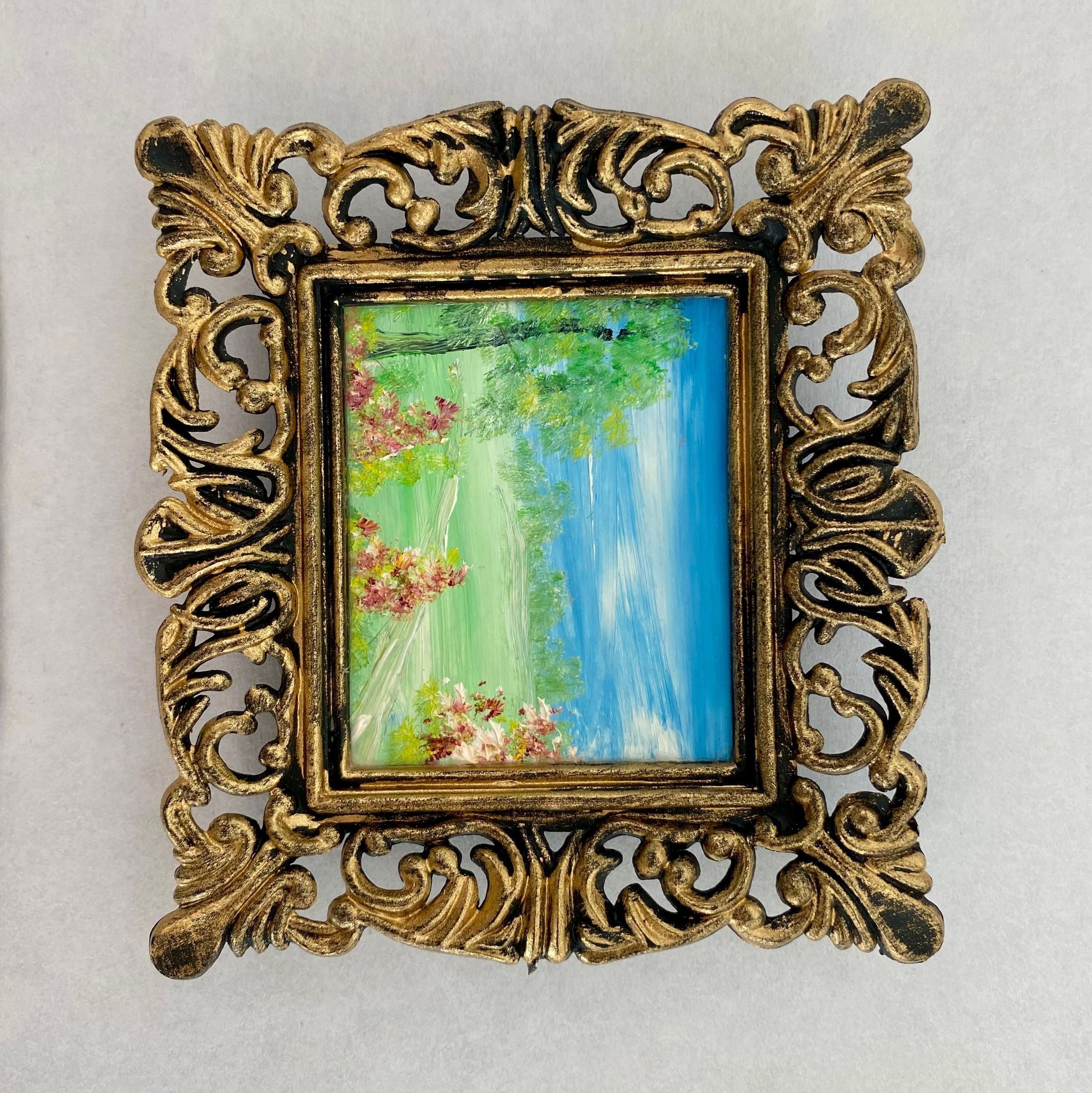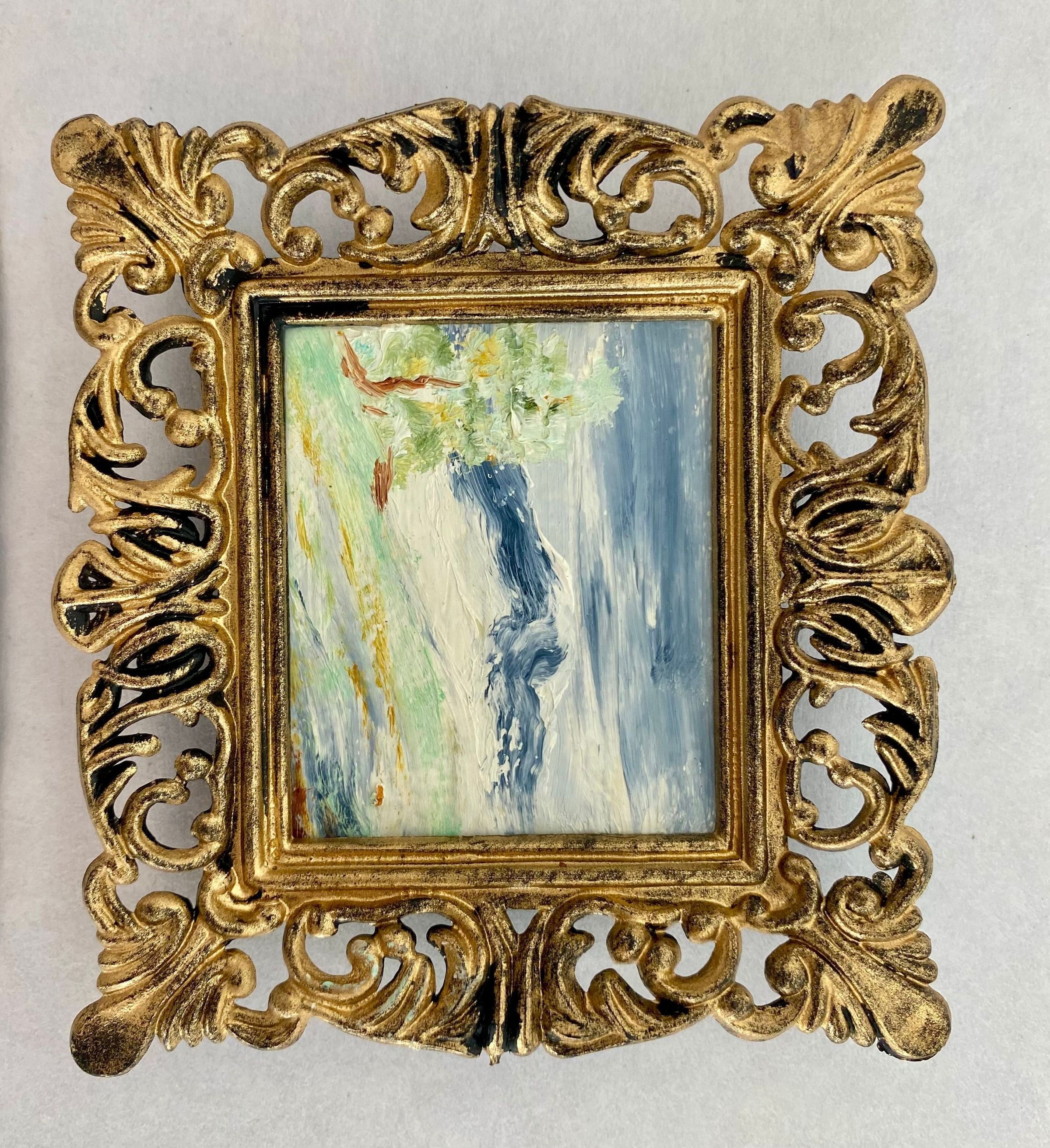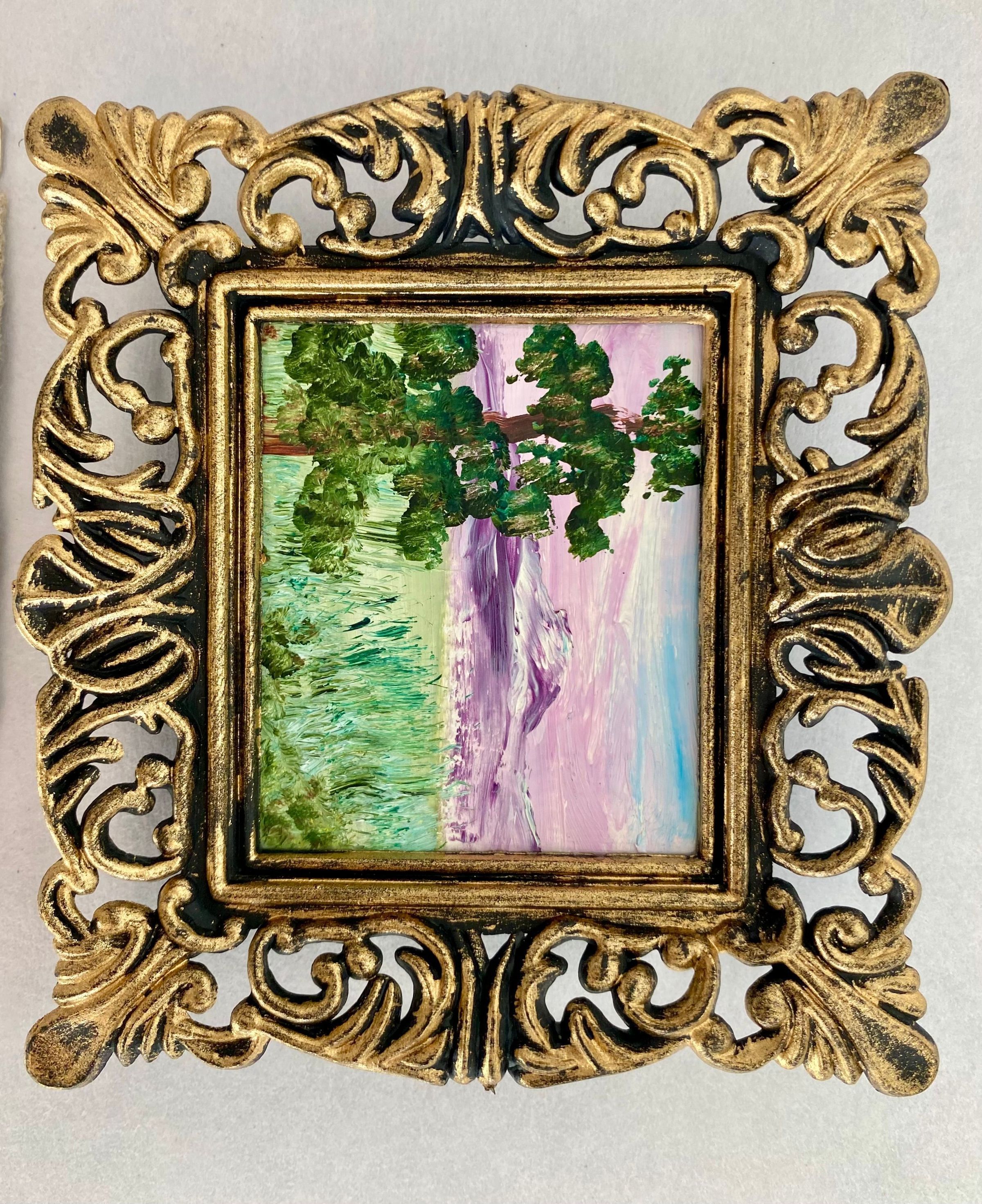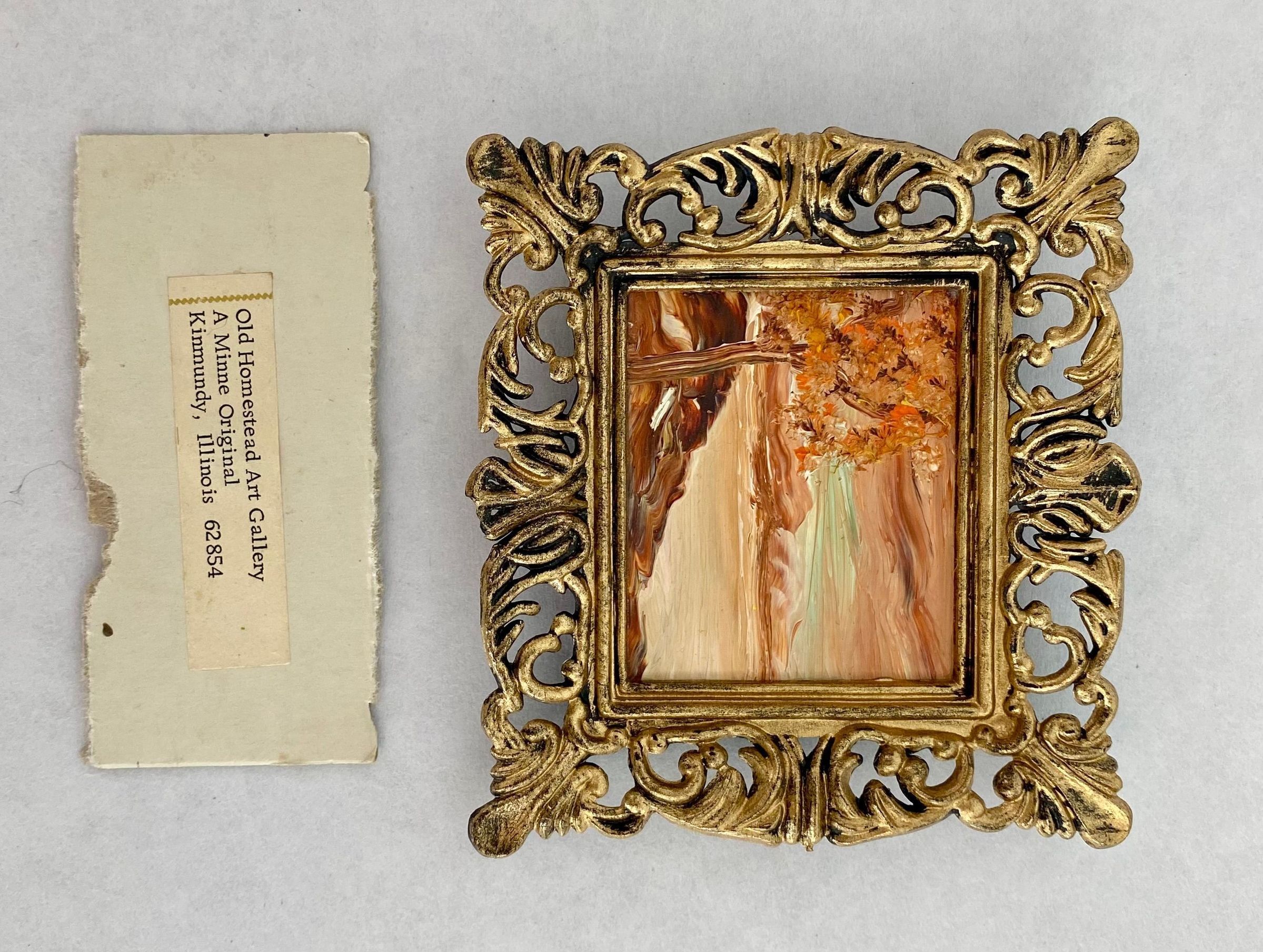 Eight tiny landscapes paintings depicting the four season; Framed in ornate gold plastic with black backing.Collection